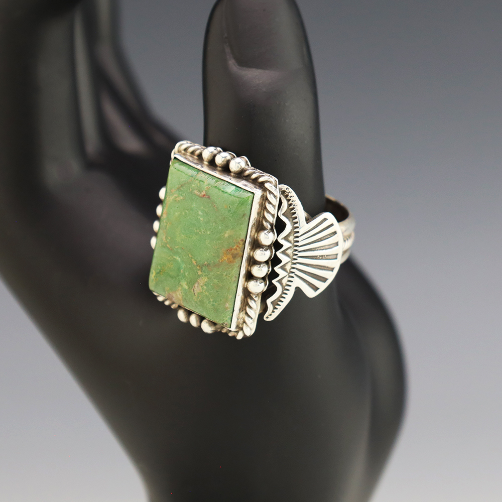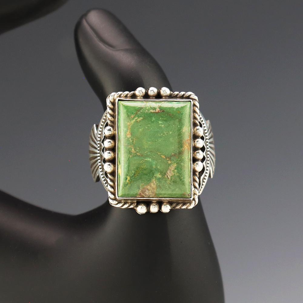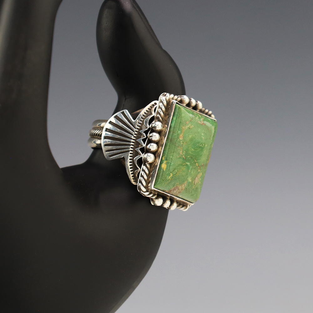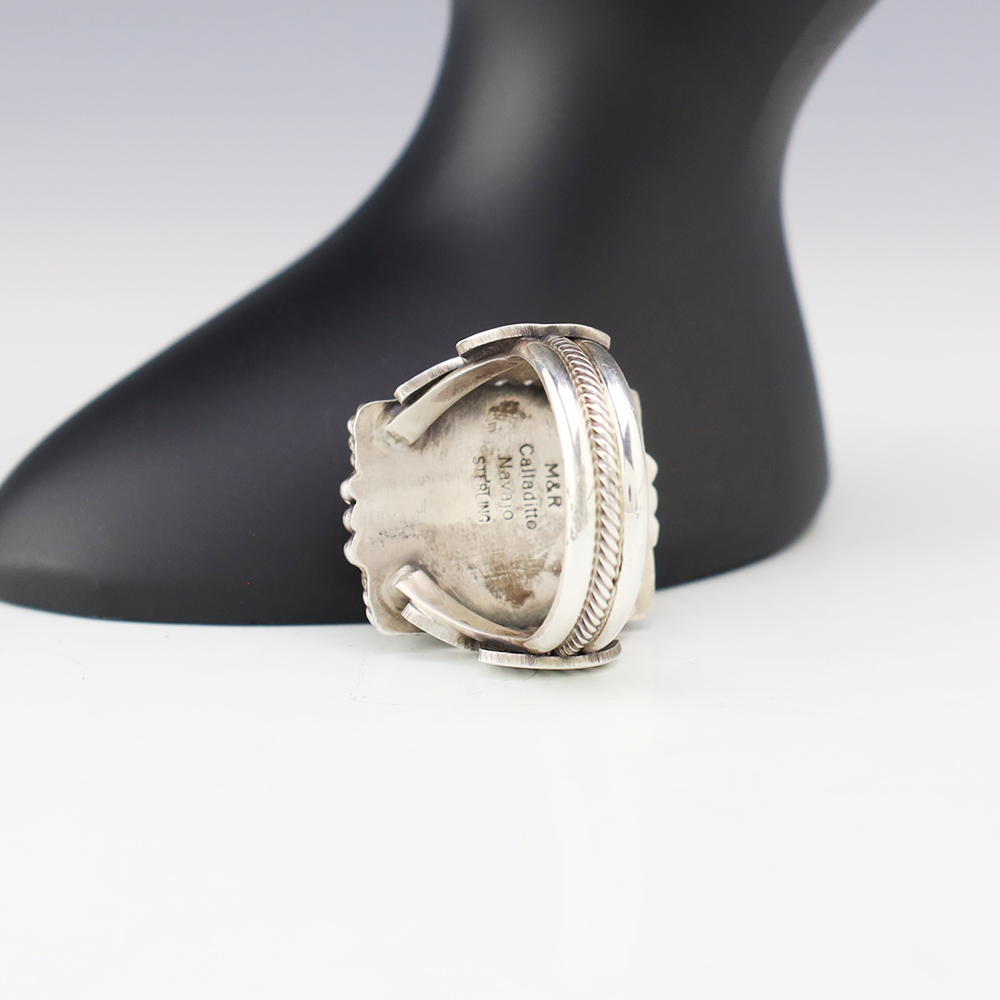 This ring is a great representation of hand made Navajo jewelry and will make a statement on your hand. A beautiful piece of Tyrone Turquoise is set into a sterling silver setting. Hand made by Navajo silversmith Michael and Rosita Calladitto. Weighs 14 grams. Size 11 3/4. Signed