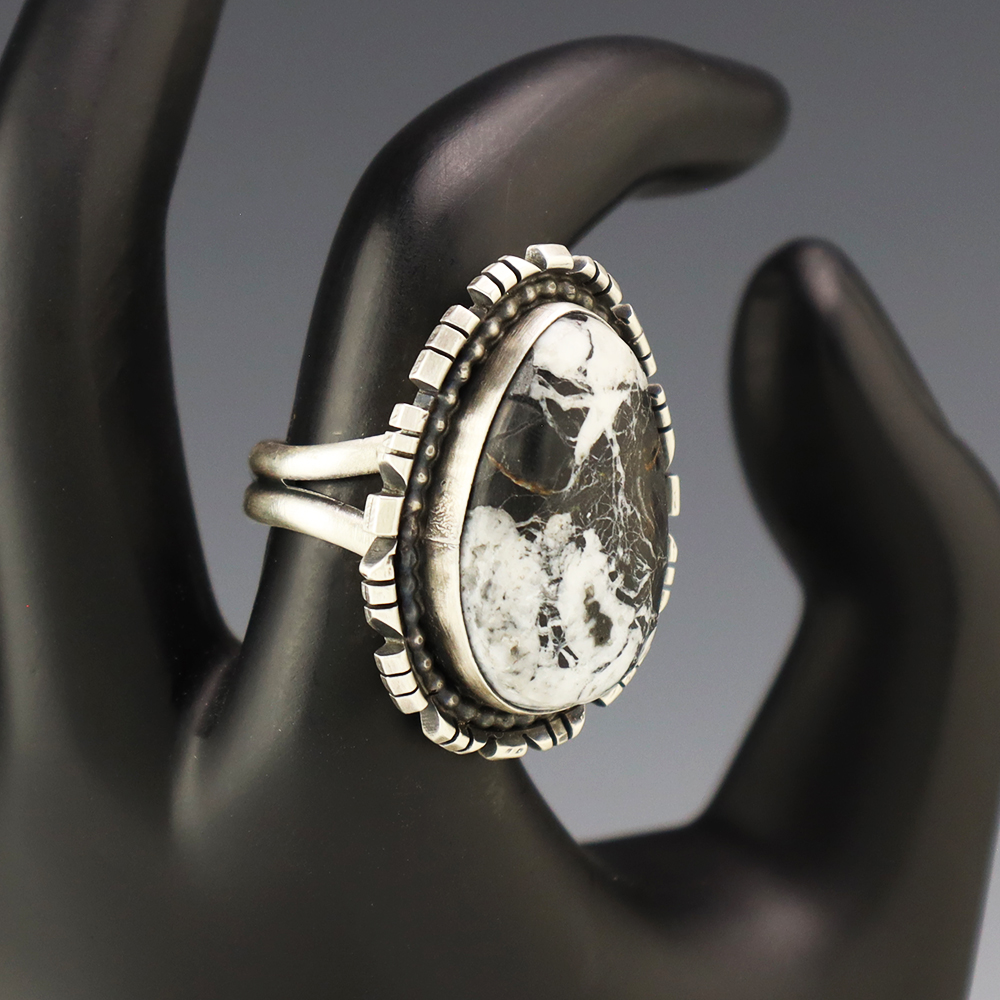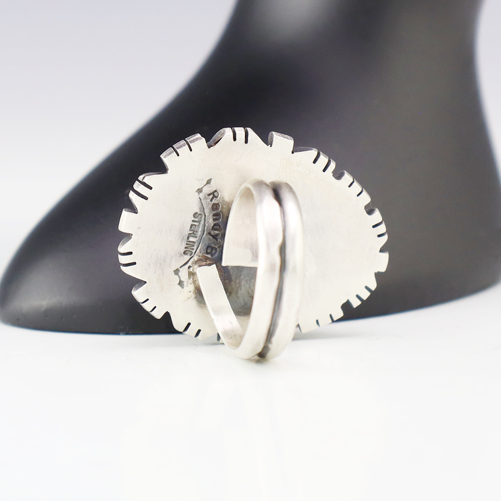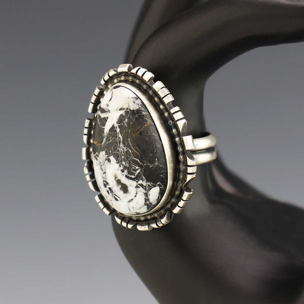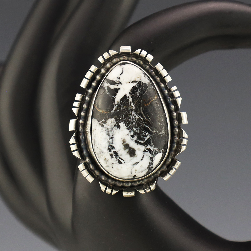 Magnificent ring made by Navajo artist Randy Billy. Sterling silver with a White Buffalo stone. It is a great representation of hand made Navajo jewelry. Size 9 and slightly adjustable. Weighs 14 grams. Signed