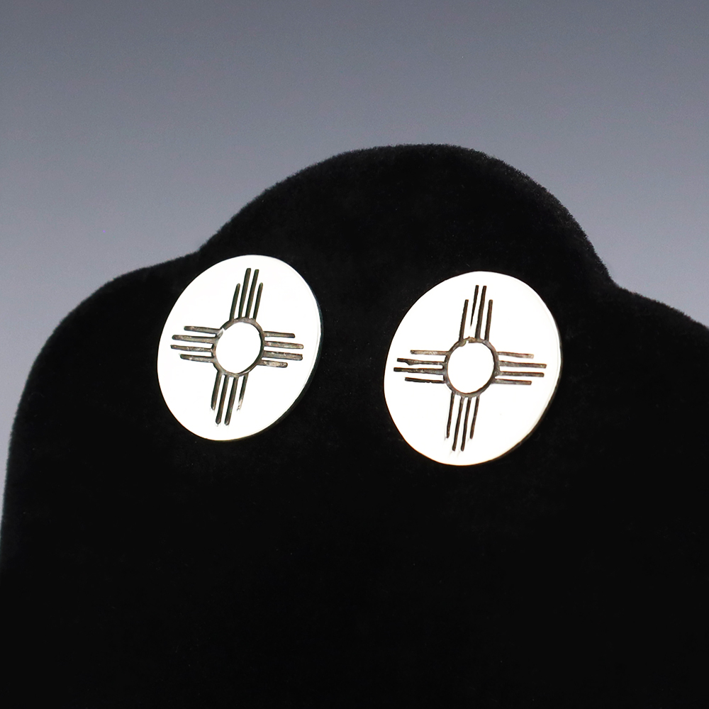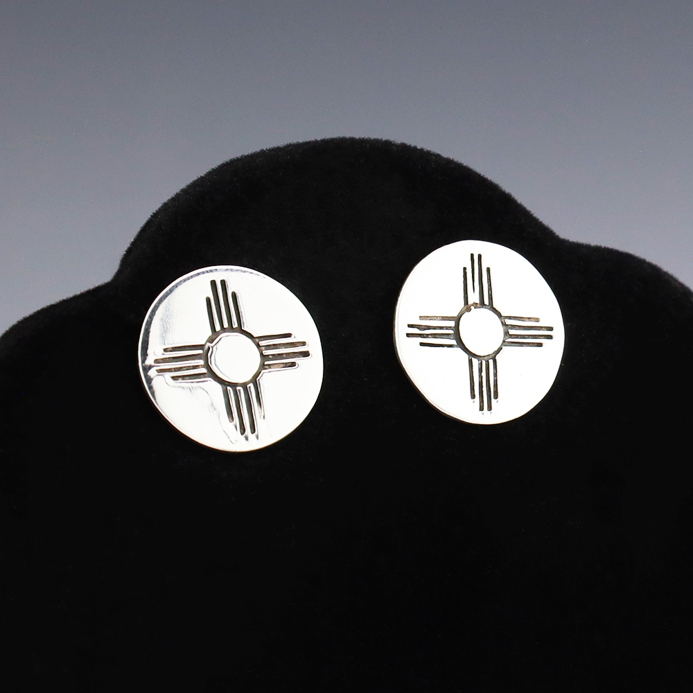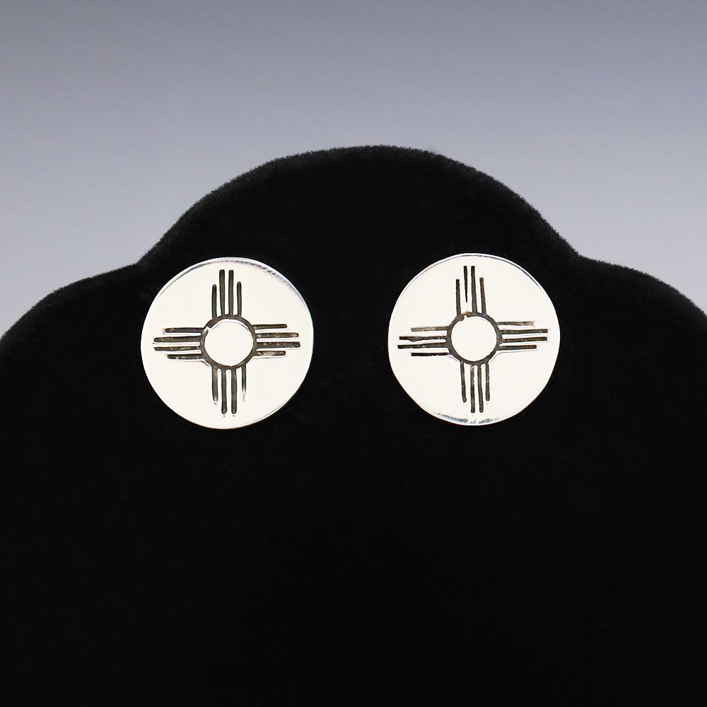 Fabulous Zia earrings hand made out of sterling silver. Hand made by Navajo silversmith Melvin Francis. For the Zia, the Zia sun symbol represents the Circle of Life: four winds, four seasons, four directions, and four sacred obligations. Weighs 8 grams. Signed