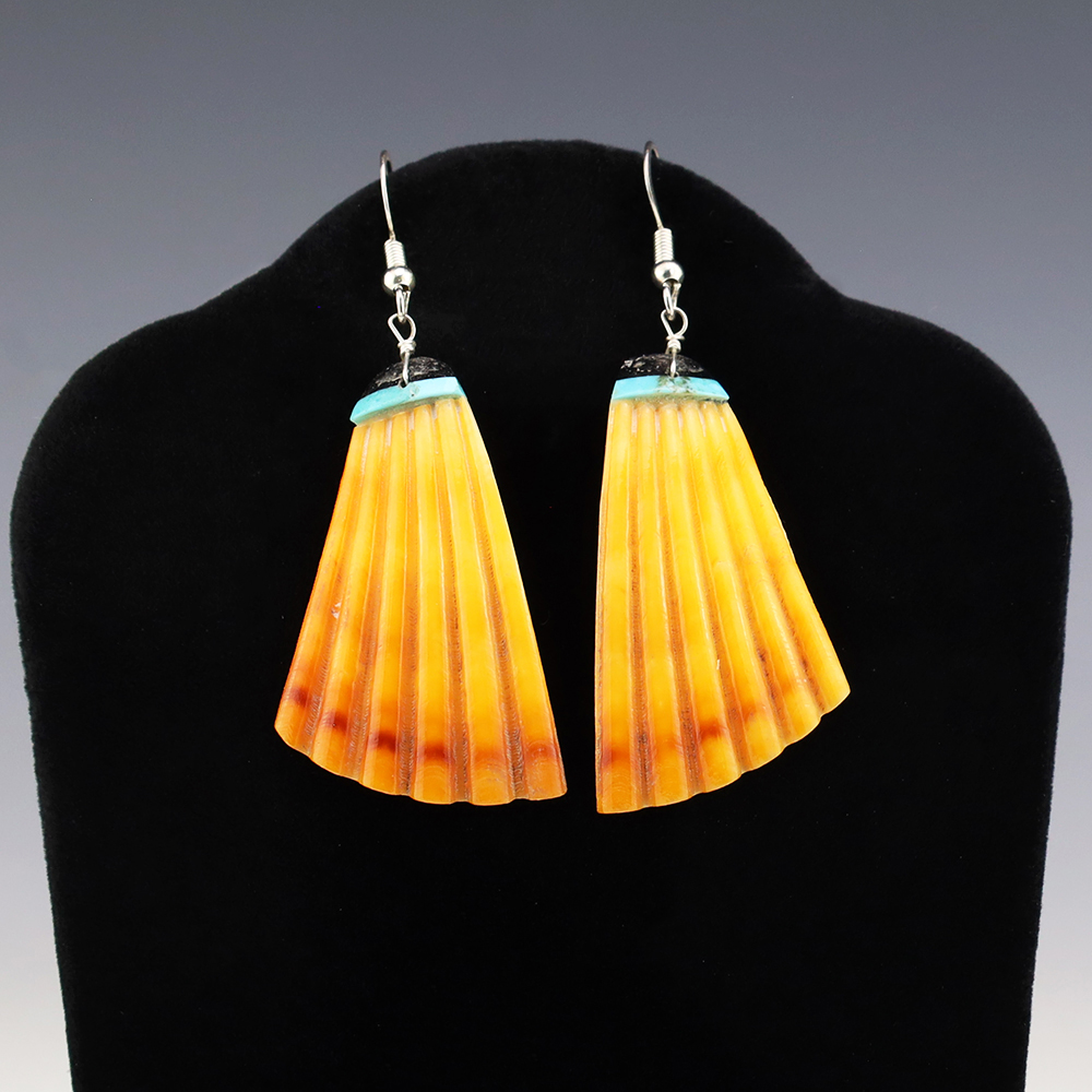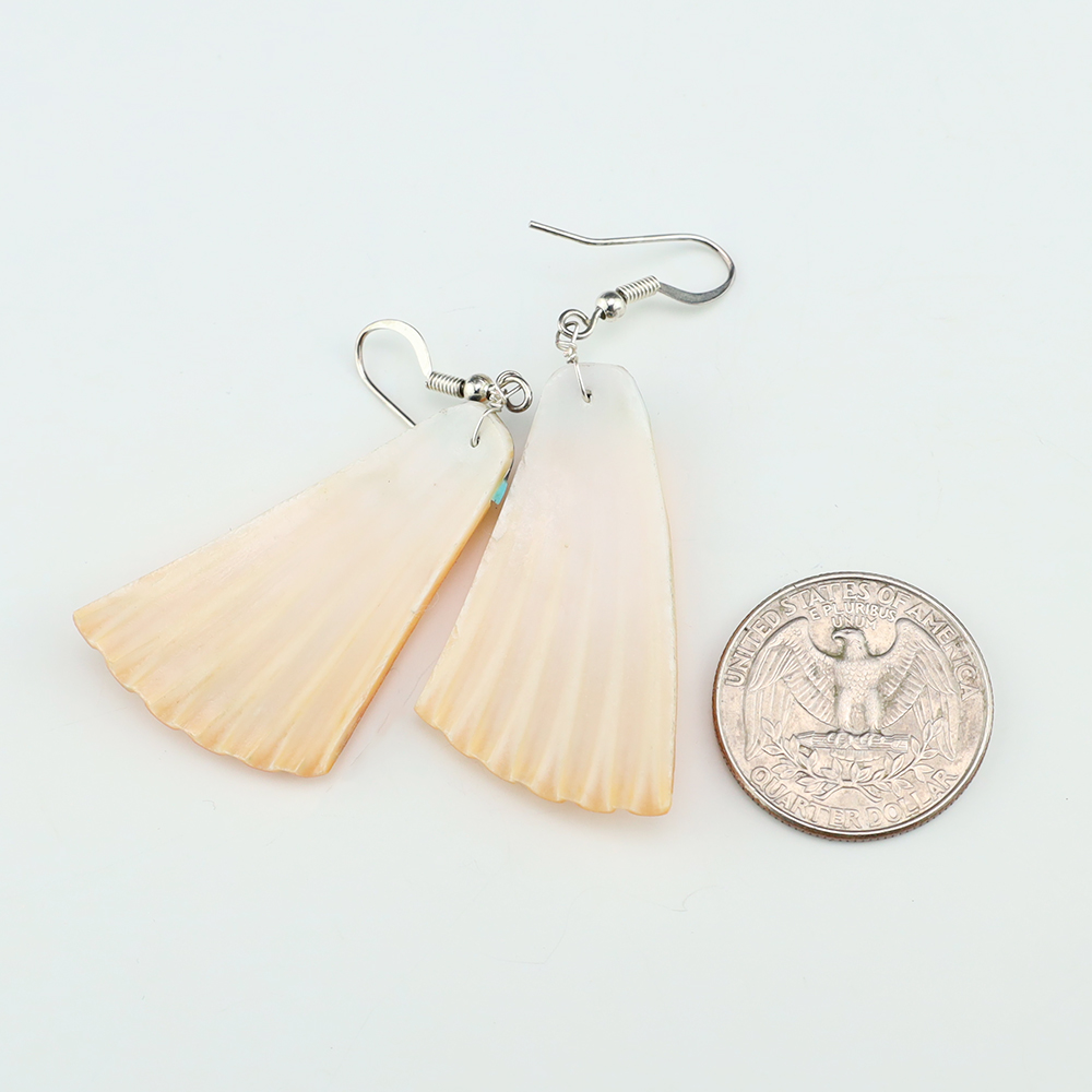 Lovely earrings hand made out of a Shell and Turquoise by Navajo artist Jameson Pete. These wonderful earrings will become a versatile accessory in your jewelry collection. Weighs 6 grams.