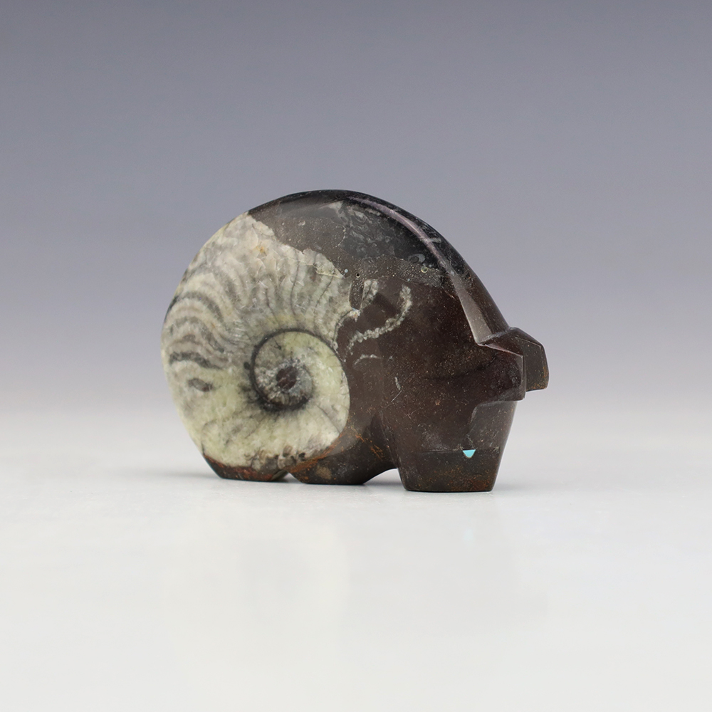 Zuni bear fetishes represent healing and strength. Zuni artist Kenric Laiwakete hand crafted this wonderful bear fetish. The bear carving is made out of Orthoceras, and has an inlaid Turquoise heartline. This great carving would make a great addition to your Native American art or Zuni fetish collection. Signed