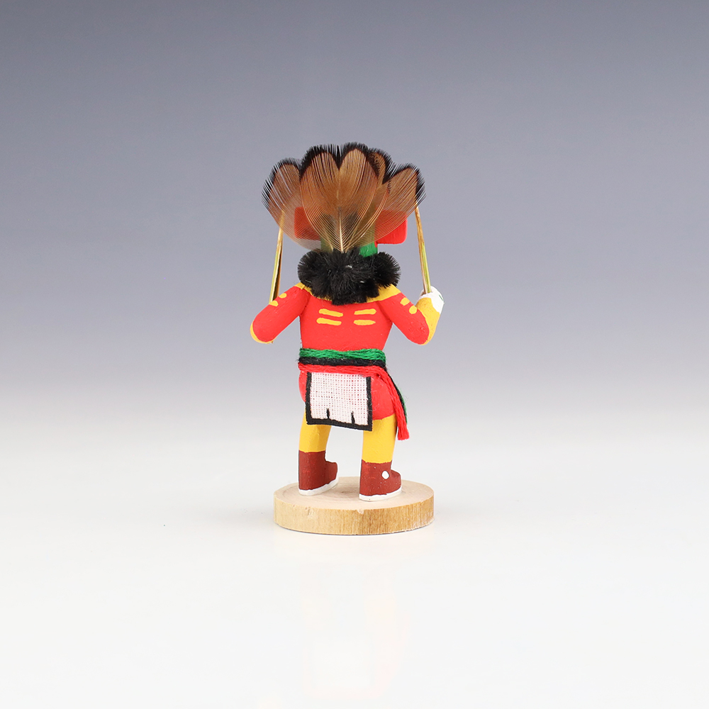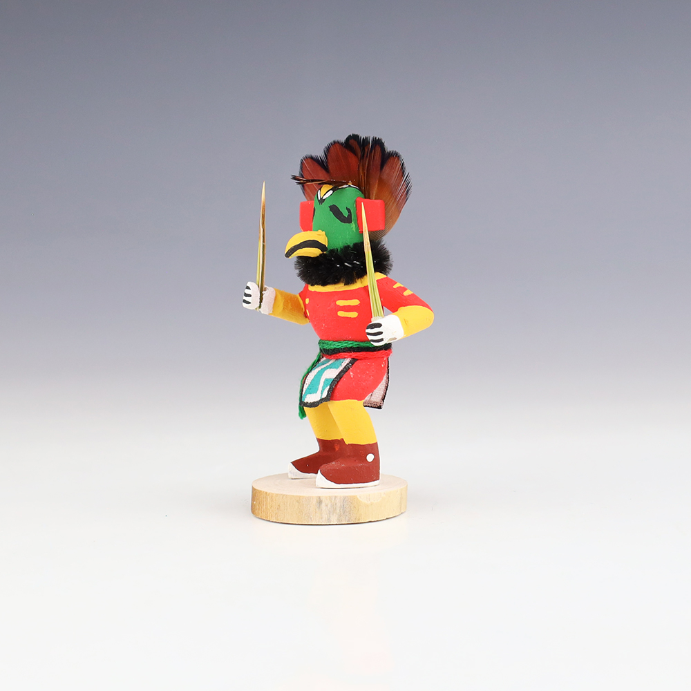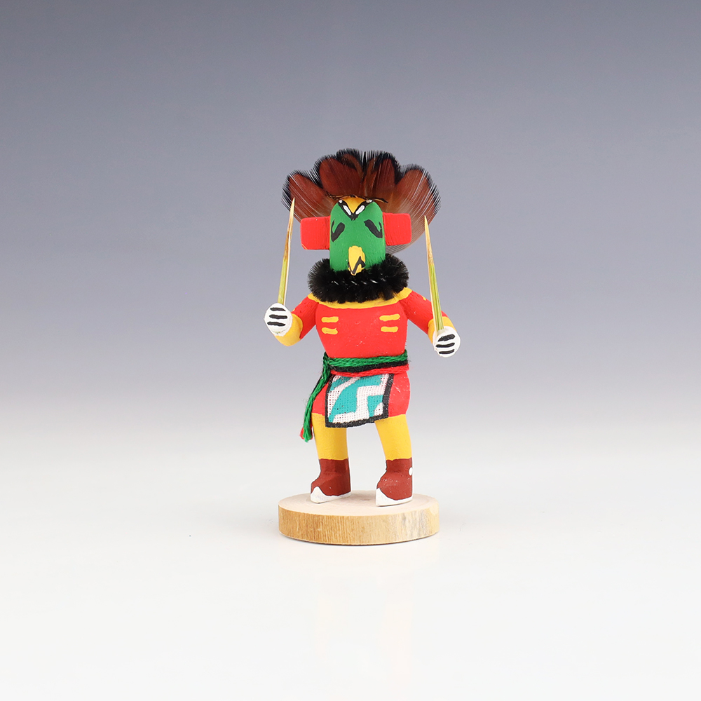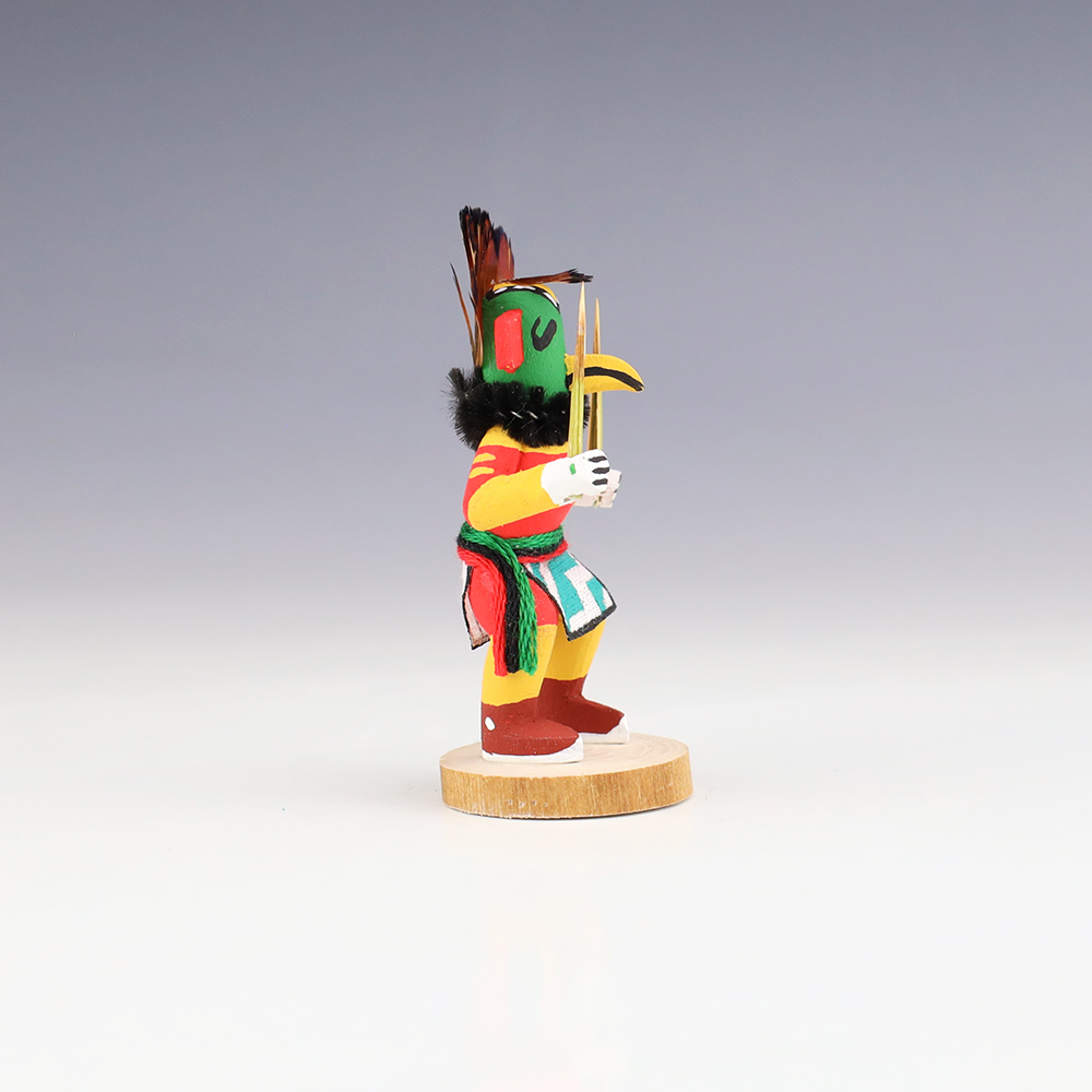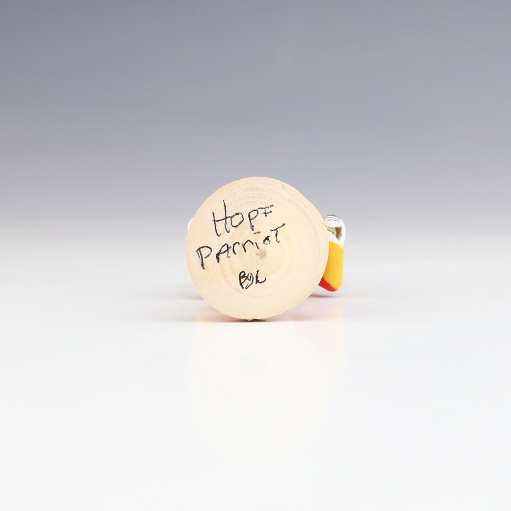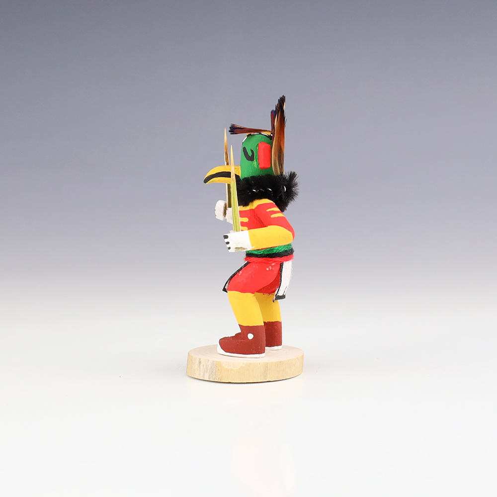 Hopi/Acoma artist Adrian Leon creates wonderful miniature kachinas, and this Parrot Kachina is no exception. Delicately carved and painted, this marvelous carving would be a great addition to your kachina or Native American art collection. Signed