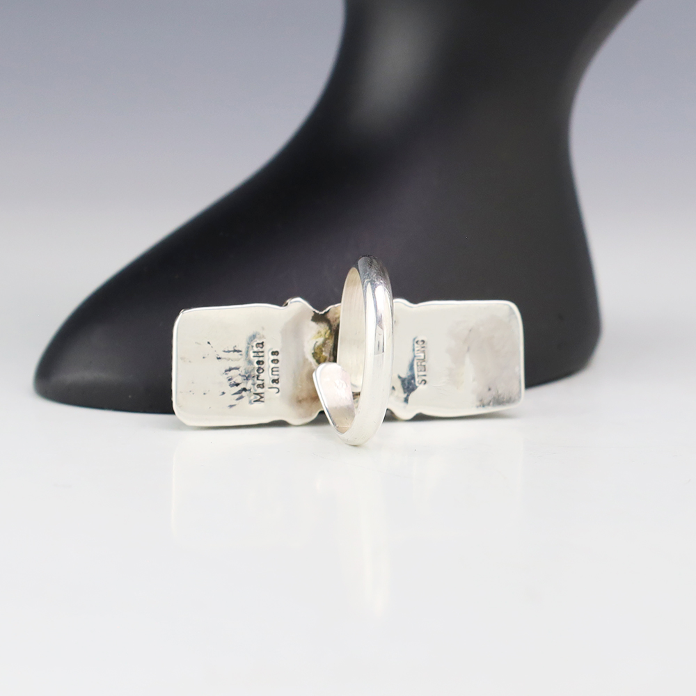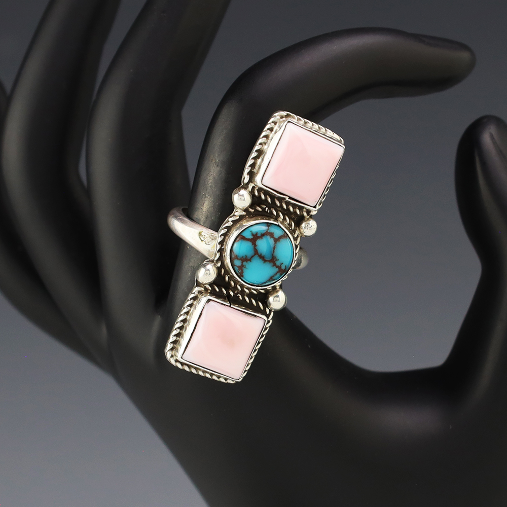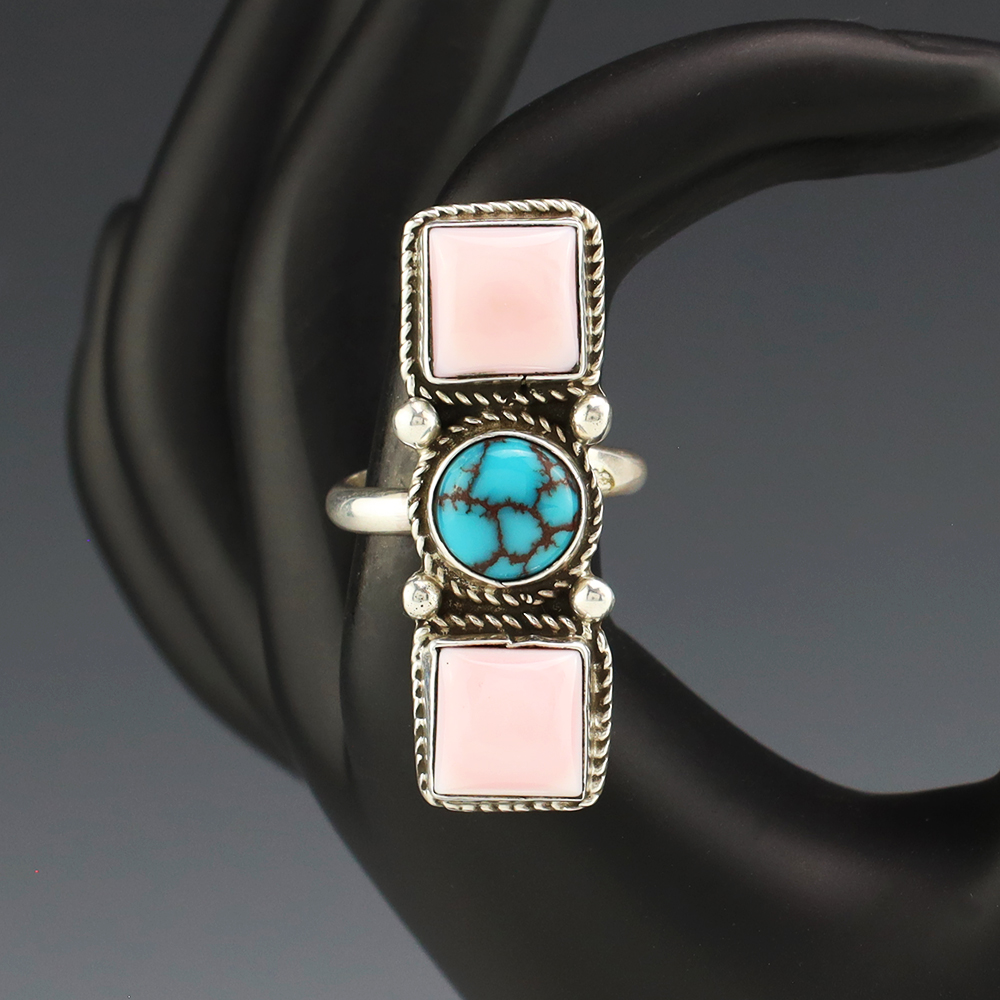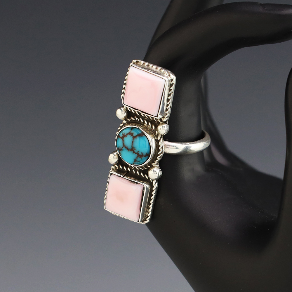 This wonderful ring was hand made by Navajo artist Marcella James. Sterling silver with Turquoise and Pink Conch stones. It is a great representation of hand made Navajo jewelry. Size 8 and is slightly adjustable. Weighs 10 grams. Signed