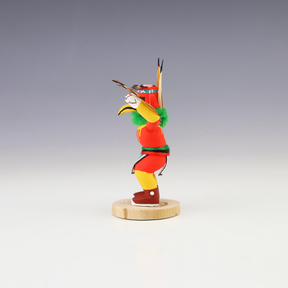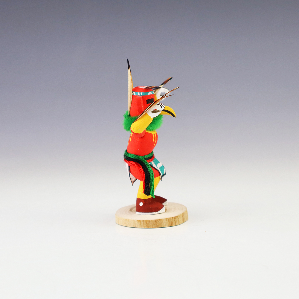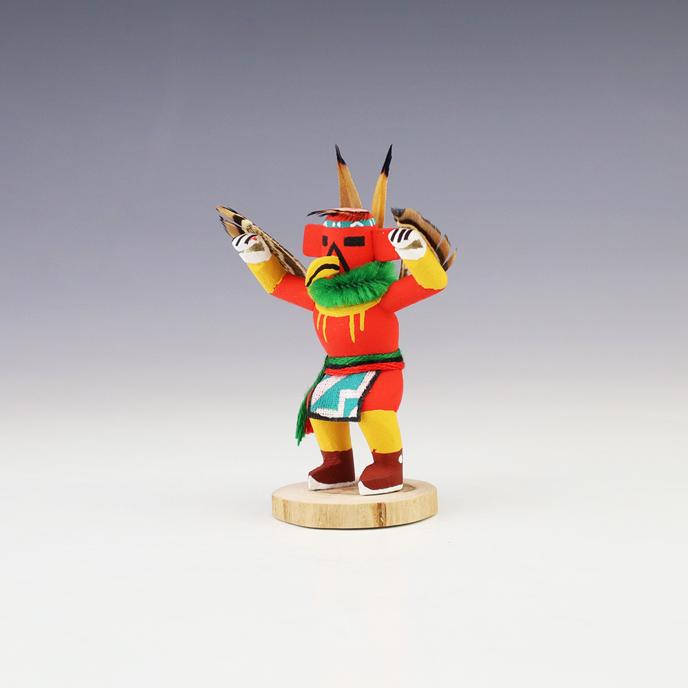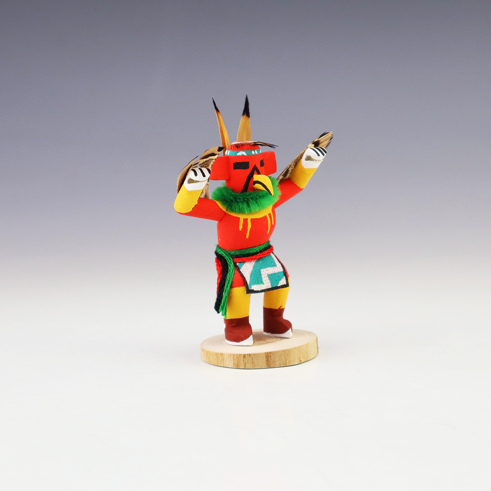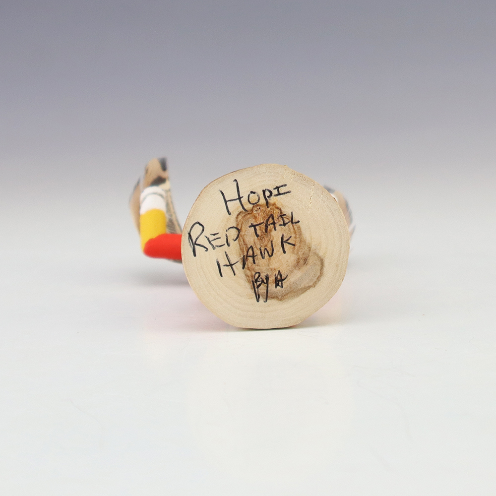 Hopi/Acoma artist Adrian Leon creates wonderful miniature kachinas, and this Red Tail Hawk Kachina is no exception. Delicately carved and painted, this marvelous carving would be a great addition to your kachina or Native American art collection. Signed