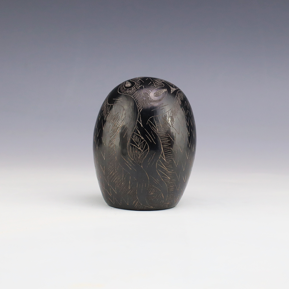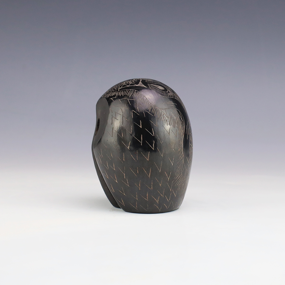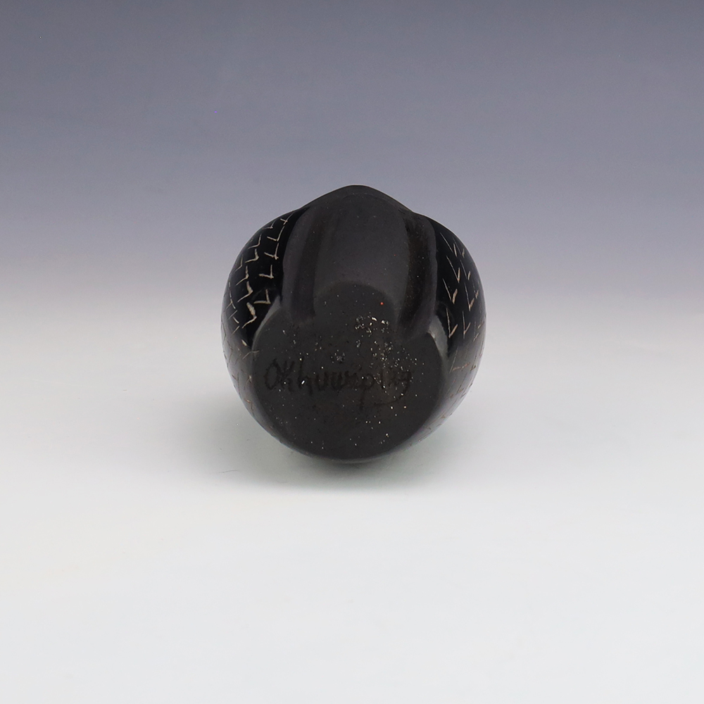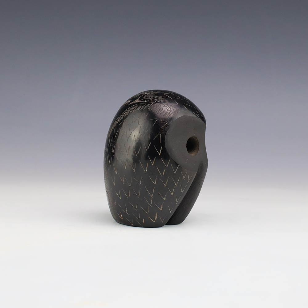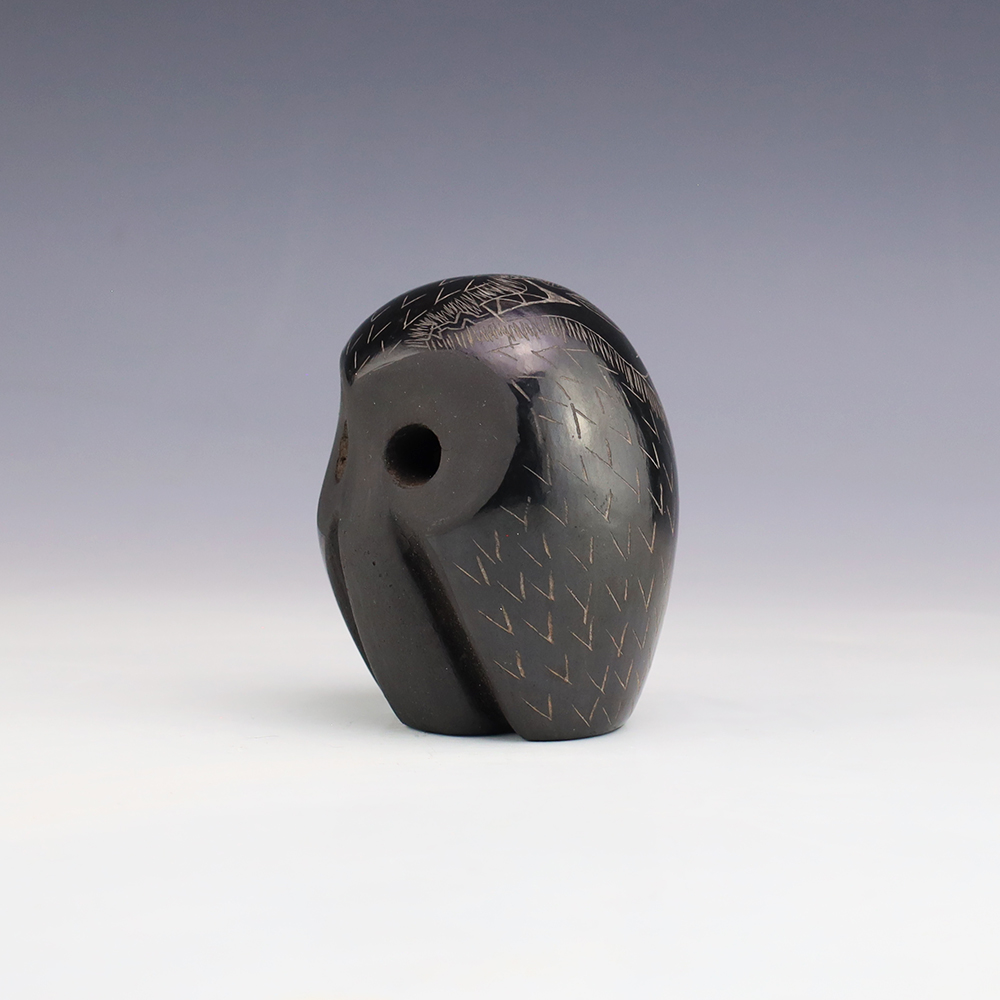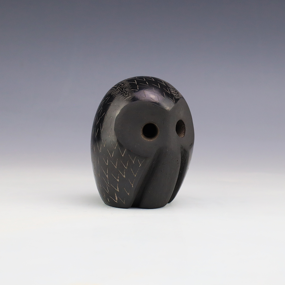 Exquisite Black-on-Black pottery owl by Merton Sisneros of the Okhuwa Ping Studio at Santa Clara Pueblo. Merton makes pottery in the traditional way that was taught by his family. He has won many awards for workmanship, and is well known throughout New Mexico. The Owl is a messenger, and the protector of the home. He represents wisdom and truth, and has the ability to see what others cannot. This fabulous owl would make a great addition to any art or pottery collection. Signed