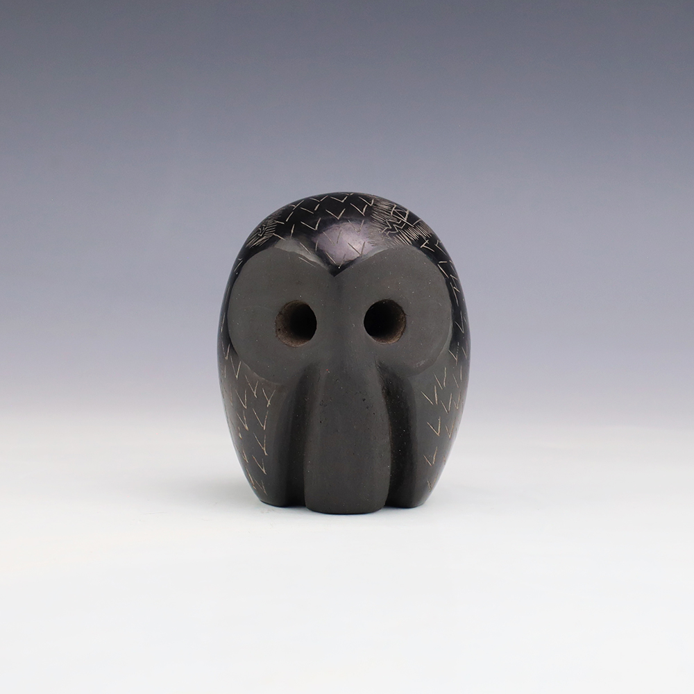 Exquisite Black-on-Black pottery owl by Merton Sisneros of the Okhuwa Ping Studio at Santa Clara Pueblo. Merton makes pottery in the traditional way that was taught by his family. He has won many awards for workmanship, and is well known throughout New Mexico. The Owl is a messenger, and the protector of the home. He represents wisdom and truth, and has the ability to see what others cannot. This fabulous owl would make a great addition to any art or pottery collection. Signed