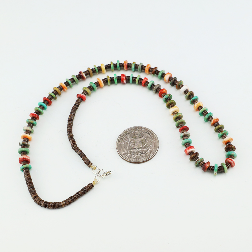 This necklace, hand made by Kewa artist Jeanette Calavaza, is a lovely statement piece. The necklace showcases fine Olive Shell, Spiny Oyster, and Turquoise. The strand of heishi is finished off with a hook and eye. Weighs 12 grams.