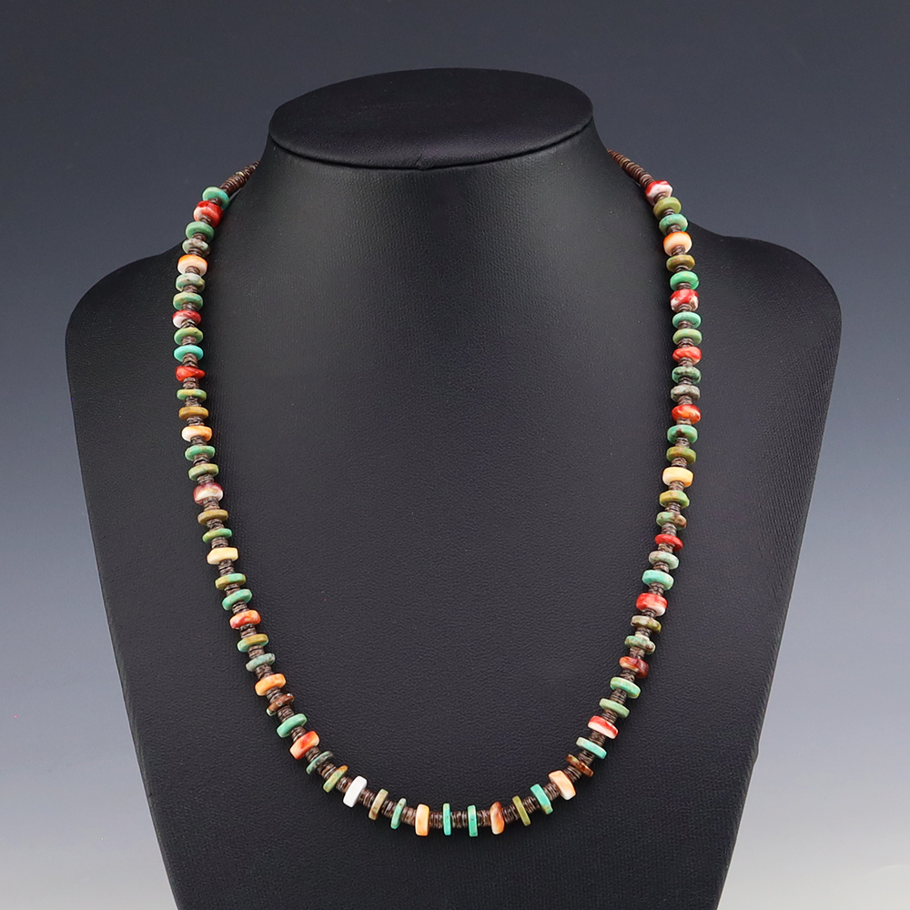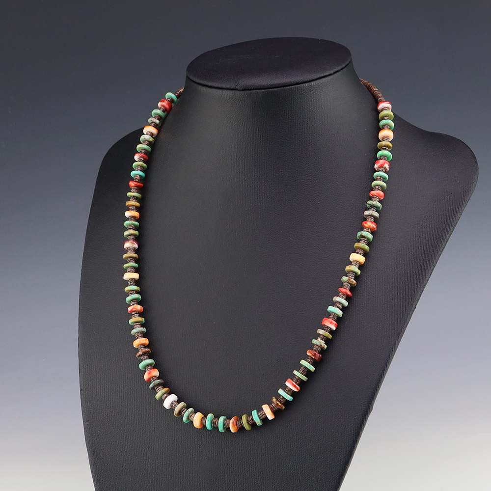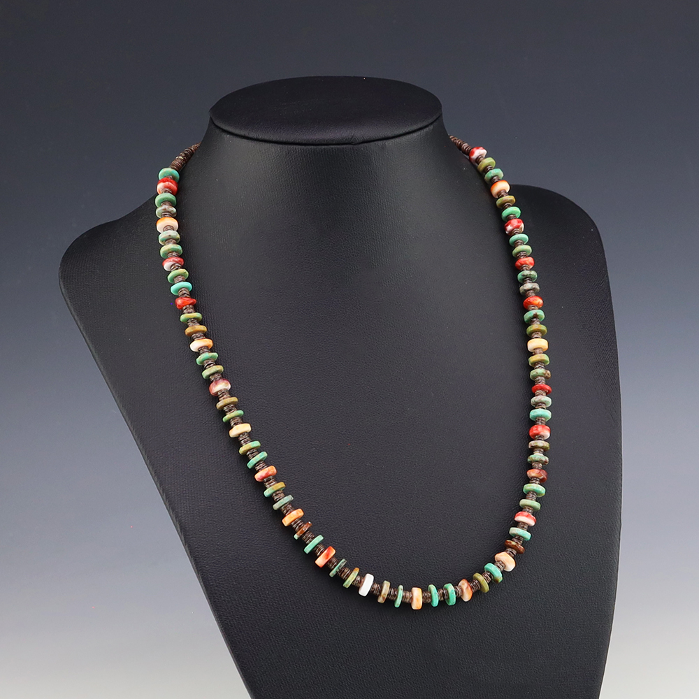 Kewa (Santo Domingo) artists are known for their heishi. The word “heishi“ means “shell” in the Keresan language. Traditionally Kewa jewelry makers created their heishi jewelry out of shell. The shell is hand cut into a flat disc. Today, other stones that Santo Domingo artists cut in this manner, are also referred to as heishi. With modern tools and innovations, artists can create different styles of beads and use different gemstones like turquoise, coral, jet, serpentine, and spiny oyster.