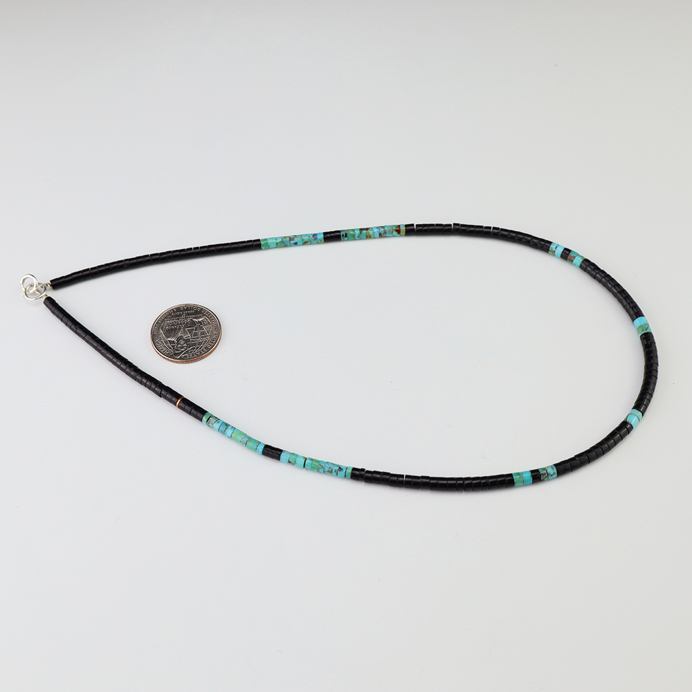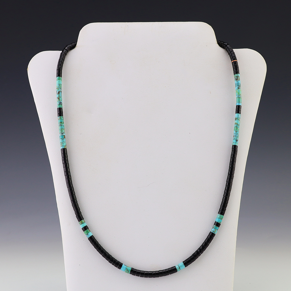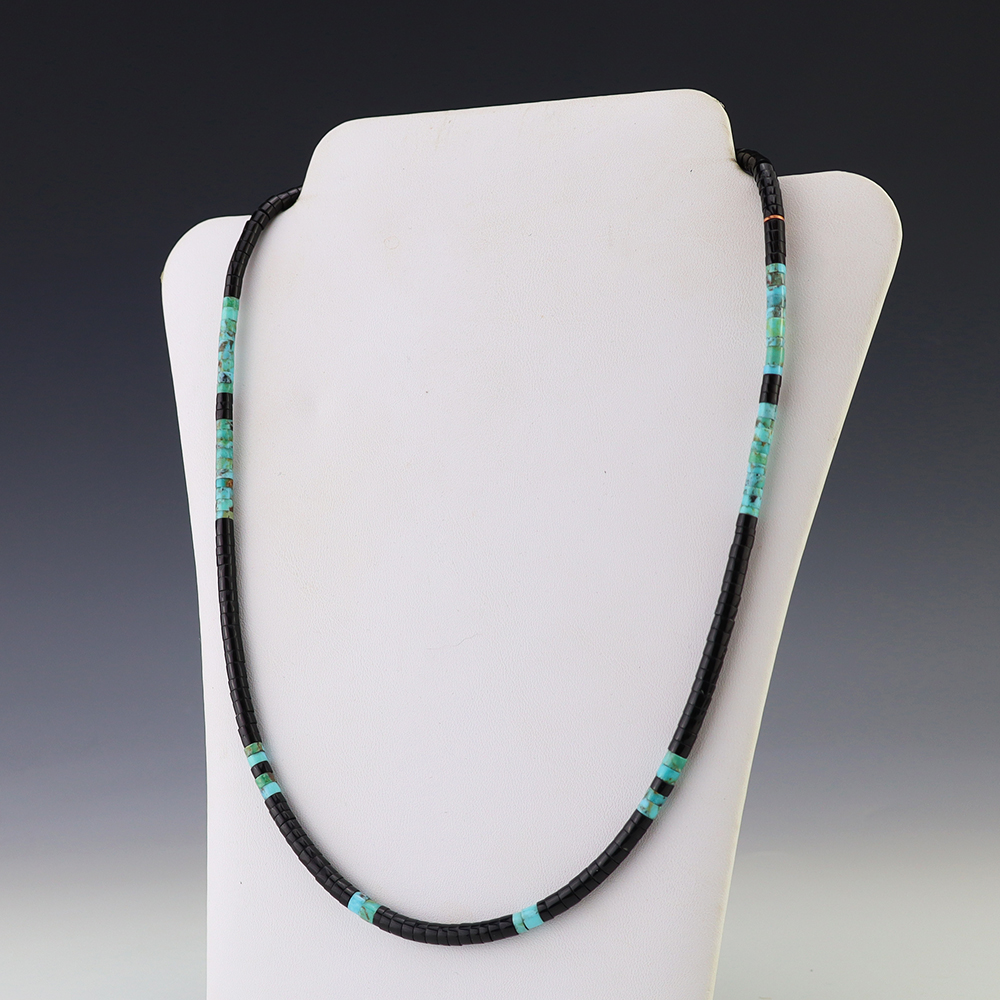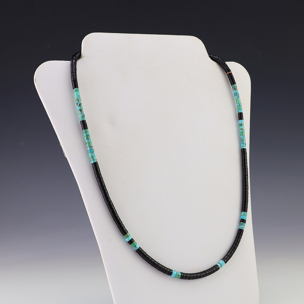 Kewa (Santo Domingo) artists are known for their heishi. The word “heishi“ means “shell” in the Keresan language. Traditionally Santo Domingo jewelry makers created their heishi jewelry out of shell. The shell is hand cut into a flat disc. Today, other stones that Santo Domingo artists cut in this manner, are also referred to as heishi. With modern tools and innovations, artists can create different styles of beads and use different gemstones like turquoise, coral, jet, serpentine, and spiny oyster.