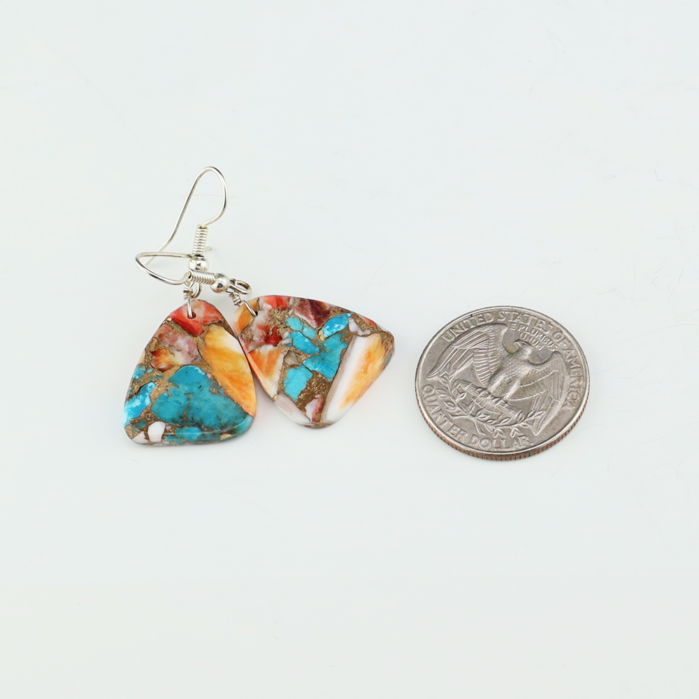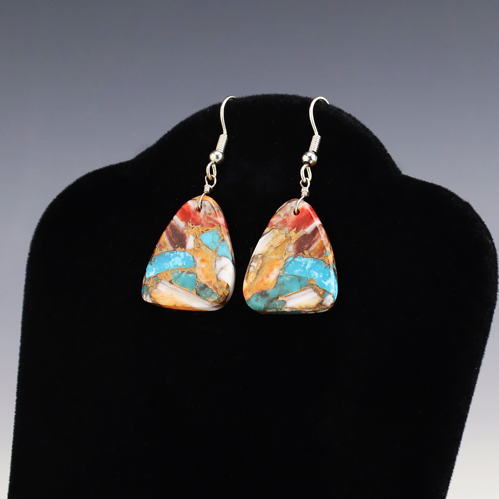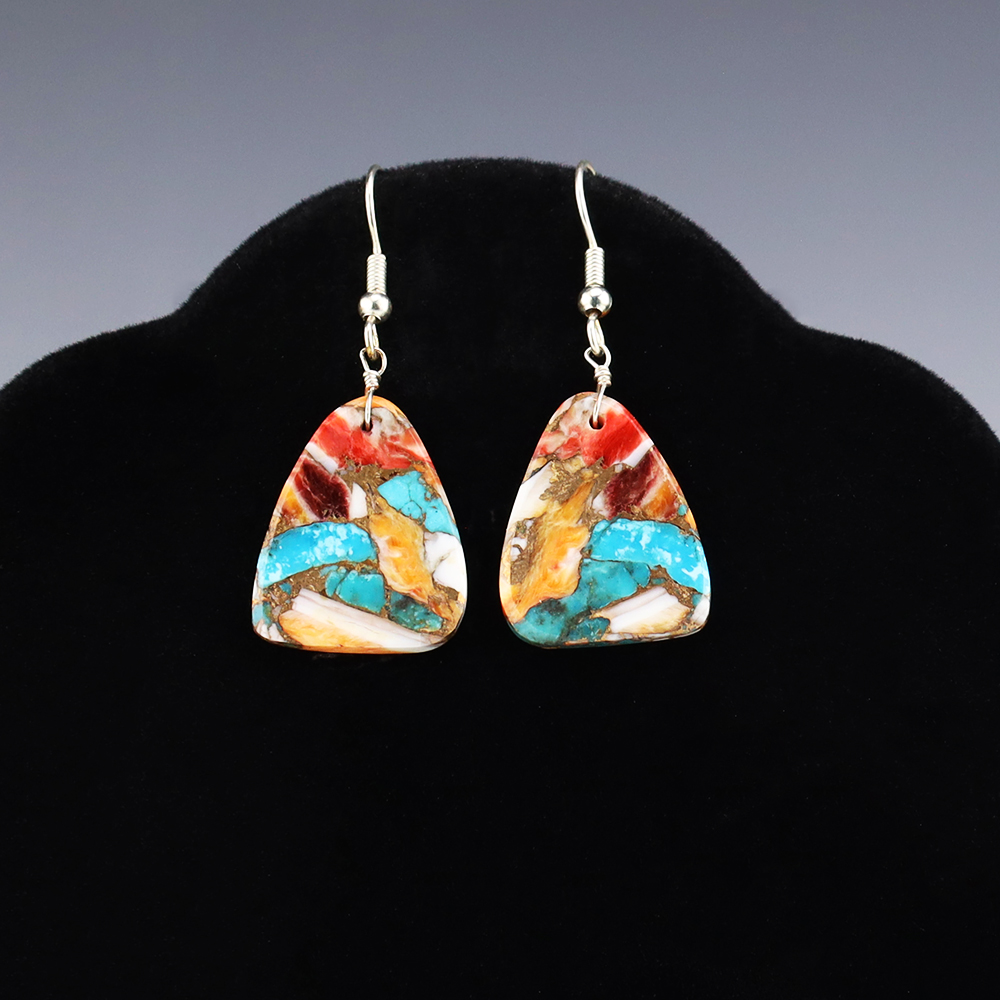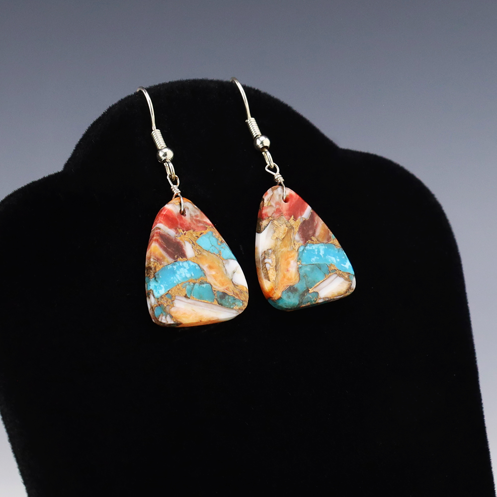 Lovely earrings hand made out of composite shell and turquoise by Navajo artist Jameson Pete. These wonderful earrings will become a versatile accessory in your jewelry collection. Weighs 6 grams.