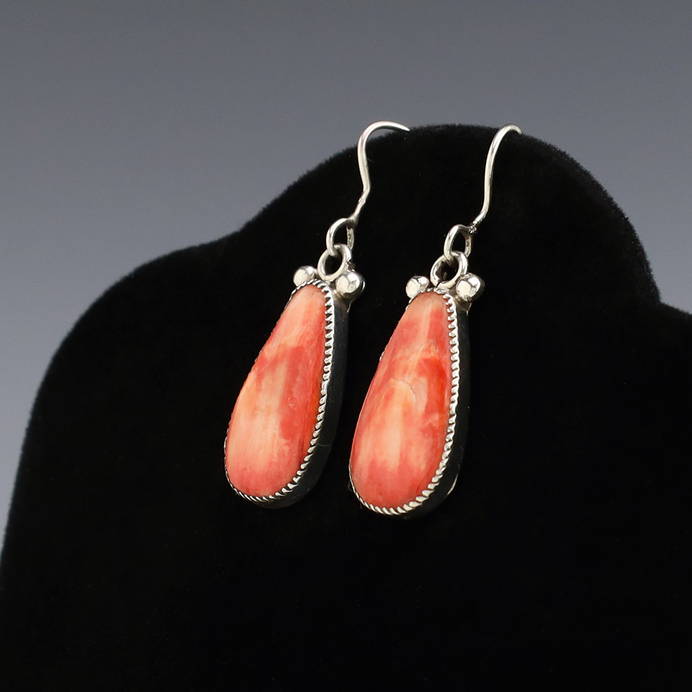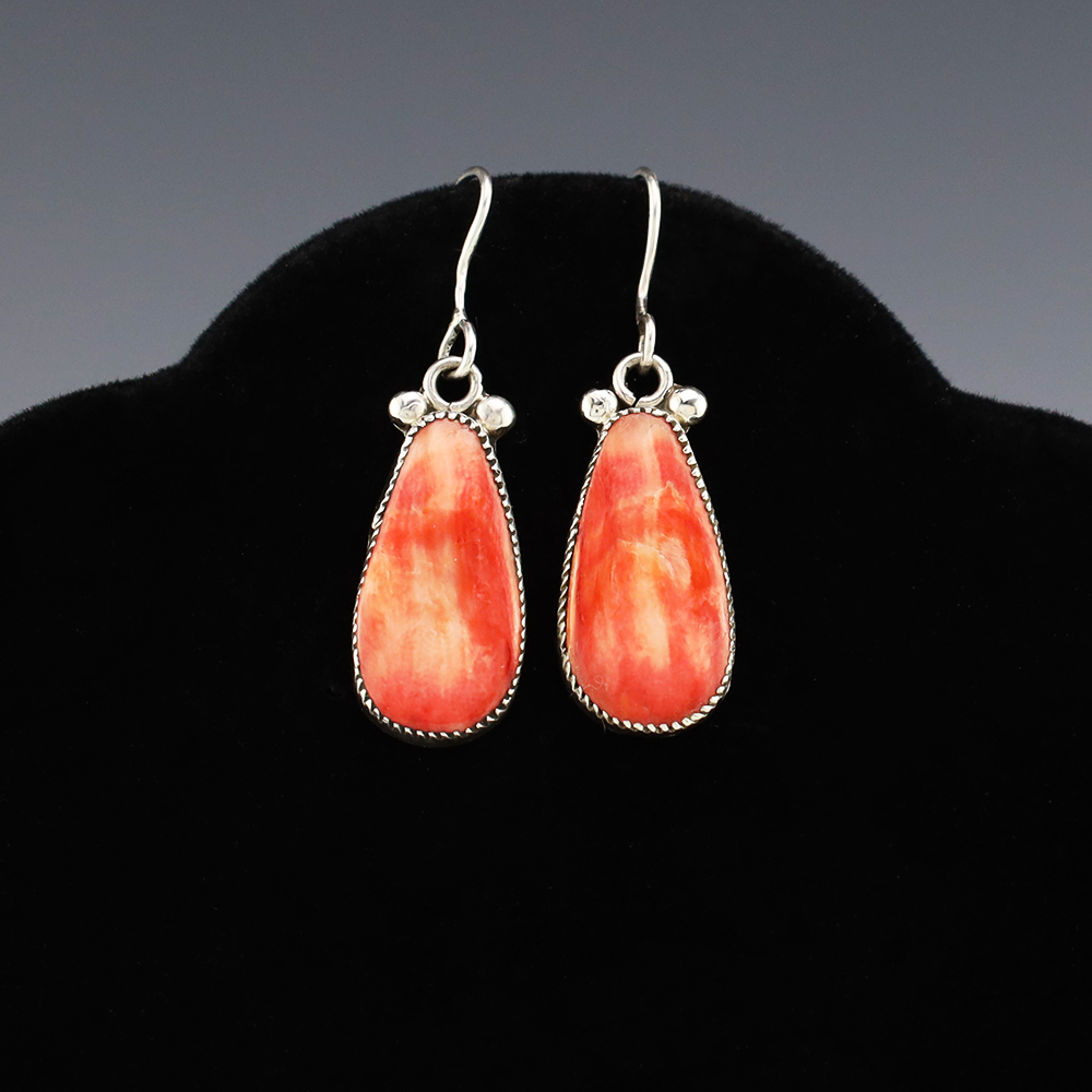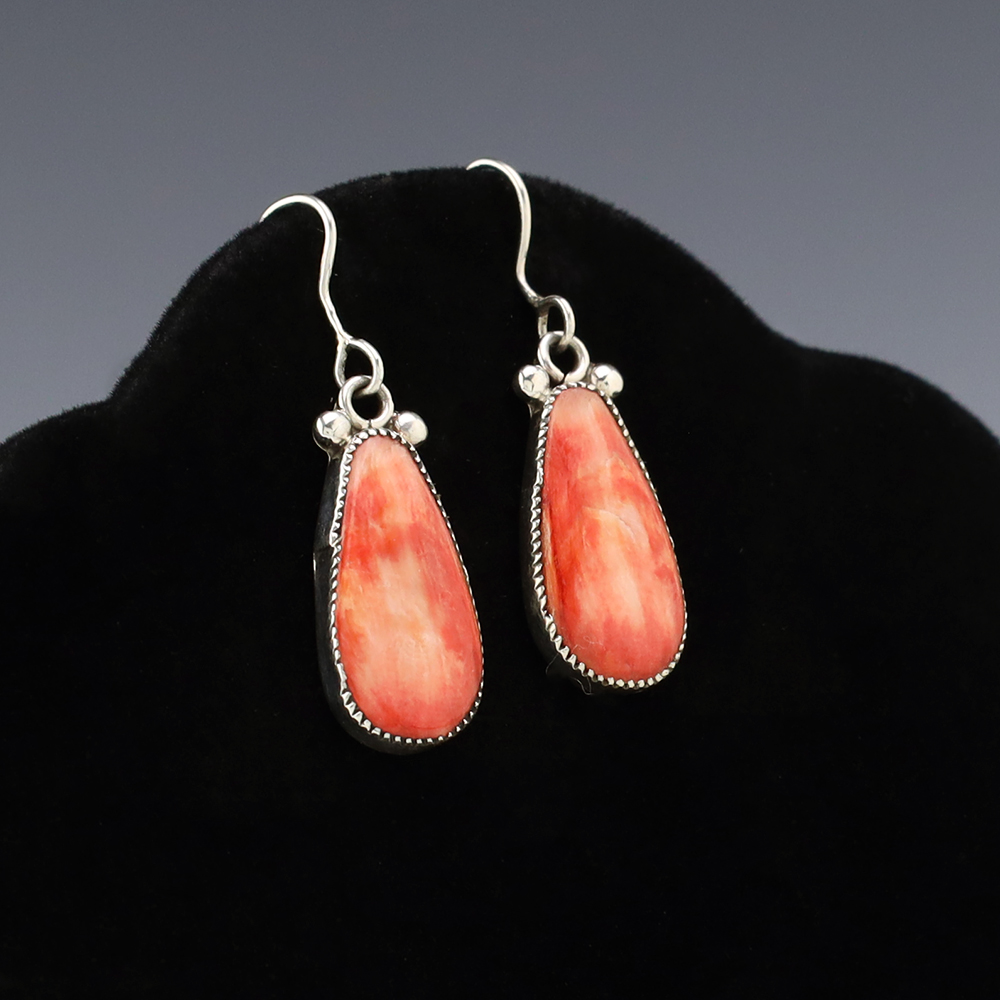 Zuni artist Diane Lonjose made these beautiful earrings. Made out of sterling silver and set with Spiny Oyster. The components are all hand fabricated and the stones are all natural. Diane comes from a family of Zuni jewelers. She is the daughter of Alice and Duane Quam, and grandchild of Doris and Wayne Ondelacy. Weighs 6 grams. Signed