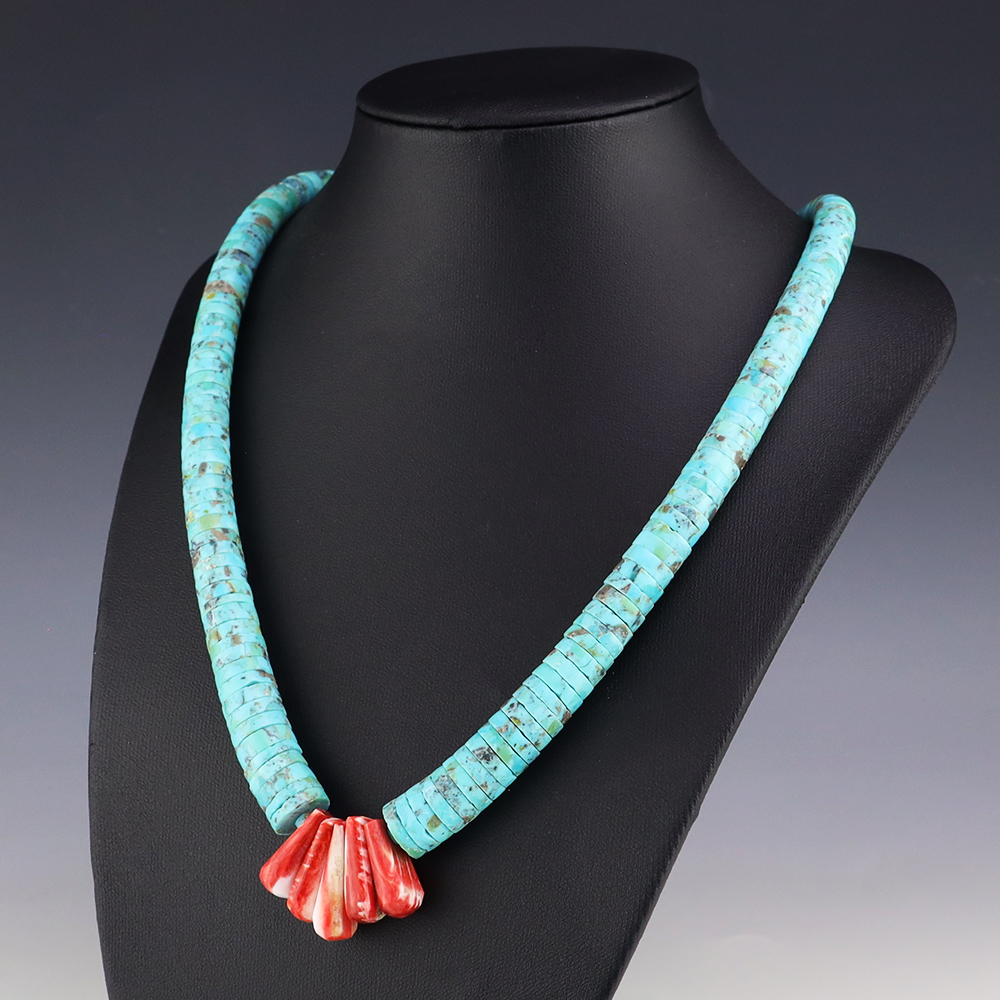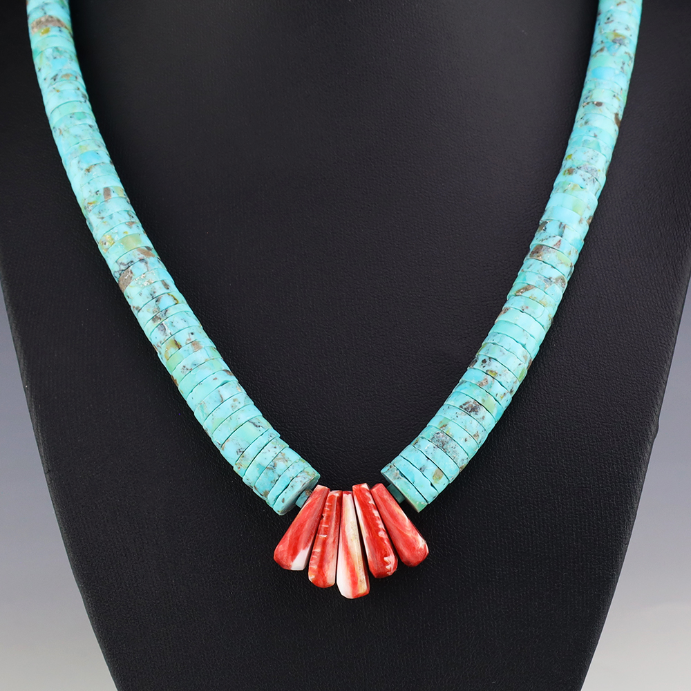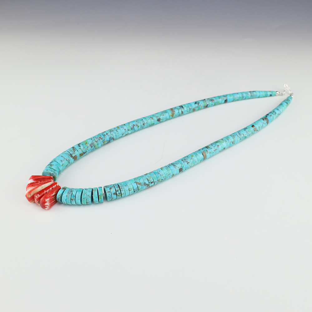 Amazing color combination! Kewa artist Lupe Lovato hand crafted this gorgeous necklace out of Turquoise and Spiny Oyster. Traditionally made by hand cutting, drilling, rolling, and stringing. Weighs 74 grams. A timeless beauty that you will enjoy for years to come.