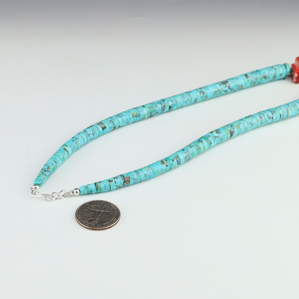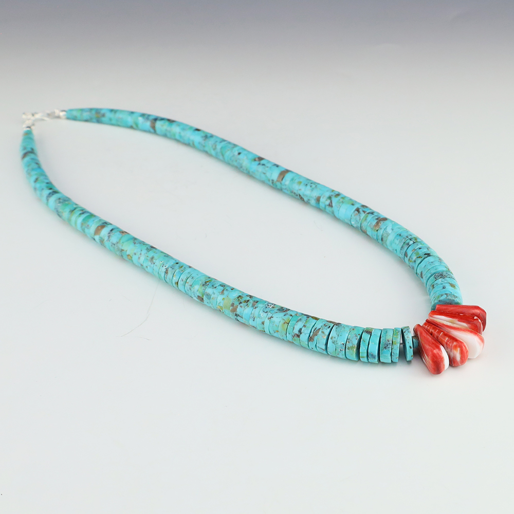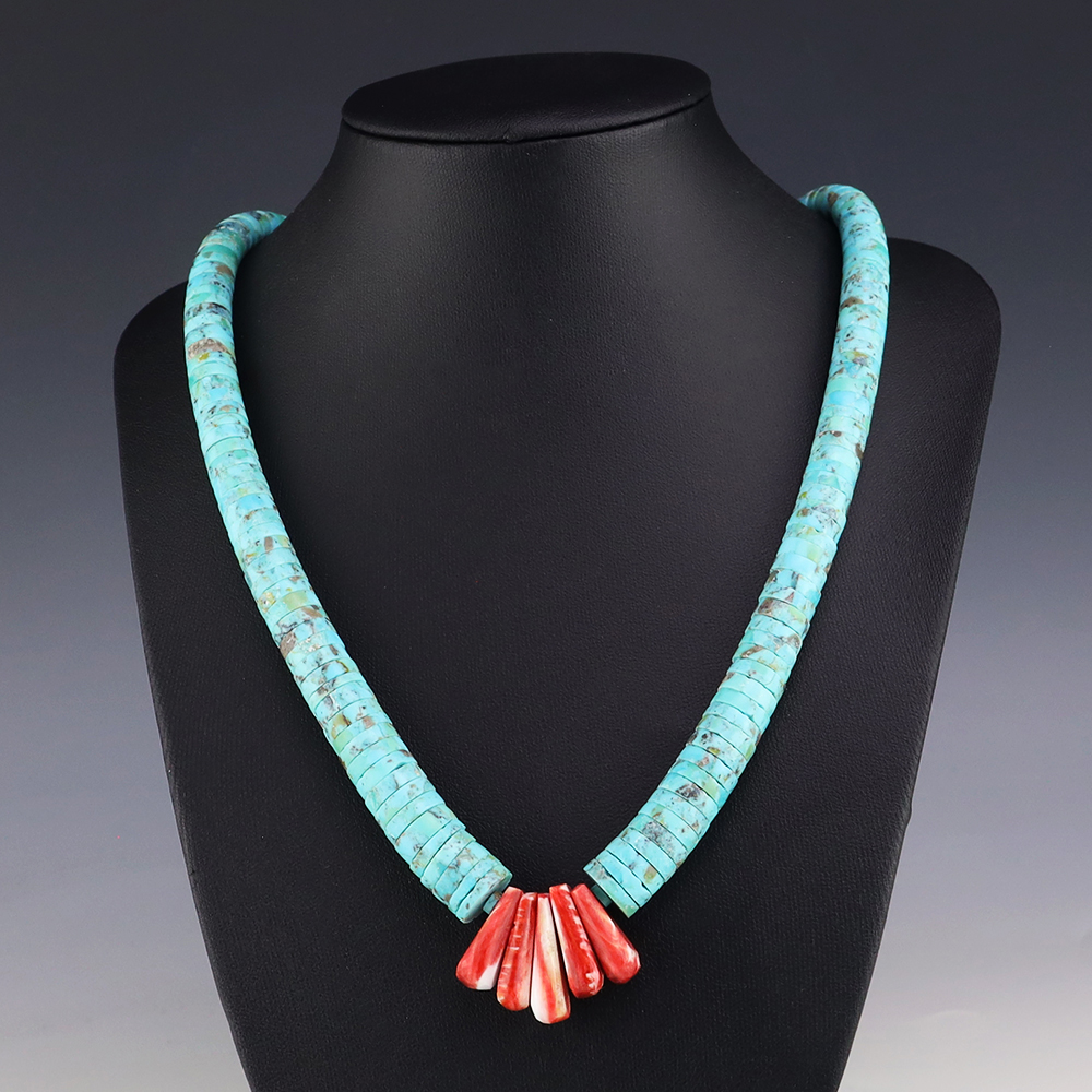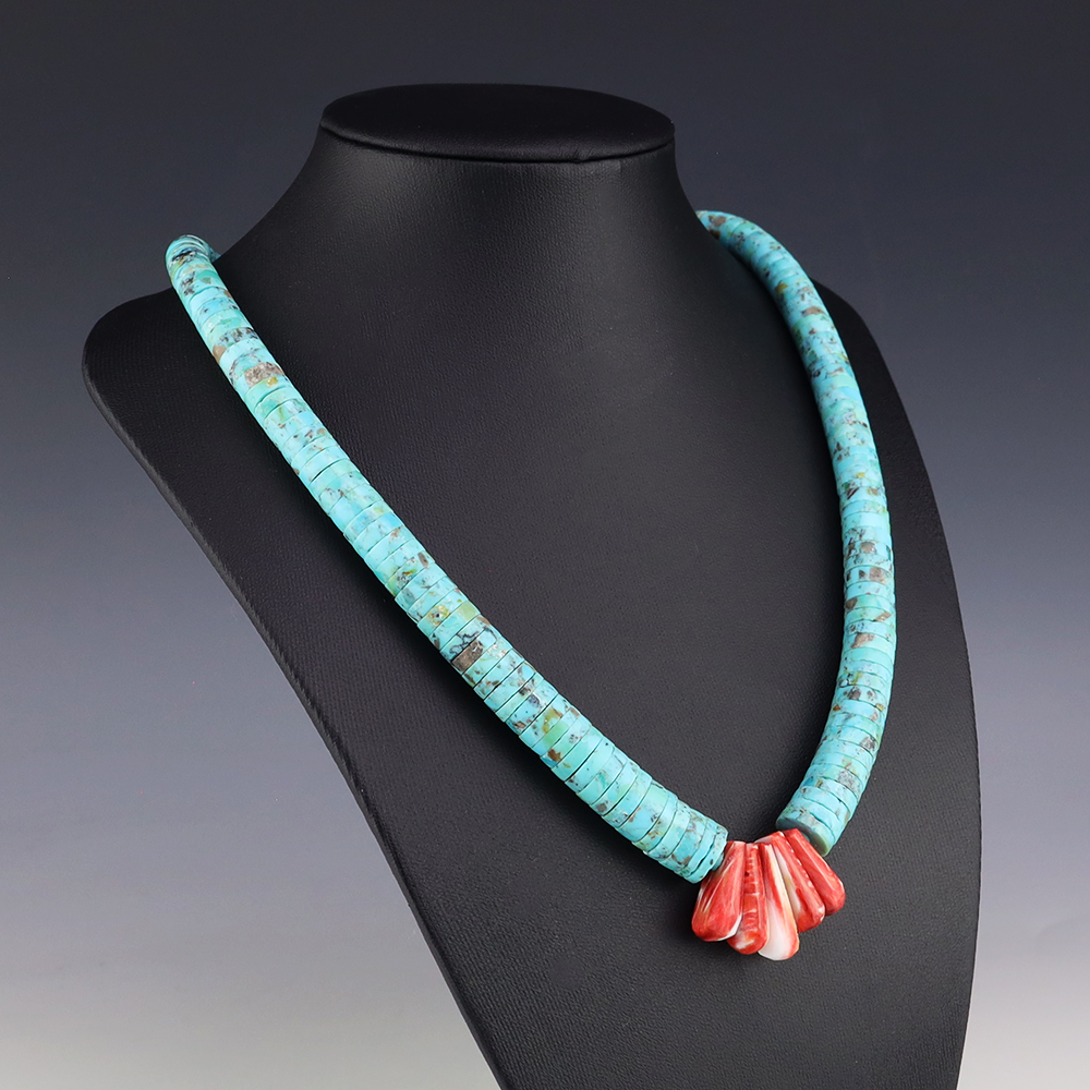 Amazing color combination! Kewa artist Lupe Lovato hand crafted this gorgeous necklace out of Turquoise and Spiny Oyster. Traditionally made by hand cutting, drilling, rolling, and stringing. Weighs 74 grams. A timeless beauty that you will enjoy for years to come.