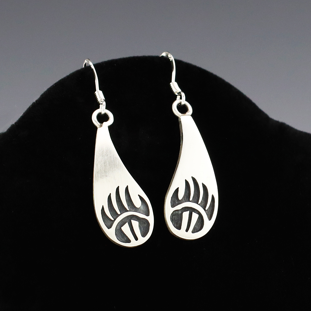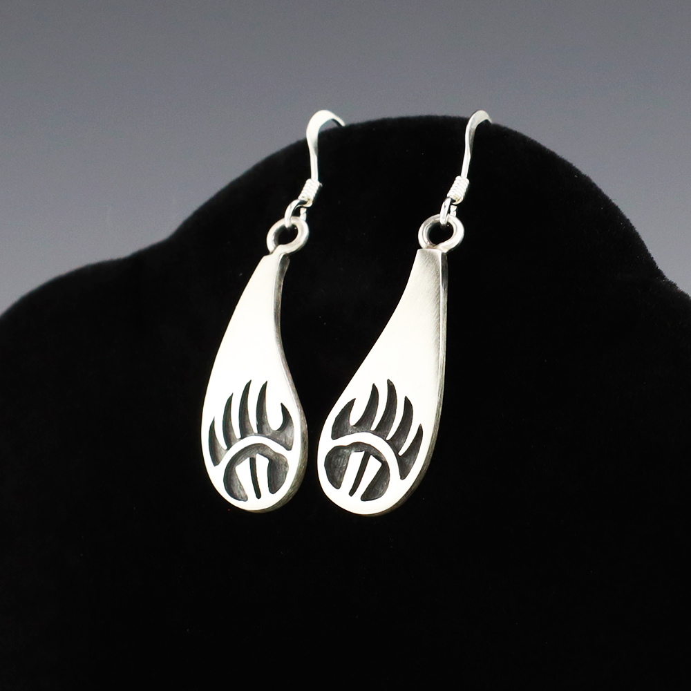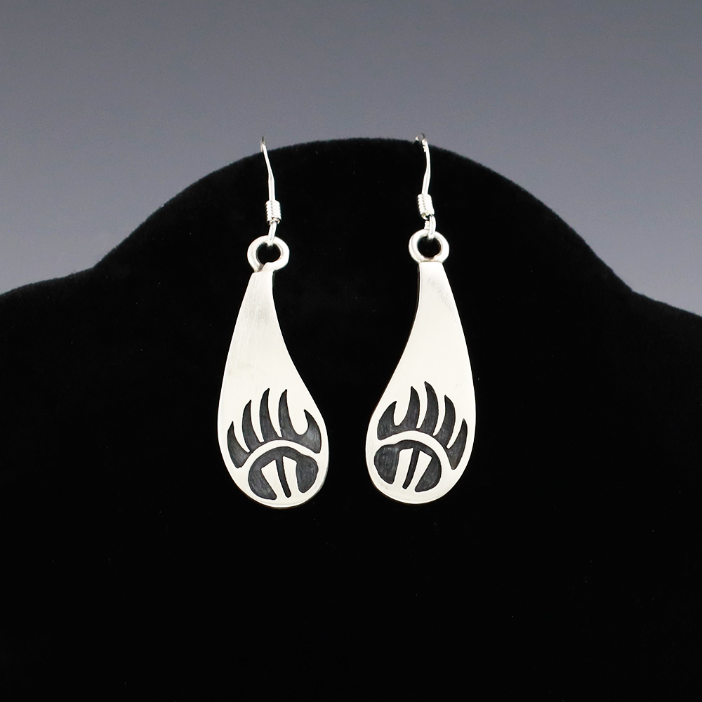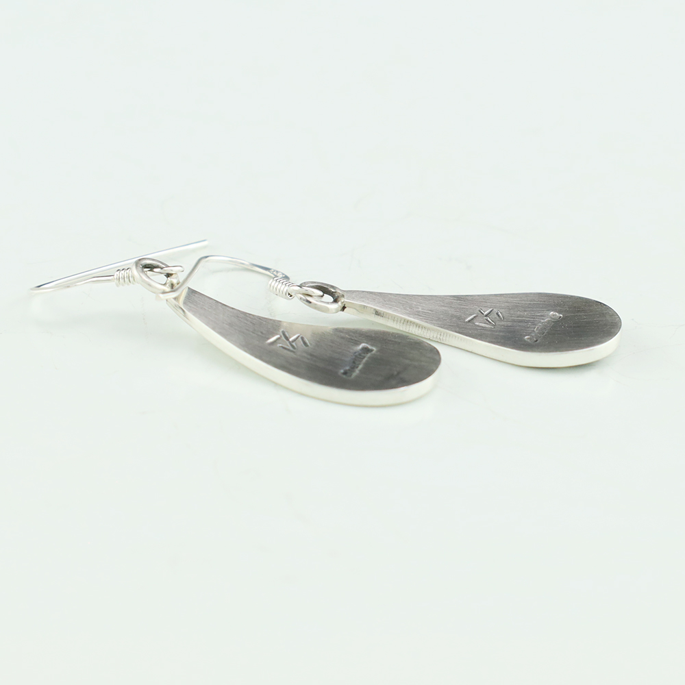 Hopi artist, Darren Seweyestewa created these fabulous earrings through the overlay technique. Hopi overlay is constructed from two layers of sterling silver. A design is cut out with a jeweler’s saw by hand. This top design layer is then silver soldered to another sheet, the bottom layer, of silver. Texturing is added to the bottom layer in all the open areas of the design using a hammer and a small punch. The piece is then formed to its final shape and size. The bottom layer is then oxidized to enhance the design. A unique addition of high-quality craftsmanship to your jewelry wardrobe. Weighs 4 grams. Signed