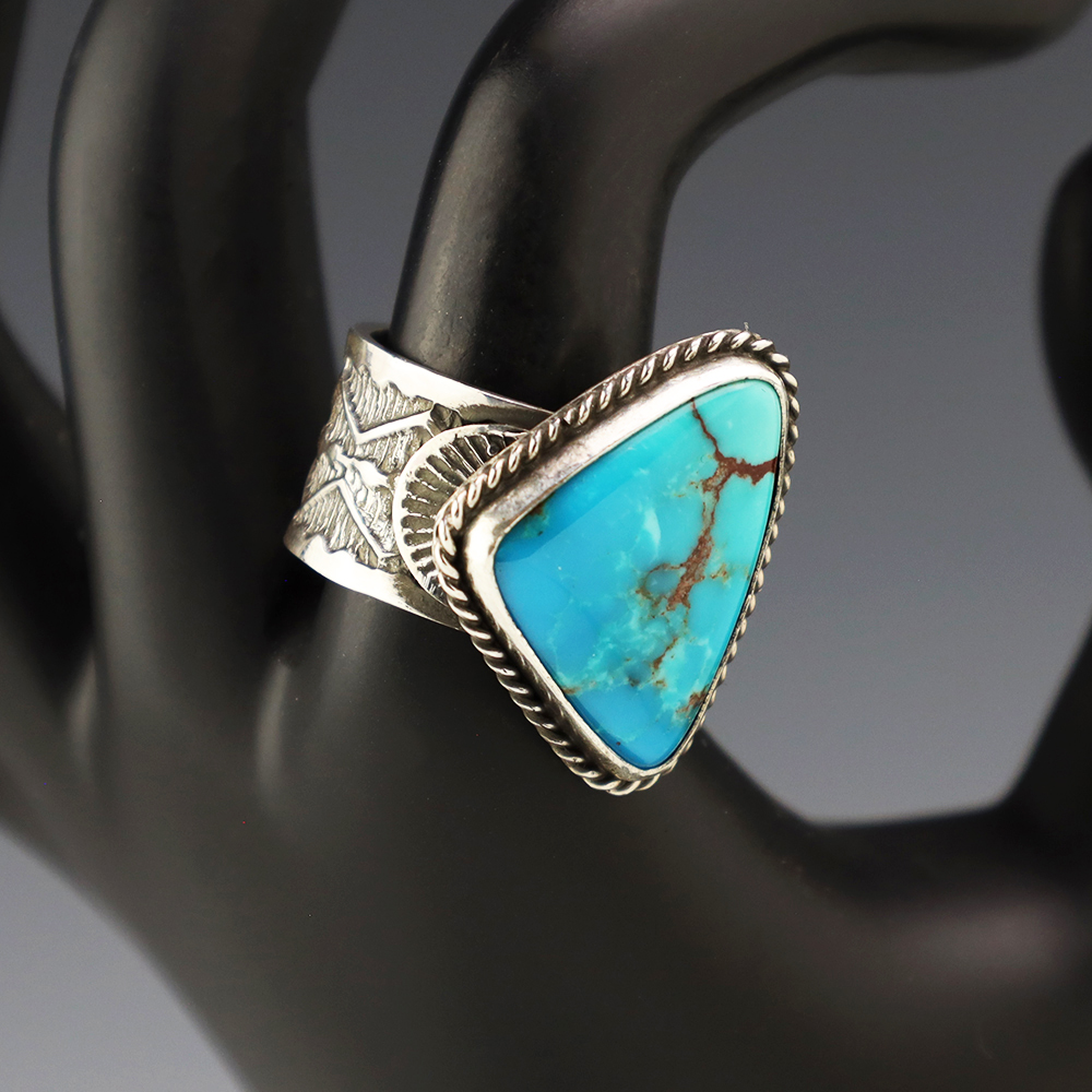 Zuni jewelry makers, Nancy and Sheldon Westika hand crafted this magnificent ring. Made out of sterling silver and inlaid with Kingman Turquoise and Jet. Zuni artists are known for their lapidary work. The Westikas have been making jewelry since the 1970’s and they are known for their fine inlay work. ...
