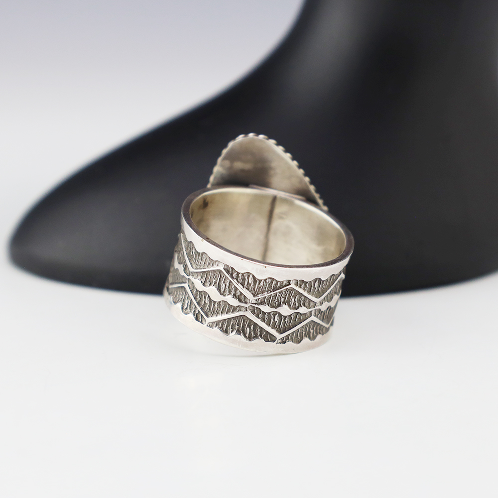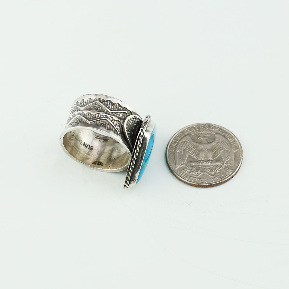 Navajo artist Sunshine Reeves hand crafted this exquisite ring out of sterling silver. Great design. Weighs 14 grams. Signed. Size 10. note-ring measures at size 10, but fits about 9 1/2 because of the width of the band.