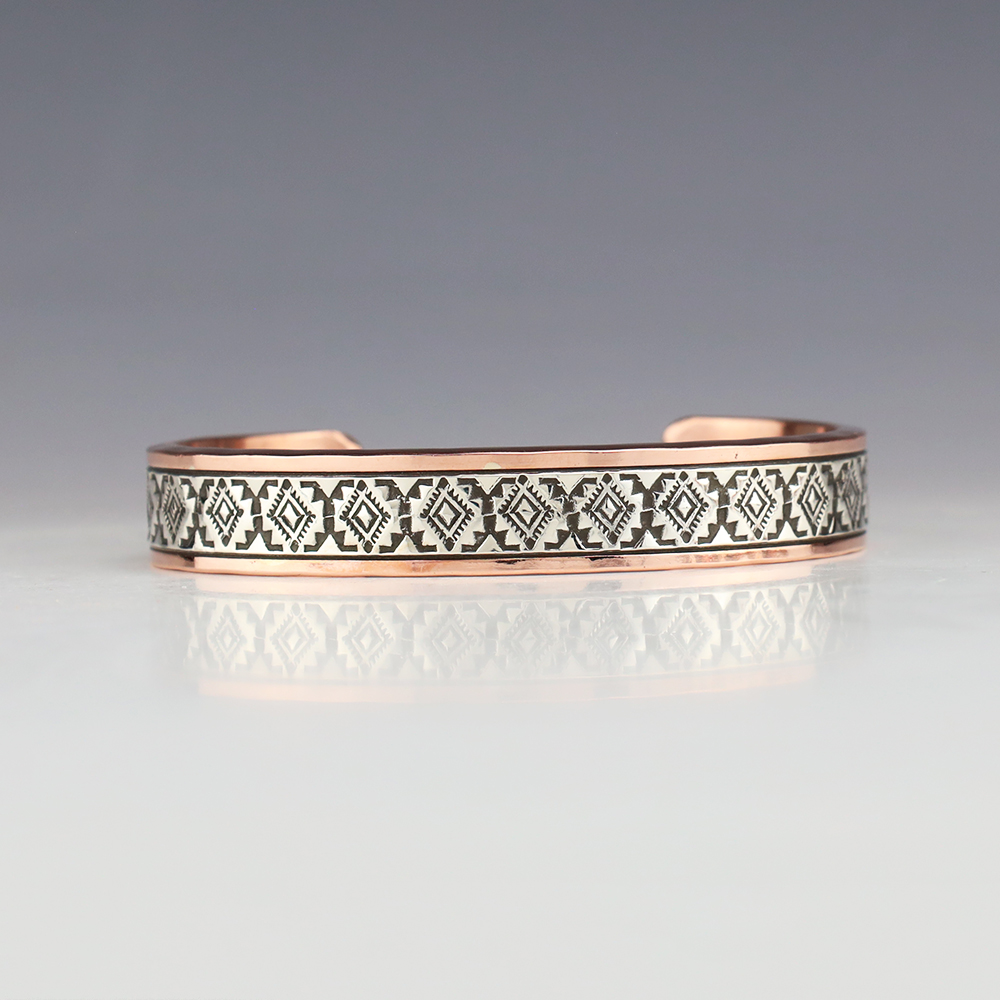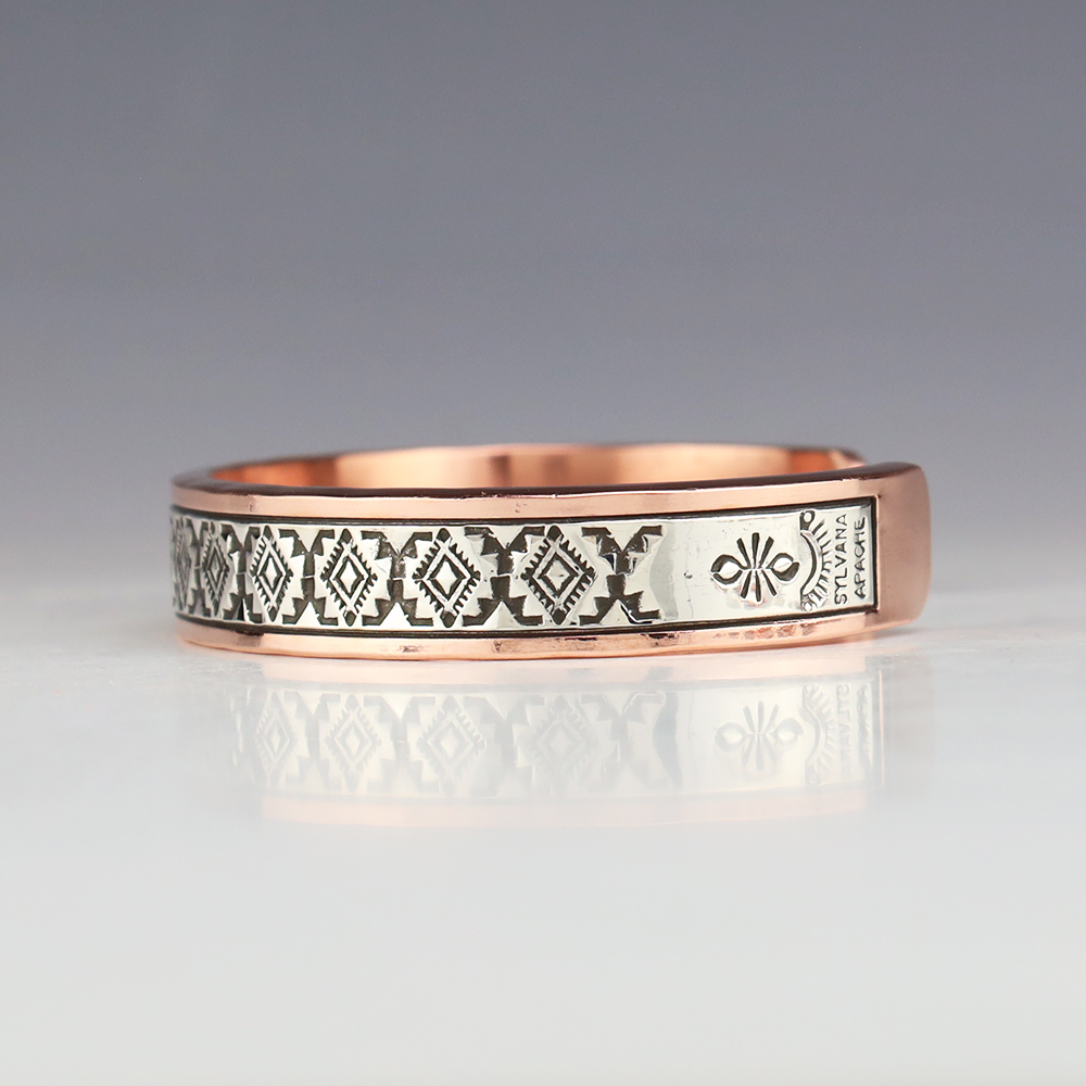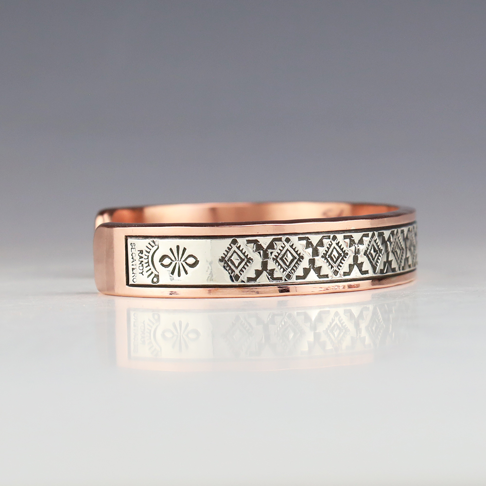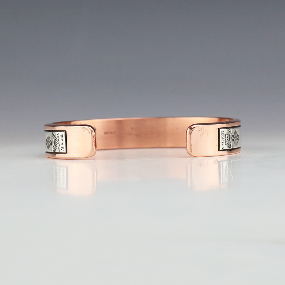 Navajo jewelers Randy Secatero and Sylvana Apache hand crafted this stellar bracelet. Sterling silver and Copper with a traditional hand stamped design. Weighs 66 grams. The entire inner circumference is about 8”, including 1 5/16” opening. (Fits a 8″ wrist) Signed