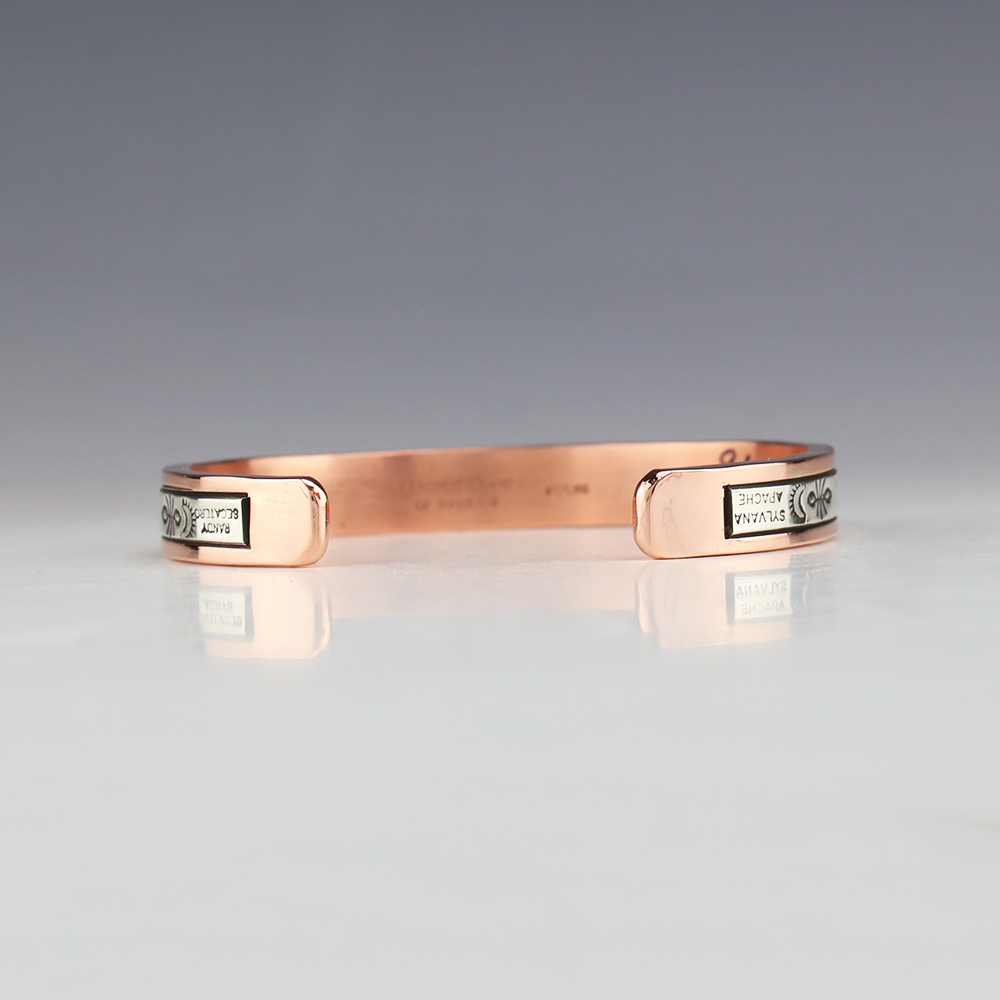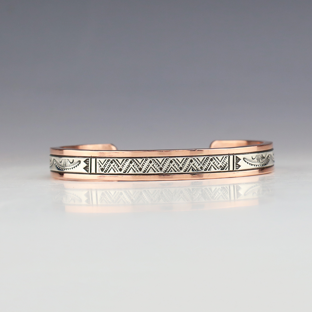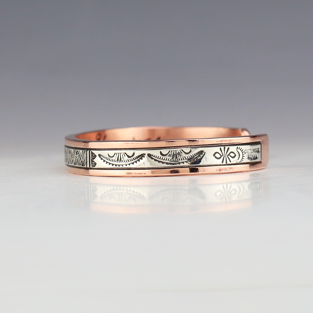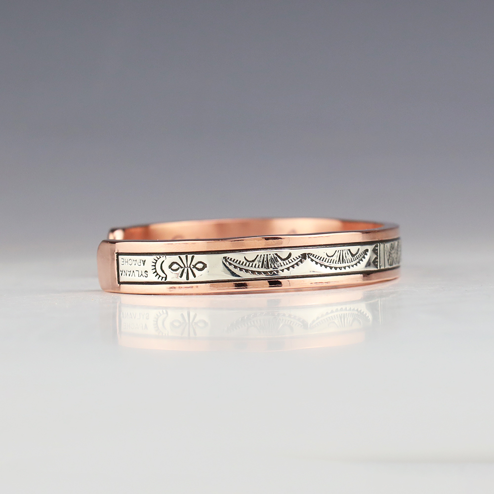 Navajo artists Randy Secatero and Sylvana Apache made this marvelous bracelet. Sterling silver and Copper with a traditional hand stamped design. Weighs 48 grams. The entire inner circumference is about 7 3/4”, including 1 1/4” opening. (Fits a 7 3/4″ wrist) Signed