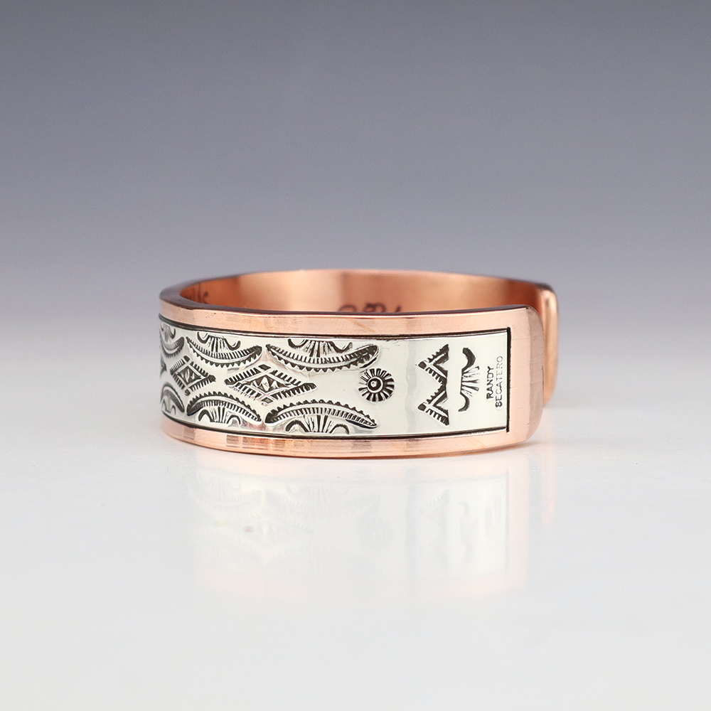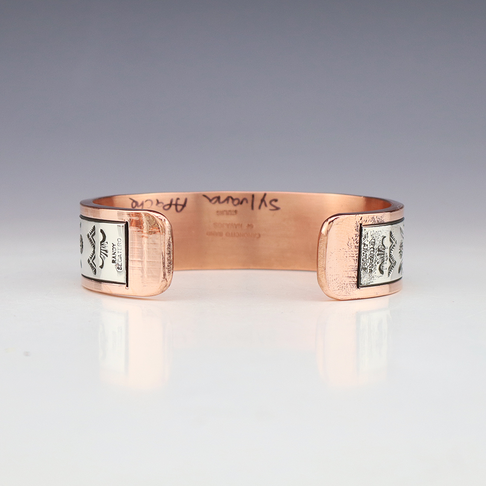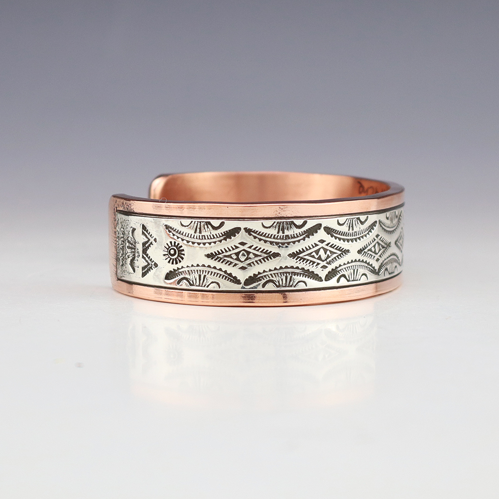 Navajo artists Randy Secatero and Sylvana Apache hand crafted this stellar bracelet. Sterling silver and Copper with a traditional hand stamped design. Weighs 96 grams. The entire inner circumference is about 8”, including 1 3/8” opening. (Fits a 8″ wrist) Signed