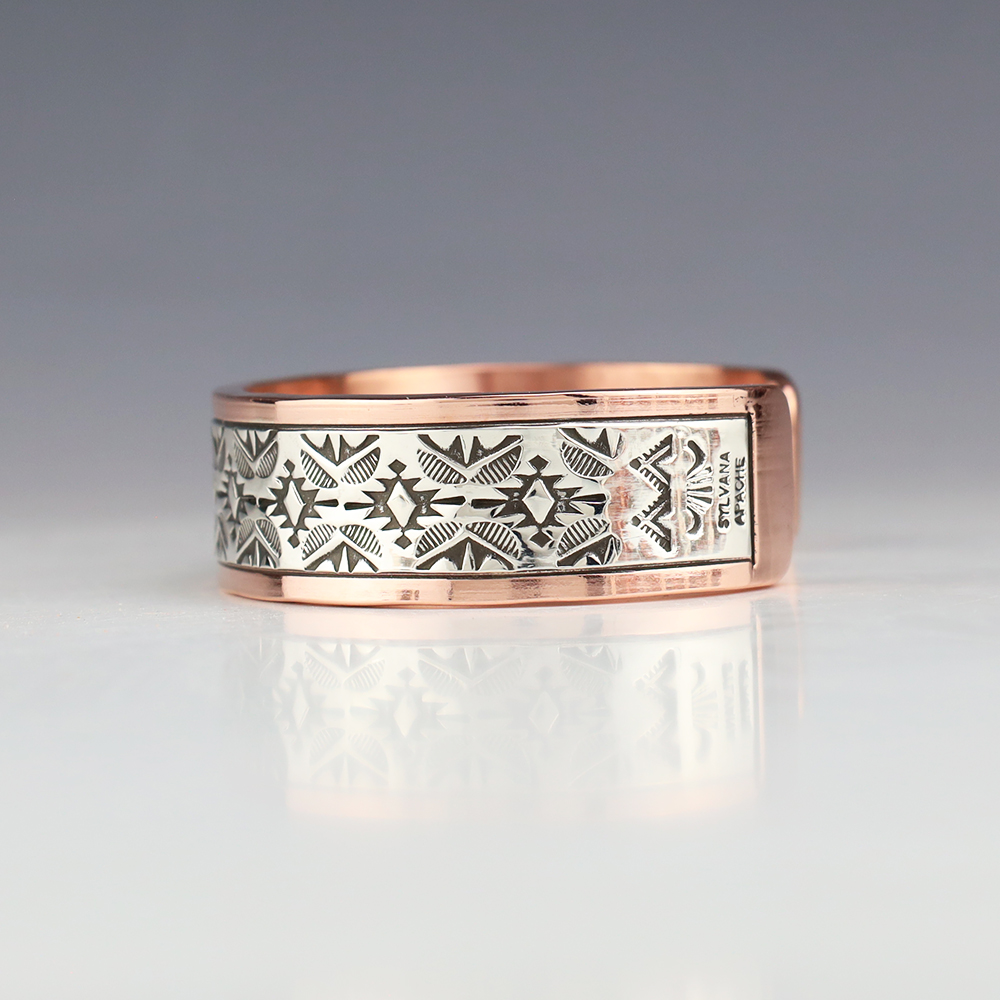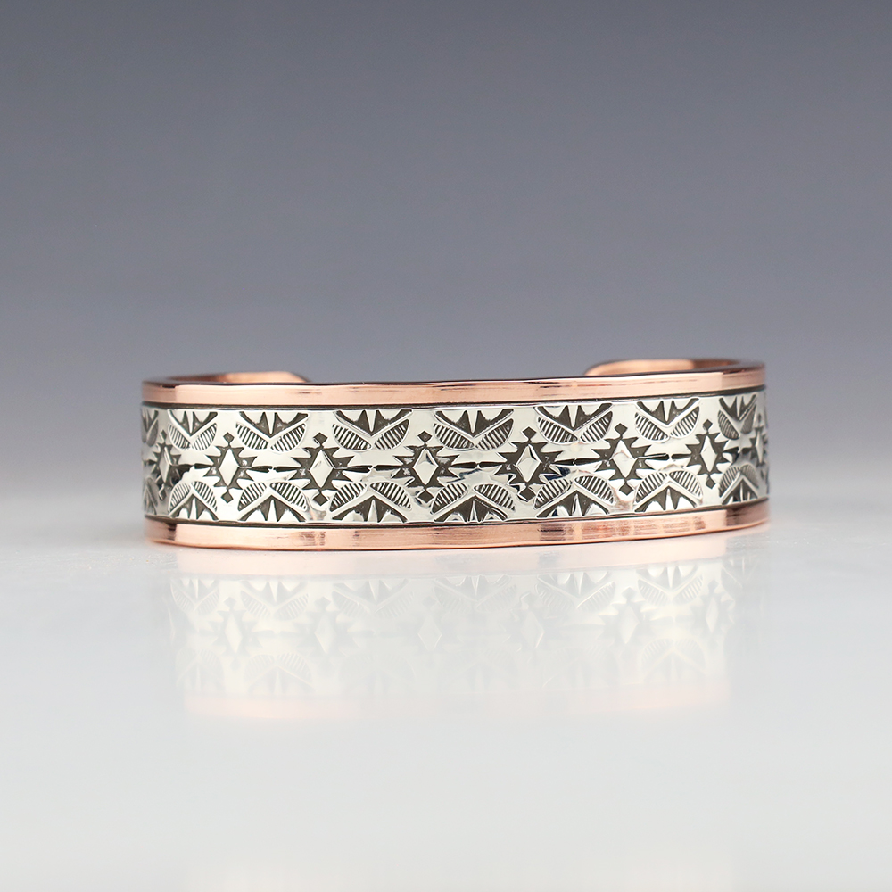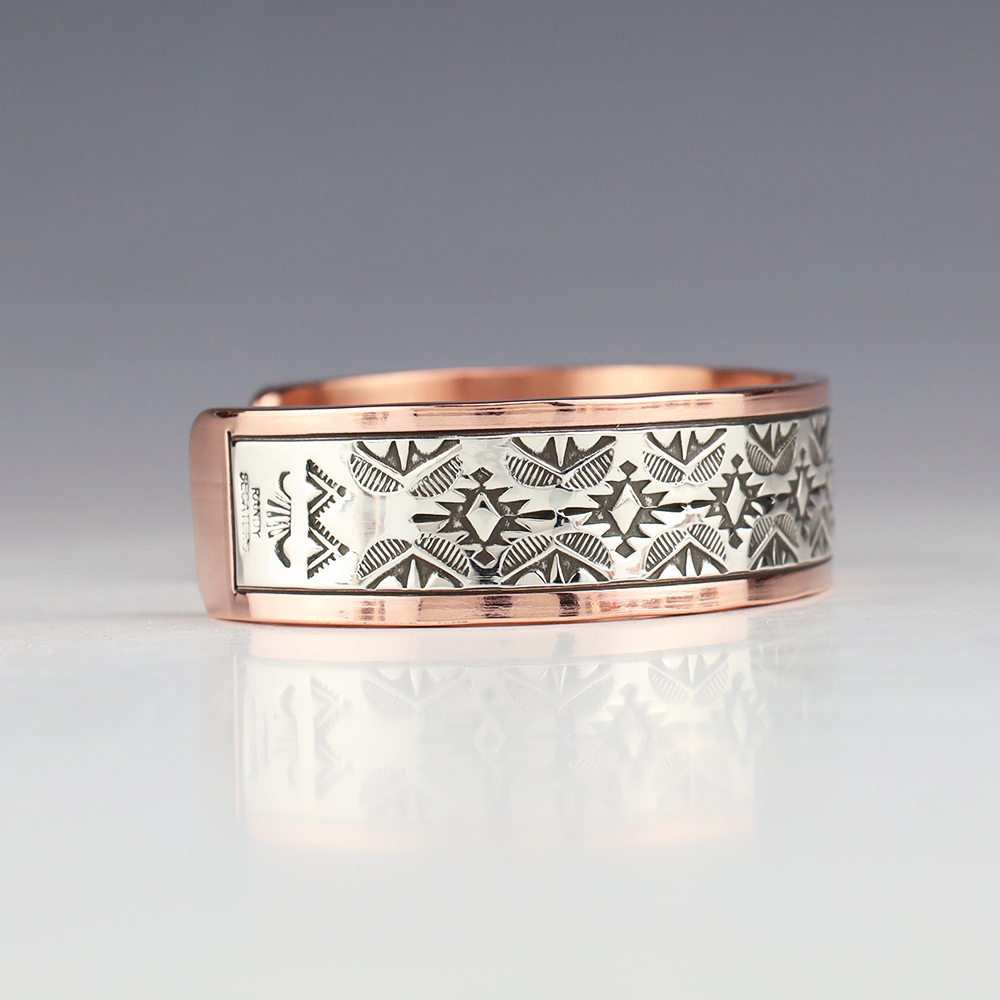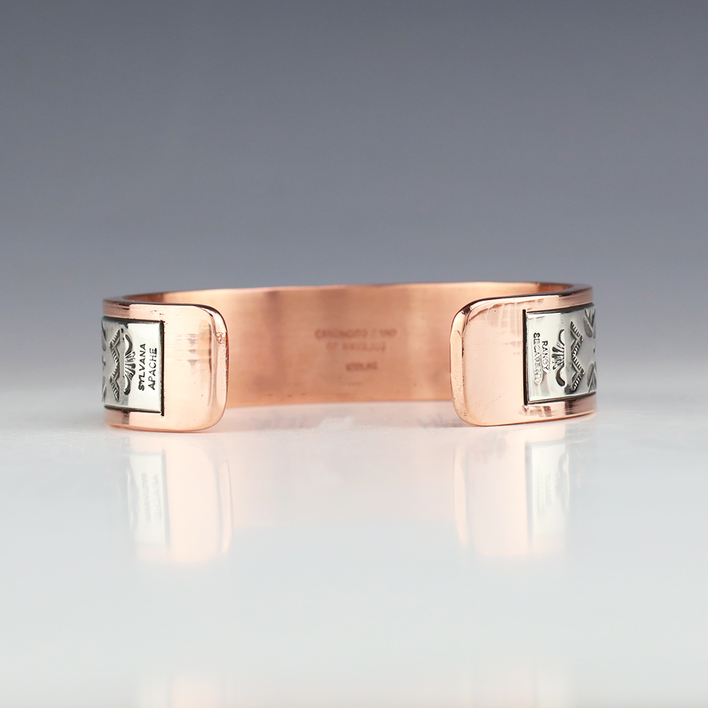 Navajo artists Randy Secatero and Sylvana Apache hand crafted this stellar bracelet. Sterling silver and Copper with a traditional hand stamped design. Weighs 98 grams. The entire inner circumference is about 8”, including 1 1/4” opening. (Fits a 8″ wrist) Signed