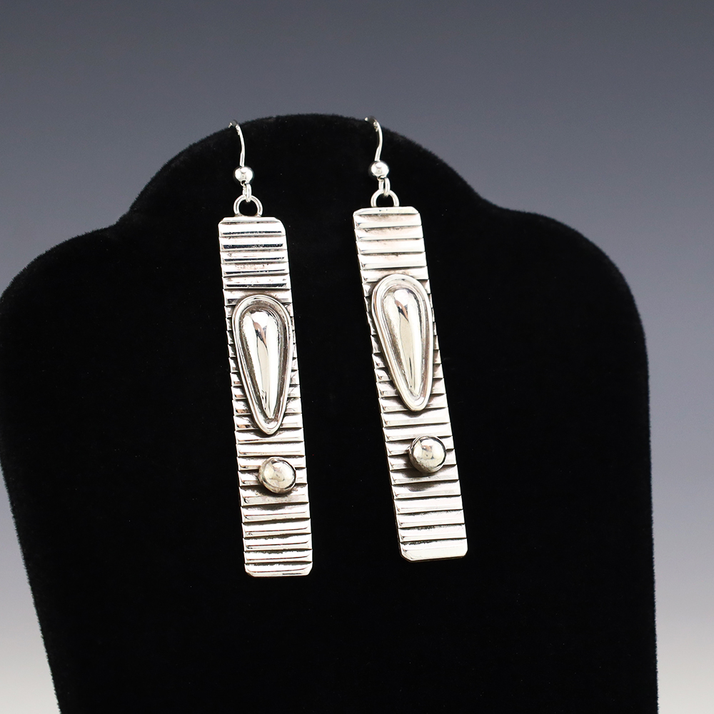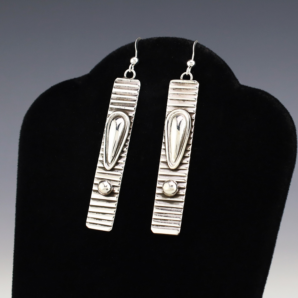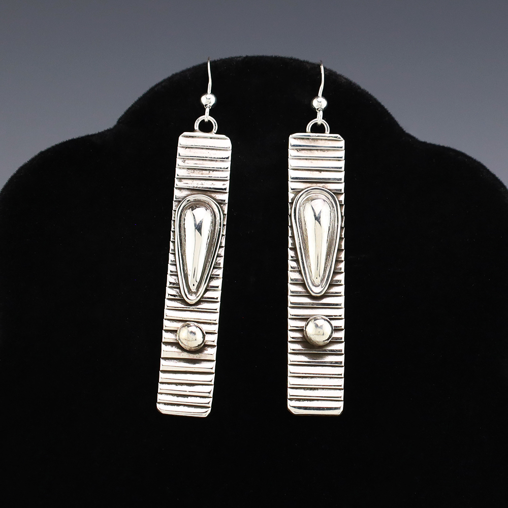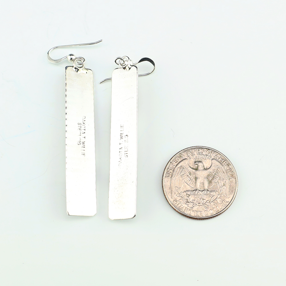 Outstanding dangle earrings hand made out of sterling silver by Navajo silversmith Dakota Willie. These fabulous earrings will become a versatile accessory in your jewelry collection. Weighs 12 grams. Signed