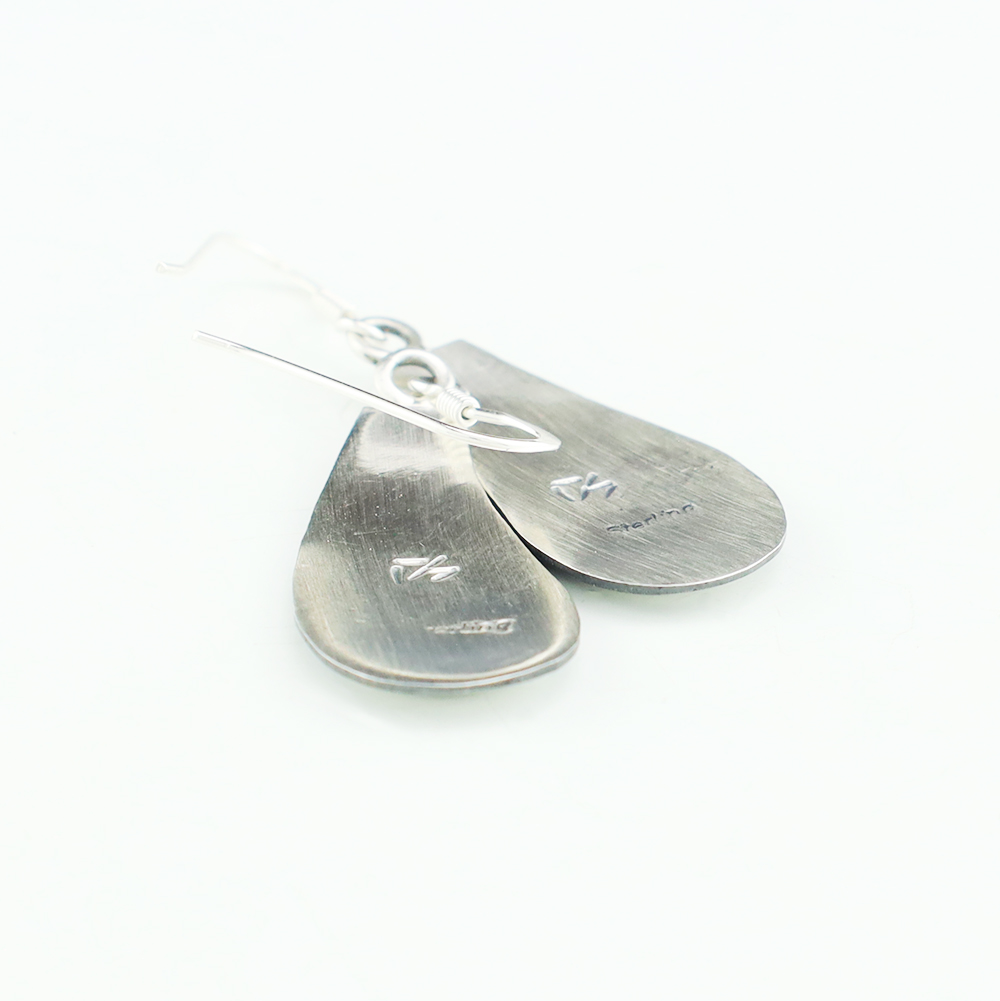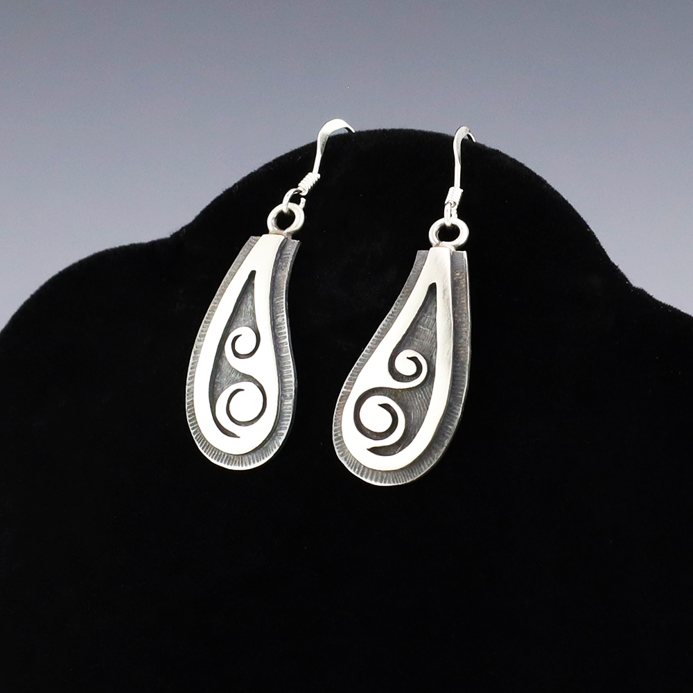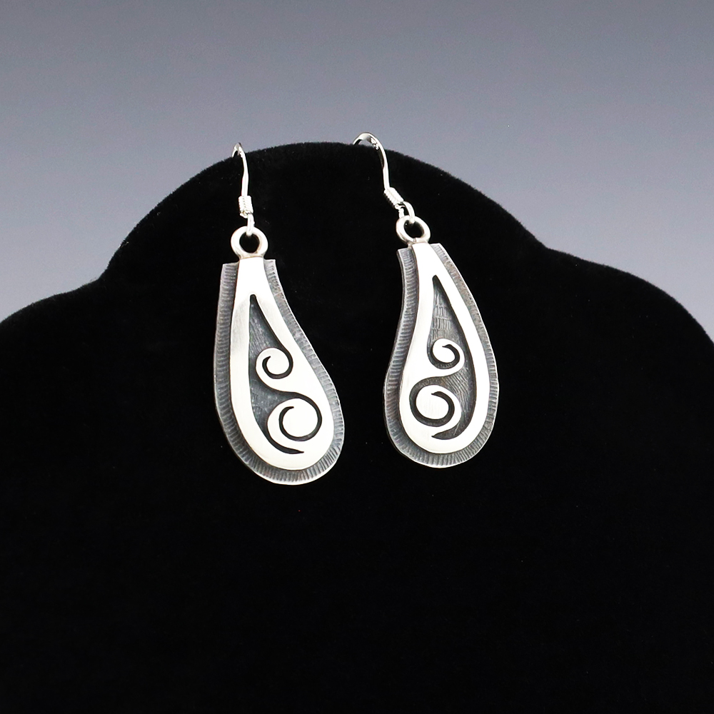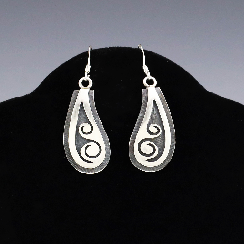 Hopi artist, Darren Seweyestewa created these fabulous earrings through the overlay technique. Hopi overlay is constructed from two layers of sterling silver. A design is cut out with a jeweler’s saw by hand. This top design layer is then silver soldered to another sheet, the bottom layer, of silver. Texturing is added to the bottom layer in all the open areas of the design using a hammer and a small punch. The piece is then formed to its final shape and size. The bottom layer is then oxidized to enhance the design. A unique addition of high-quality craftsmanship to your jewelry wardrobe. Weighs 6 grams. Signed