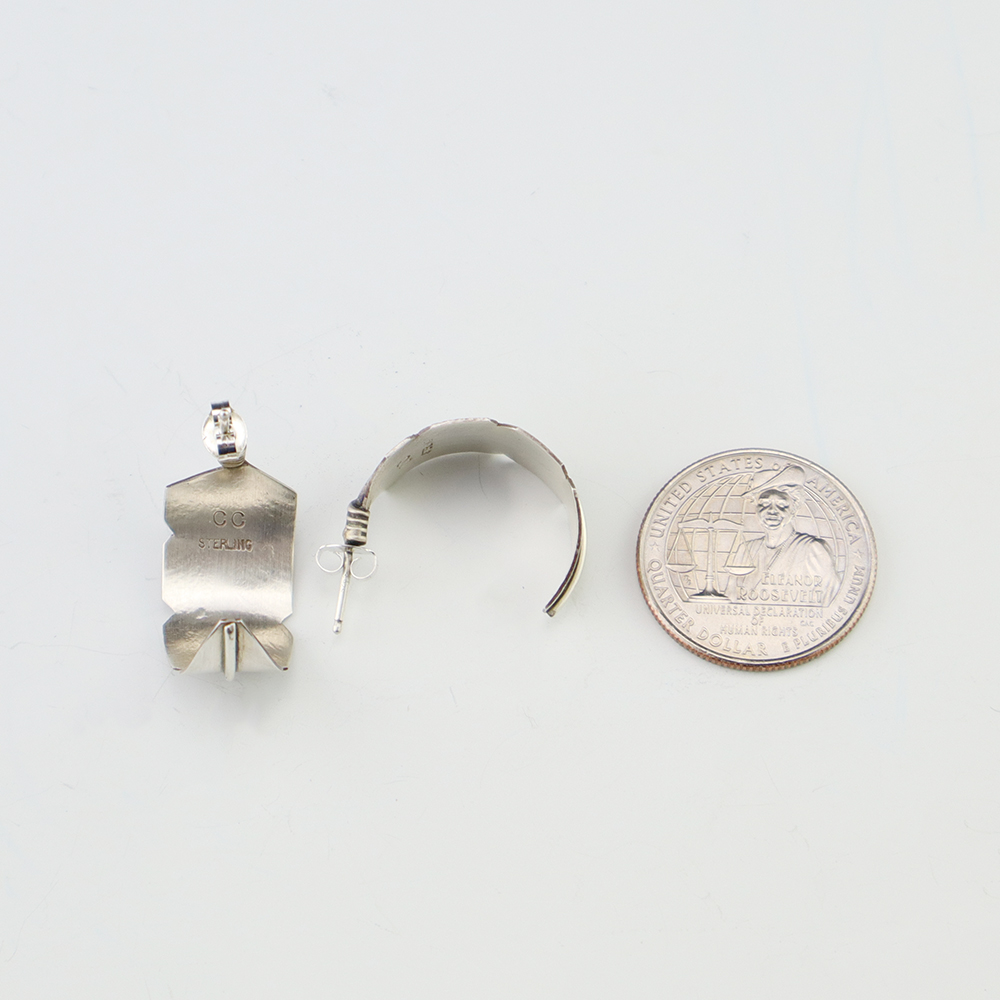 Zuni jewelry makers, Nancy and Sheldon Westika created these gorgeous earrings. The Westikas have been making jewelry since the 1970’s and they are known for their fine inlay work. Made out of sterling silver and inlaid with Kingman Turquoise. Weighs 2 grams. Signed 7/16” wide x 7/8” tall 1 1/4″...