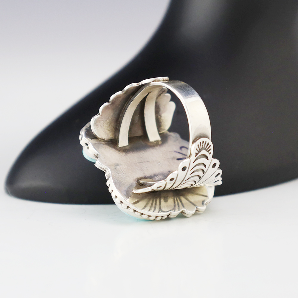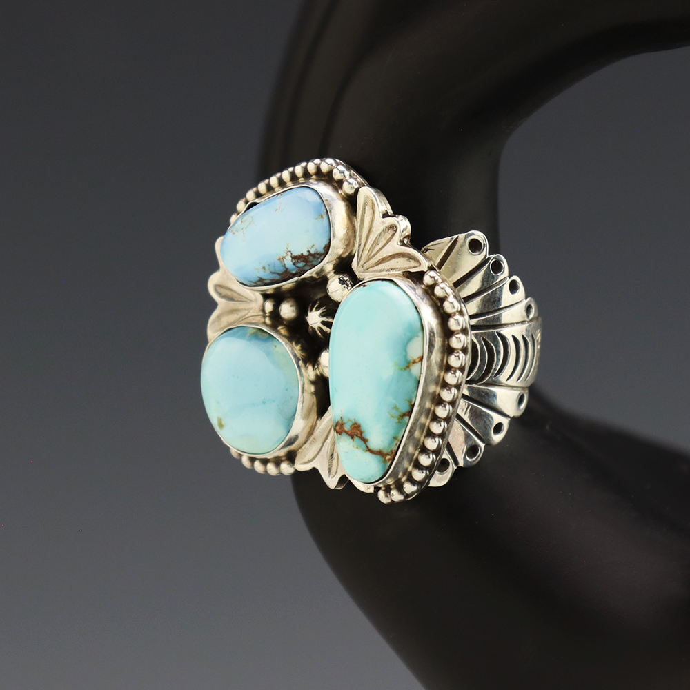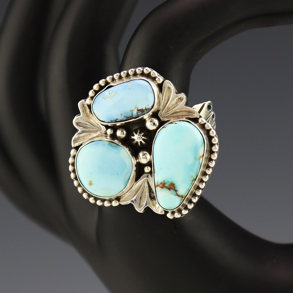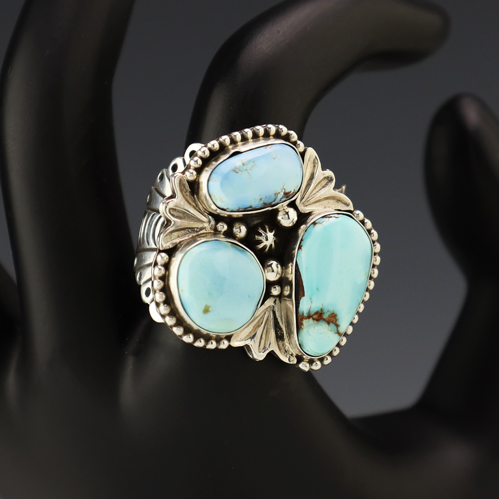 This ring is a great representation of hand made Navajo jewelry and will make a statement on your hand. Beautiful pieces of Golden Hills Turquoise are set into a sterling silver setting. Handmade by Navajo artist Eula Wylie. Weighs 16 grams. Size 8 1/2.