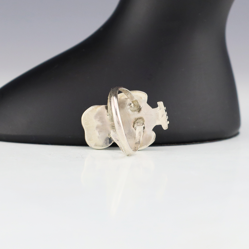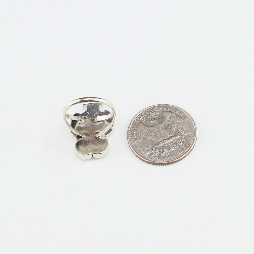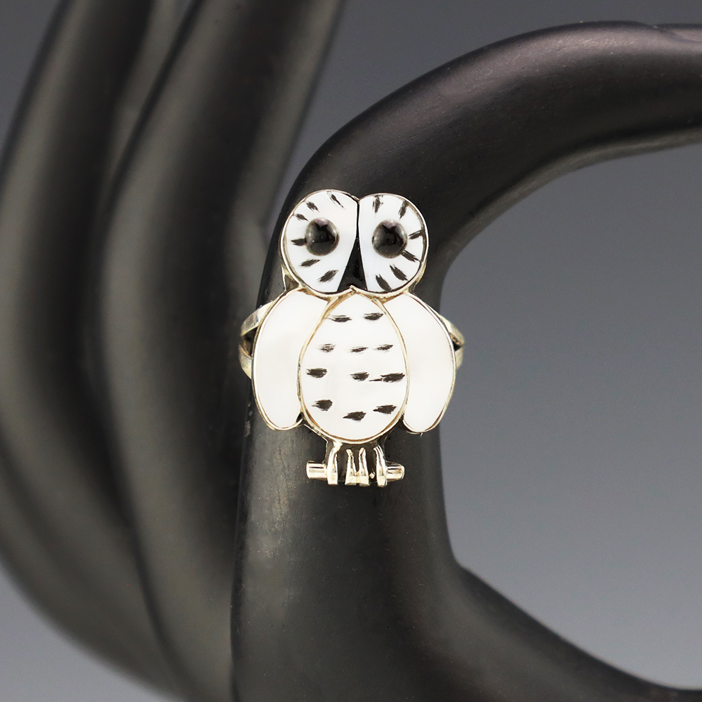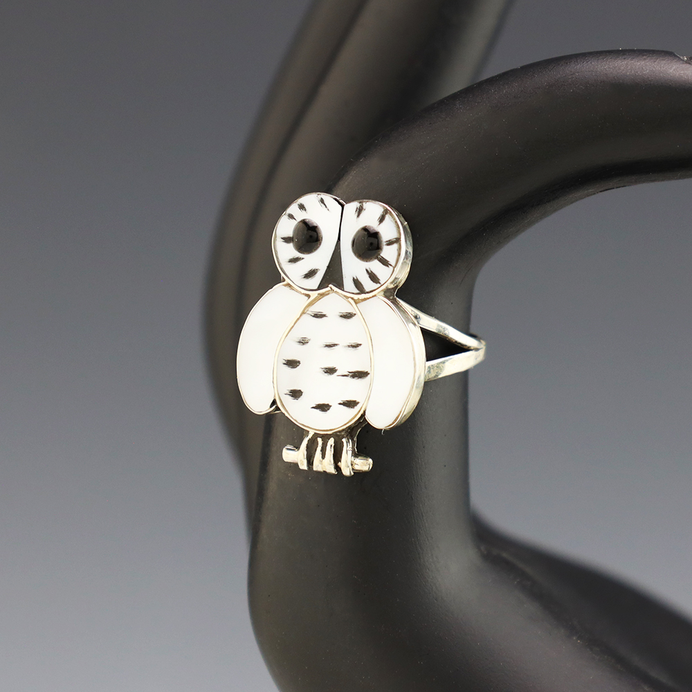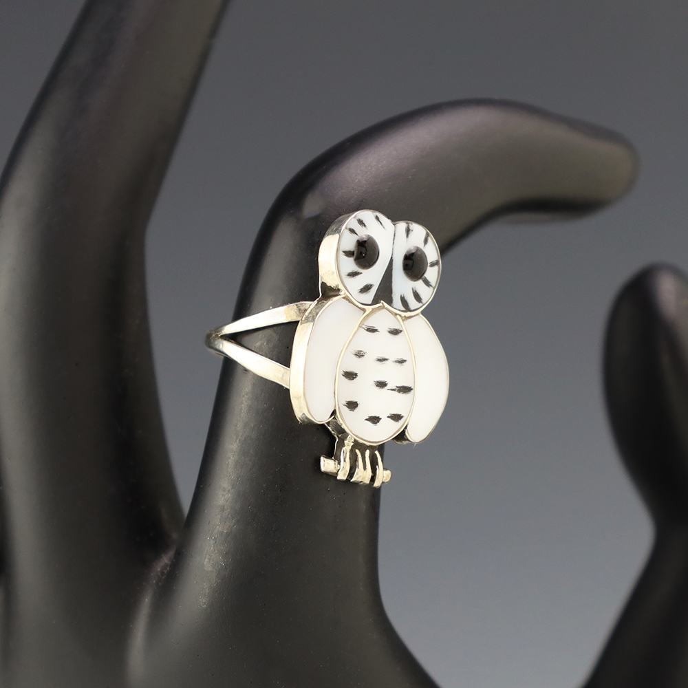 Zuni artist Regina Kallestewa hand crafted this lovely owl ring. Zuni artists are known for their fine lapidary skills. Each stone is hand cut, polished, and set into a sterling silver setting. The ring is set with Mother of Pearl Shell and Jet. Weighs 4 grams. Size 5 3/4.