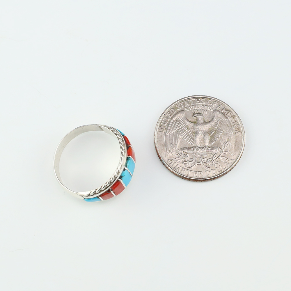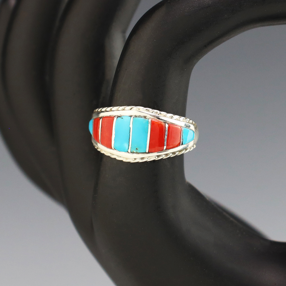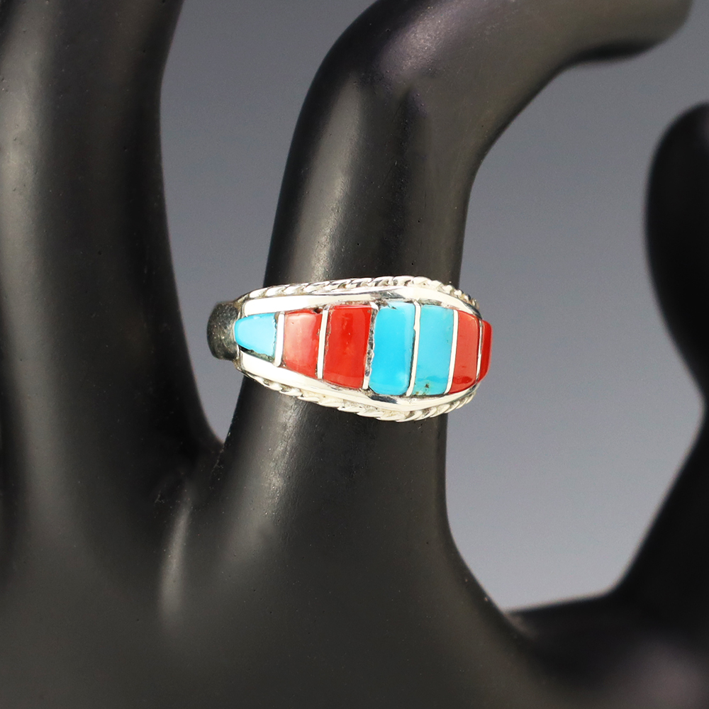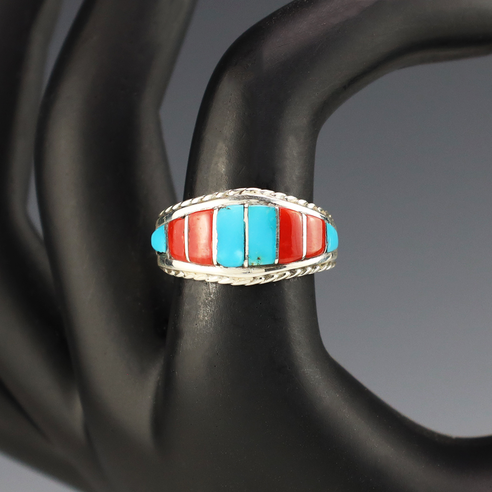 Zuni artists are known for their fine lapidary skills. Each stone is hand cut, polished, and inlaid into a sterling silver setting. The ring is set with Turquoise and Coral stones. Hand made by Zuni artist Mirenda Peynetsa. Weighs 4 grams. Size 8. Signed