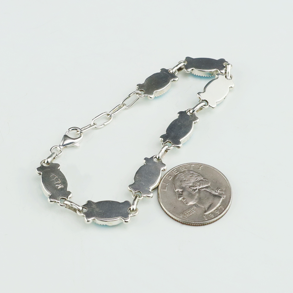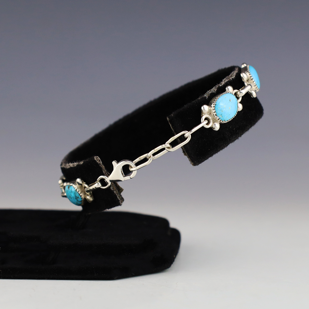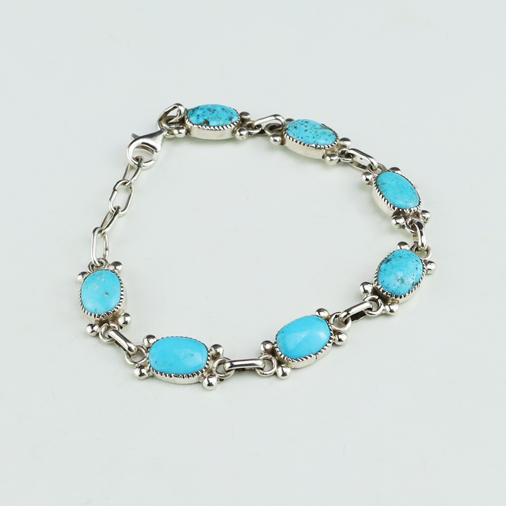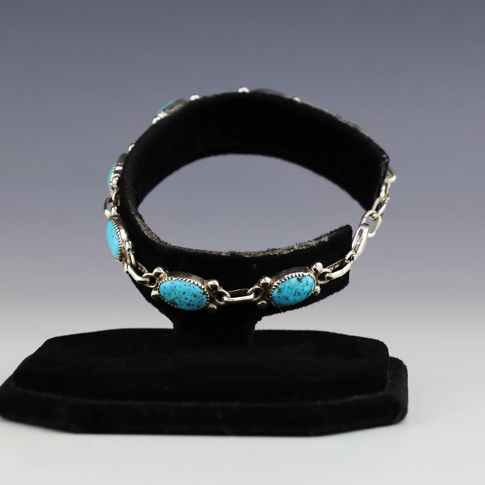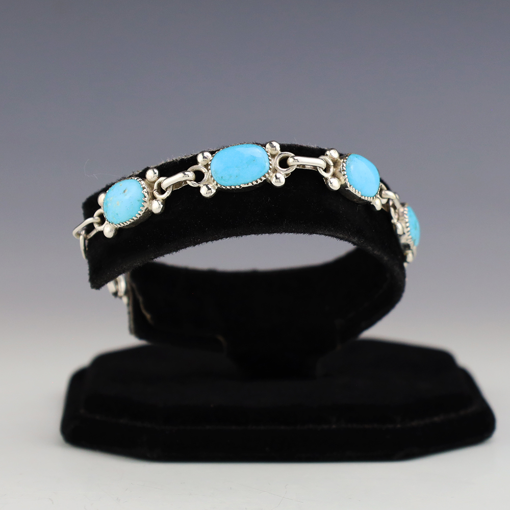 Zuni jeweler Diane Lonjose hand crafted this lovely link bracelet. The bracelet is sterling silver and is set with natural Kingman Turquoise stones. The components are all hand fabricated, and the stones are all natural. Diane comes from a family of Zuni jewelers. She is the daughter of Alice and Duane Quam, and grandchild of Doris and Warren Ondelacy. Weighs 12 grams. Signed.
