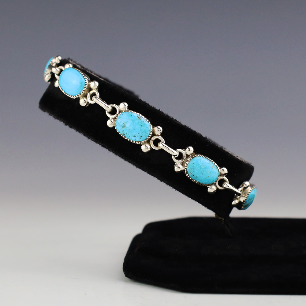 Zuni jeweler Diane Lonjose hand crafted this lovely link bracelet. The bracelet is sterling silver and is set with natural Kingman Turquoise stones. The components are all hand fabricated, and the stones are all natural. Diane comes from a family of Zuni jewelers. She is the daughter of Alice and Duane Quam, and grandchild of Doris and Warren Ondelacy. Weighs 12 grams. Signed.