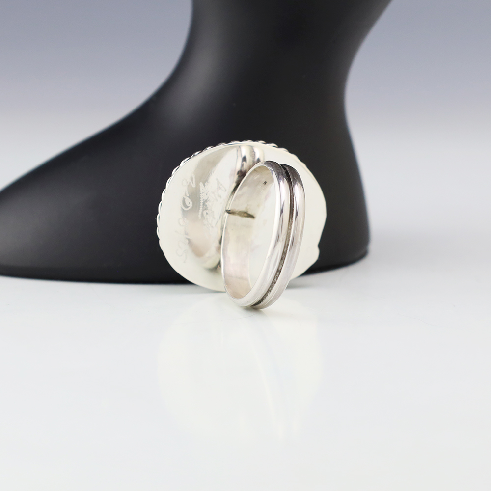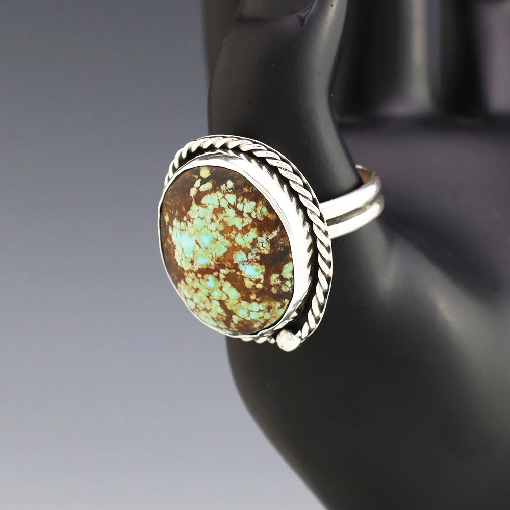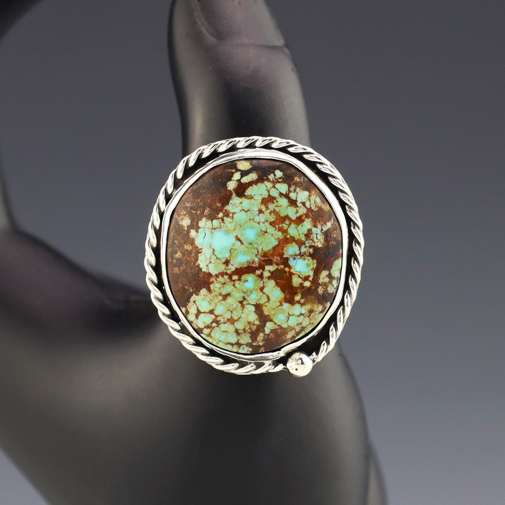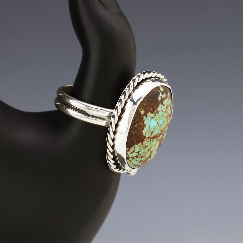 Zuni artists are known for their fine lapidary skills. Each stone is hand cut, polished, and set into a sterling silver setting. The ring is set with a Number Eight Turquoise stone. Hand made by Zuni artist Brian Yatsattie. Brian cuts his own stones. Weighs 14 grams. Size 12 1/2. Signed