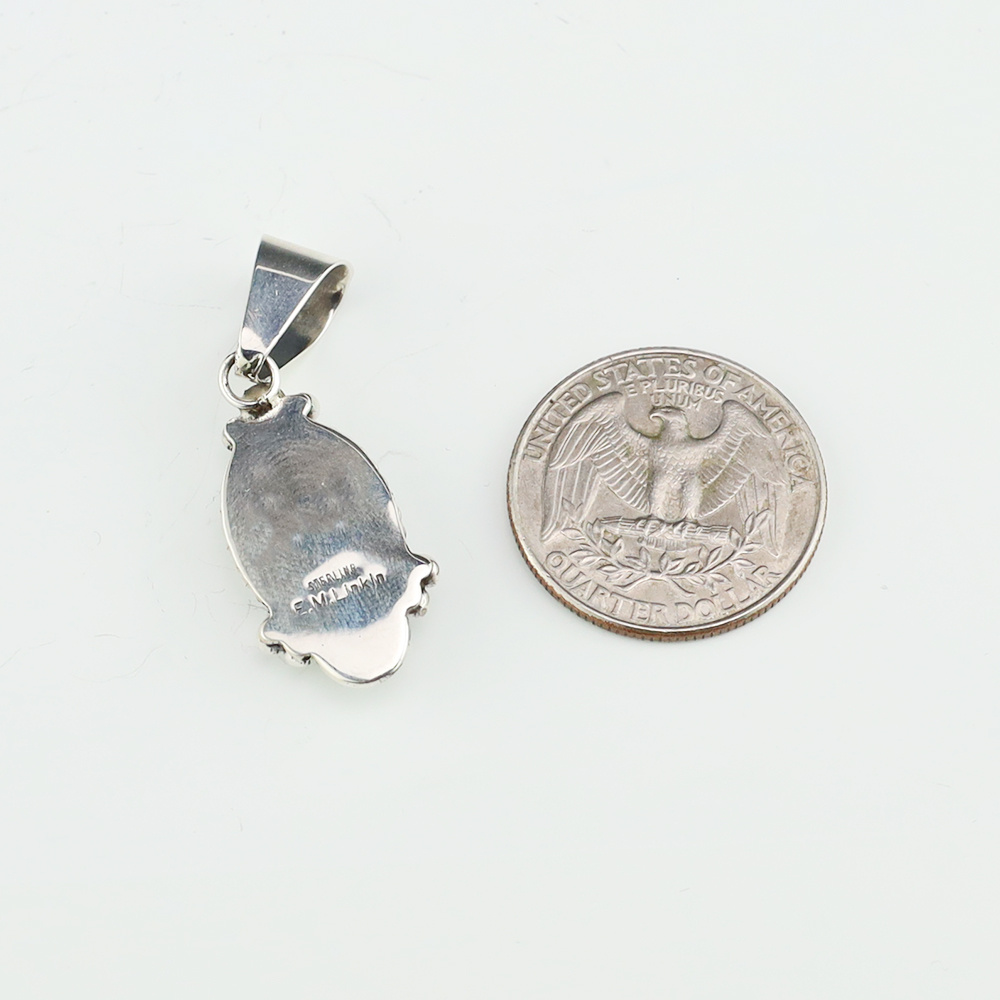 Zuni fetish carver Brian Yatsattie created this stunning seahorse pendant. Hand carved out of Mother of Pearl Shell with Turquoise inlaid eyes. Amazing detail is carved throughout the pedant. A wonderful addition to your Native American jewelry or fetish collection. Weighs 20 grams. 2 1/4” tall x 3/4” long x...
