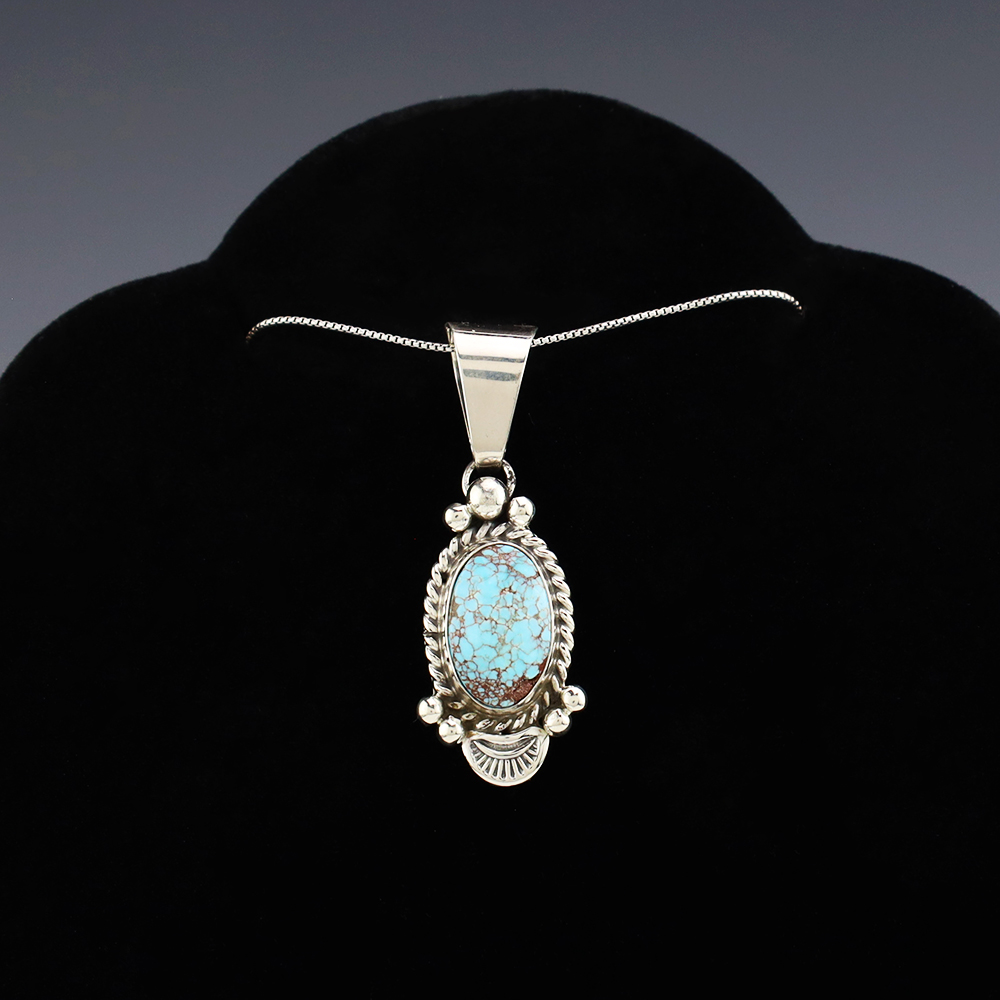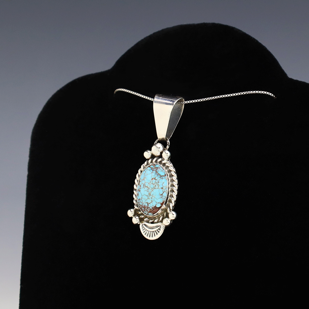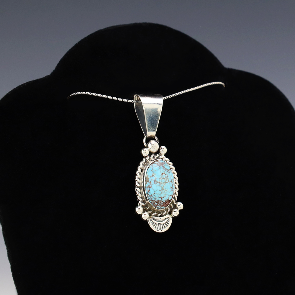 Lovely pendant hand made out of sterling silver and Prince Turquoise by Navajo artist Ella Linkin. A timeless beauty that you will enjoy for years to come. Weighs 4 grams. Signed (Chain not included)