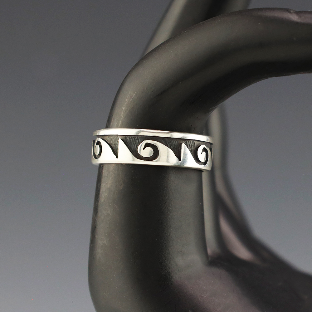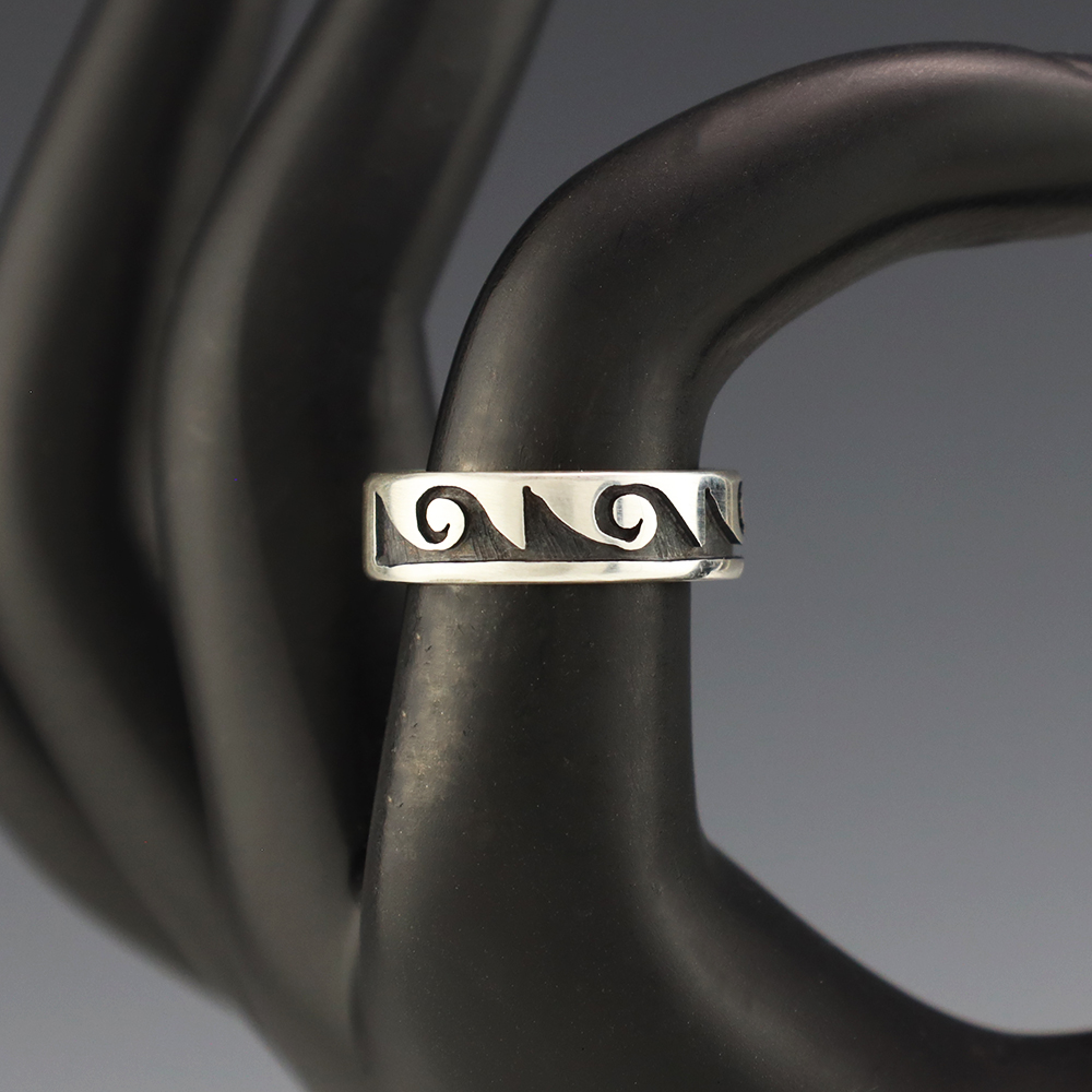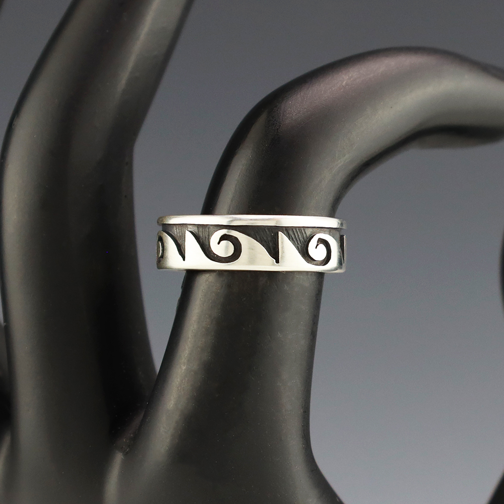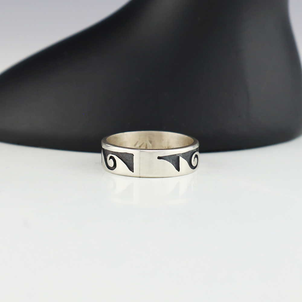 Hopi artist Darren Seweyestewa created this wonderful ring through the overlay technique. Hopi overlay is constructed from two layers of sterling silver. A design is cut out with a jeweler’s saw by hand. This top design layer is then silver soldered to another sheet, the bottom layer, of silver. Texturing is added to the bottom layer in all the open areas of the design using a hammer and a small punch. The piece is then formed to its final shape and size. The bottom layer is then oxidized to enhance the design. A unique addition of high-quality craftsmanship to your jewelry wardrobe. Weighs 4 grams. Size 7. Signed
