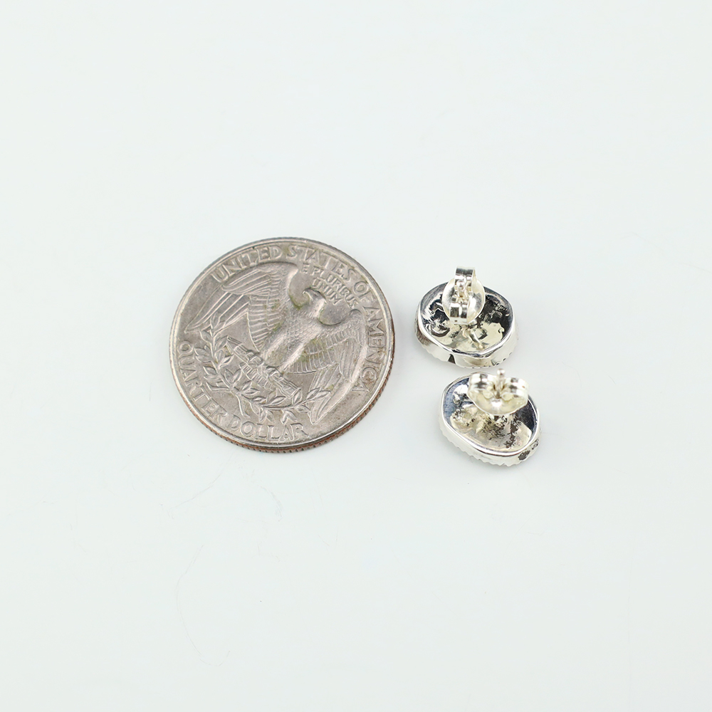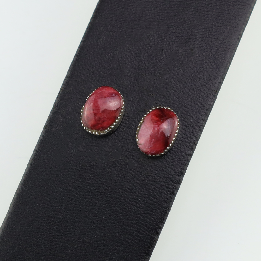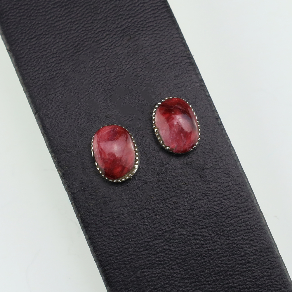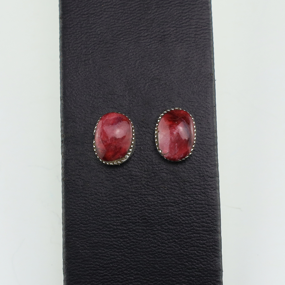 Zuni artist, Diane Lonjose created these lovely earrings. Made out of sterling silver and set with Spiny Oyster. The components are all hand fabricated and the stones are all natural. Diane comes from a family of Zuni jewelers. She is the daughter of Alice and Duane Quam, and grandchild of Doris and Warren Ondelacy. Weighs 2 gram. Signed