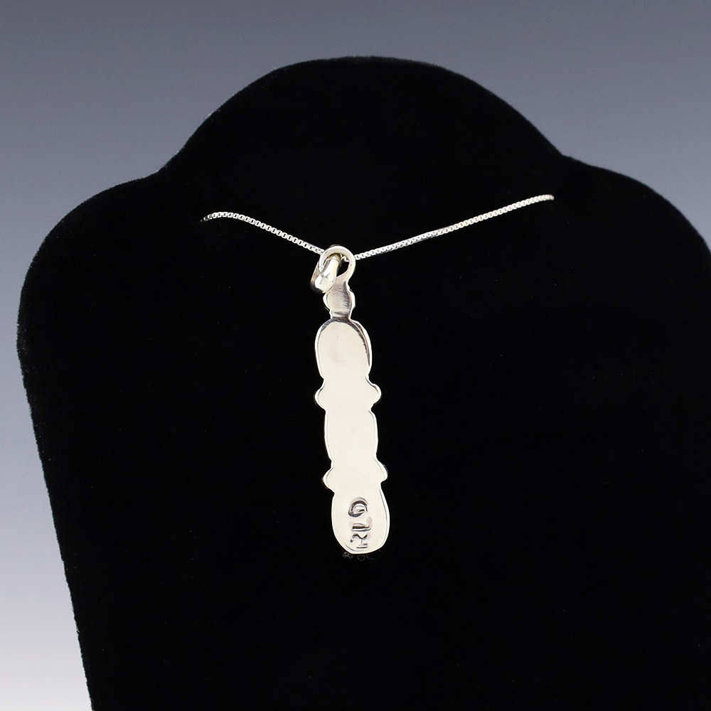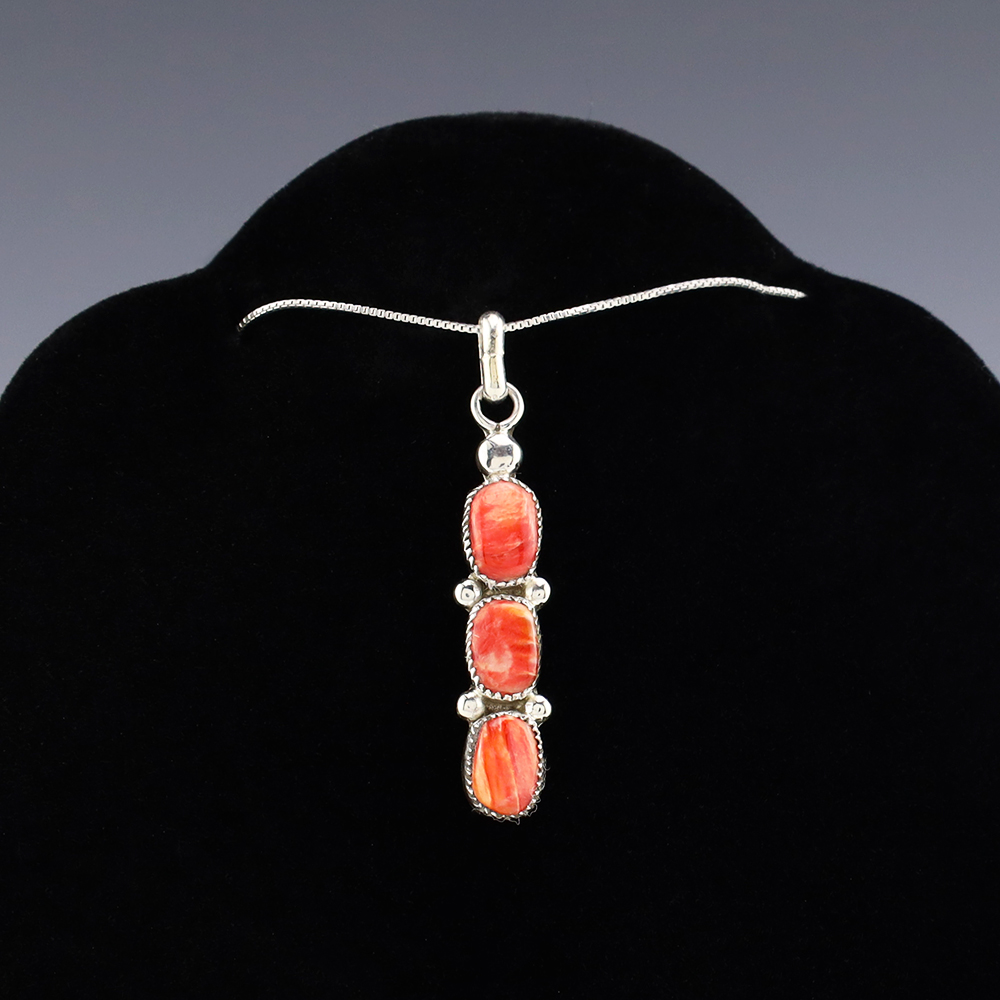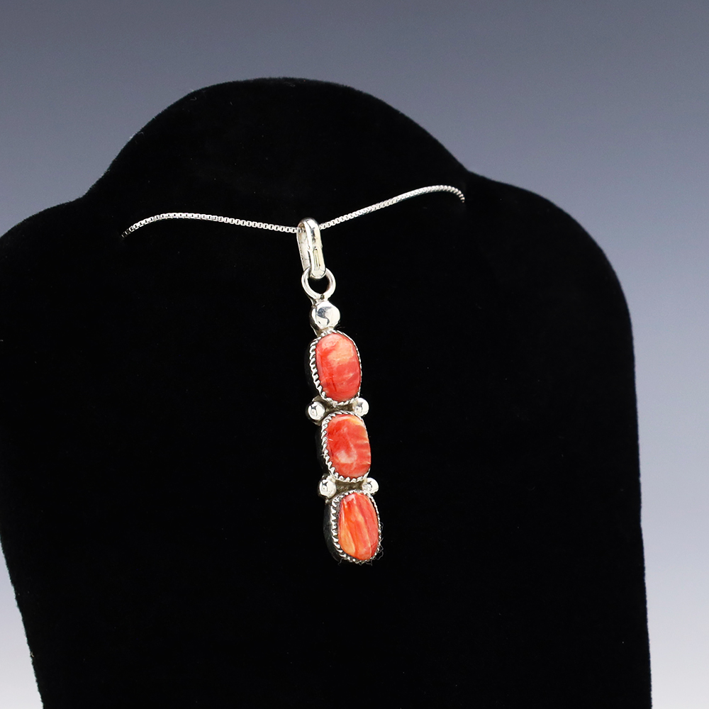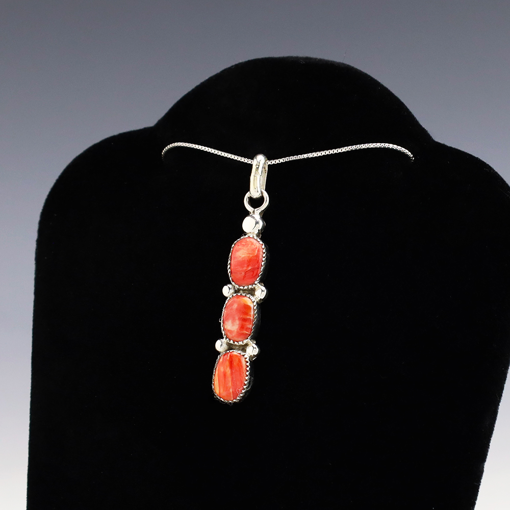 Zuni artist Diane Lonjose hand made this beautiful pendant. Made out of sterling silver and Spiny Oyster. The components are all hand fabricated, and the stones are all natural. Diane comes from a family of Zuni jewelers. She is the daughter of Alice and Duane Quam, and grandchild of Doris and Wayne Ondelacy. Weighs 4 grams. Signed (Chain not included)