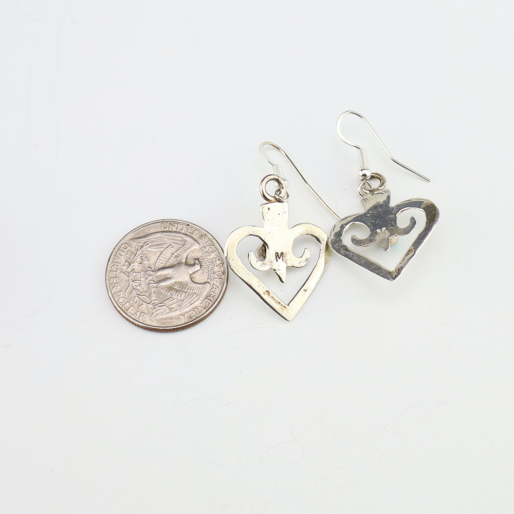 Outstanding sterling silver earrings with Mother of Pearl Shell and Turquoise inlay. Hand crafted by Zuni jewelry makers, Nancy and Sheldon Westika. The Westikas have been making jewelry since the 1970’s and they are known for their fine inlay work. Weighs 6 grams. Signed 7/8” wide x 7/8” tall 1 ...