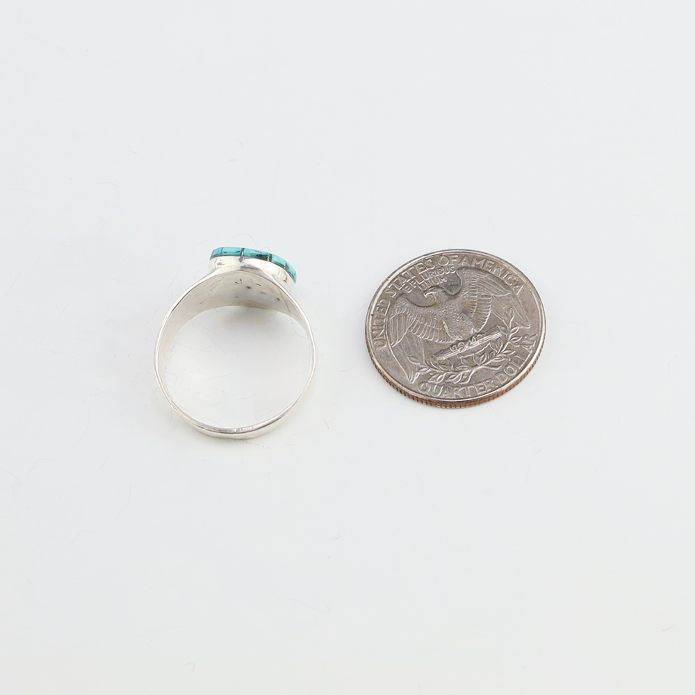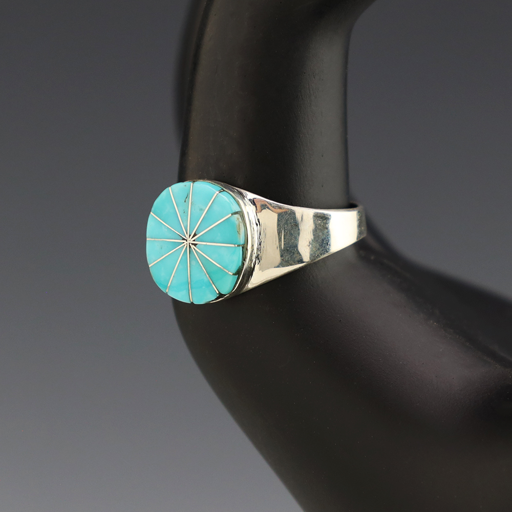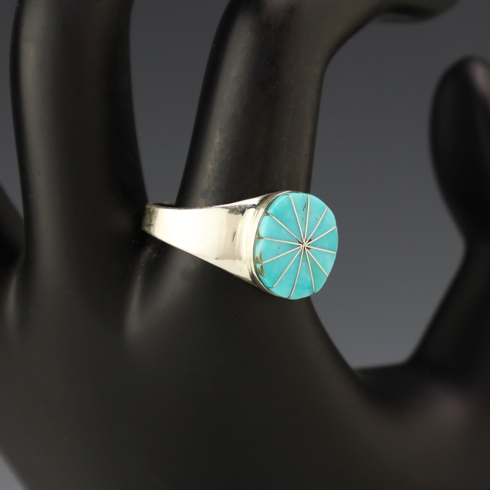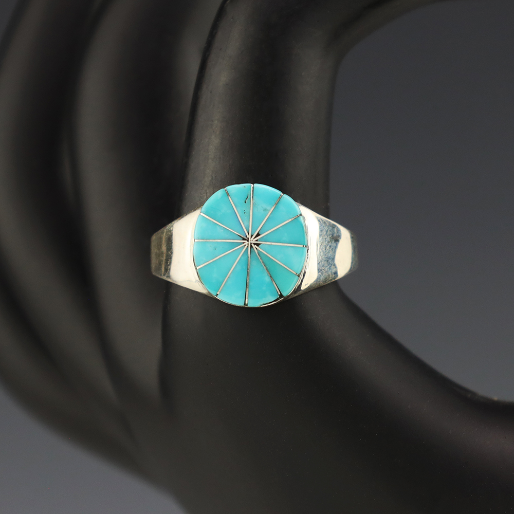 Zuni jewelry makers, Nancy and Sheldon Westika hand crafted this magnificent ring. Made out of sterling silver and inlaid with Kingman Turquoise and Jet. Zuni artists are known for their lapidary work. The Westikas have been making jewelry since the 1970’s and they are known for their fine inlay work. ...