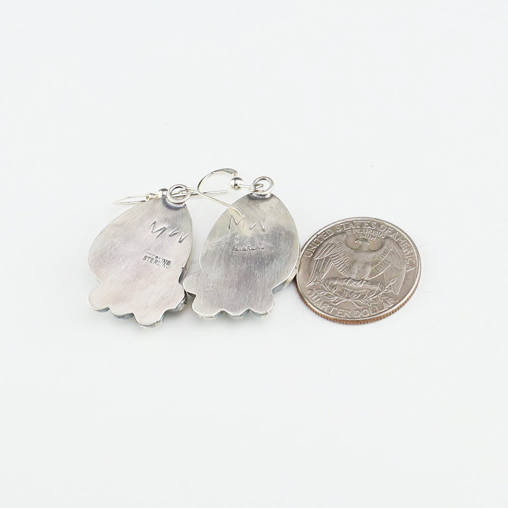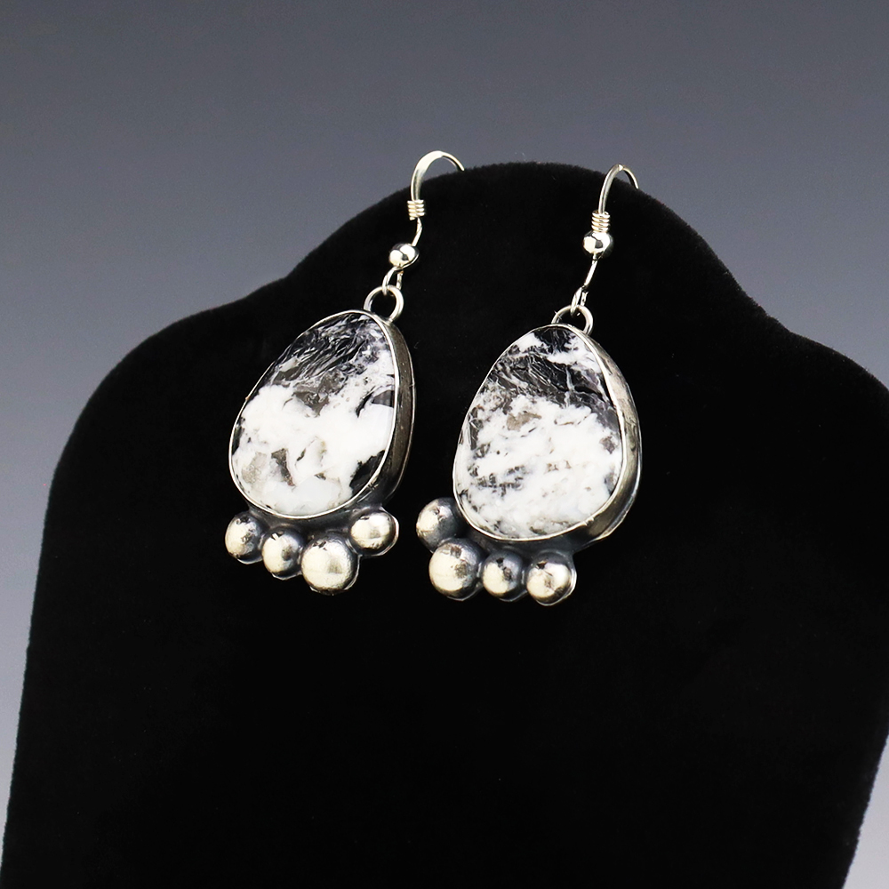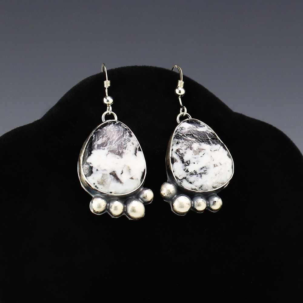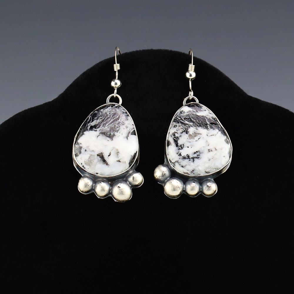 Gorgeous dangle earrings made out of sterling silver and set with White Buffalo stones. Hand made by Navajo artist Miranda Willie. These fabulous earrings will become a versatile accessory in your jewelry collection. Weighs 14 grams. Signed.