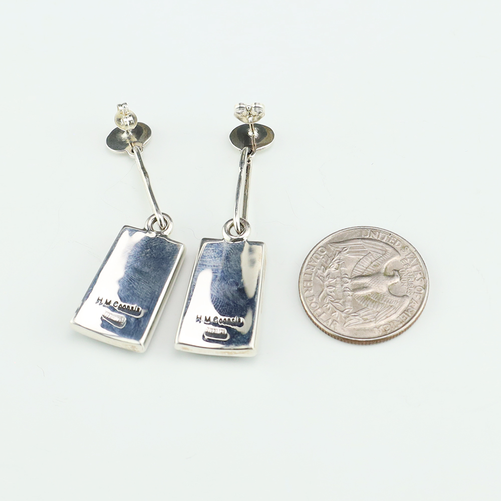 Gorgeous earrings hand made out of sterling silver and turquoise. Hand made by Navajo silversmiths Eva and Linberg Billah. These fabulous earrings will become a versatile accessory in your jewelry collection. Weighs 14 grams. Signed. 1 1/8″ x 1 3/4″ With ear wires are 2 1/4” in length. The Navajos...
