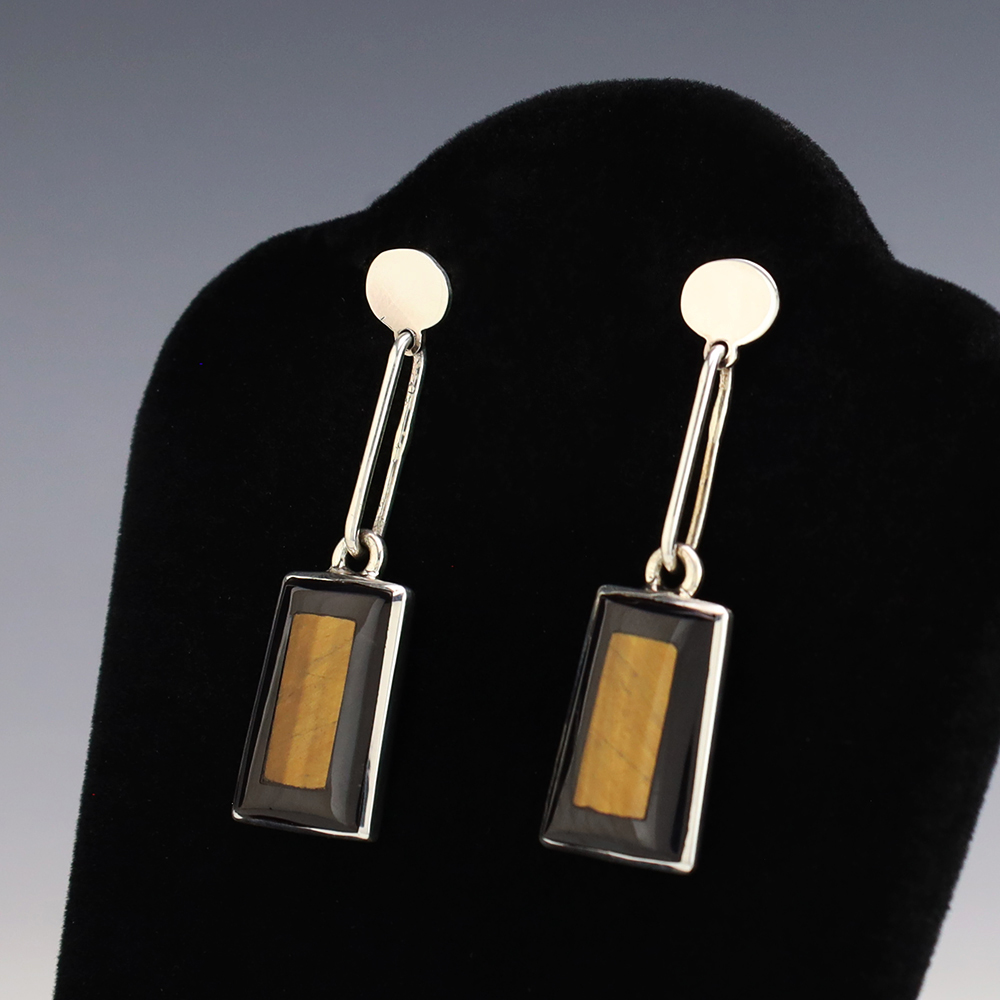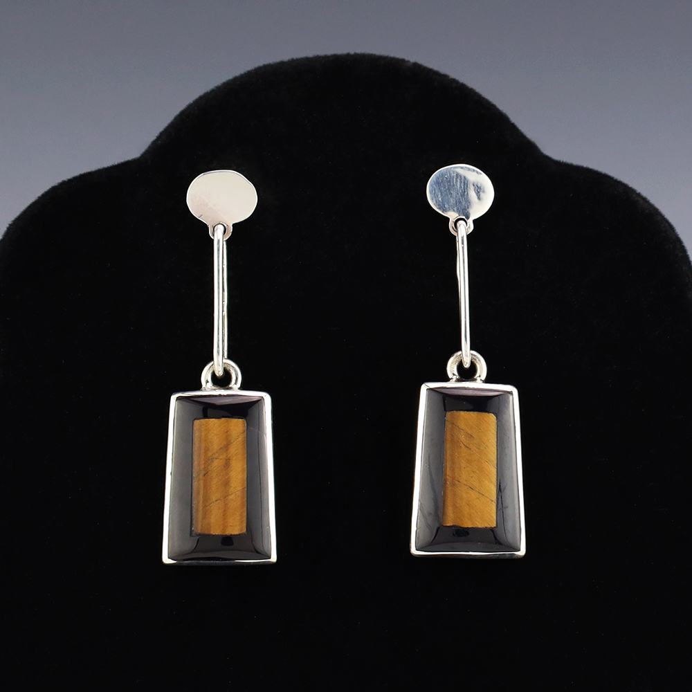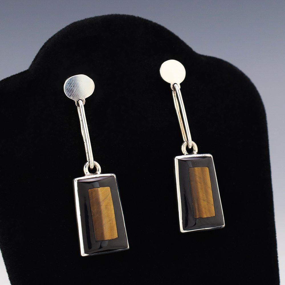 Zuni artist Harlan Coonsis hand made these stunning earrings. Made out of sterling silver and inlaid with Tiger’s Eye and Jet. Weighs 12 grams. Signed