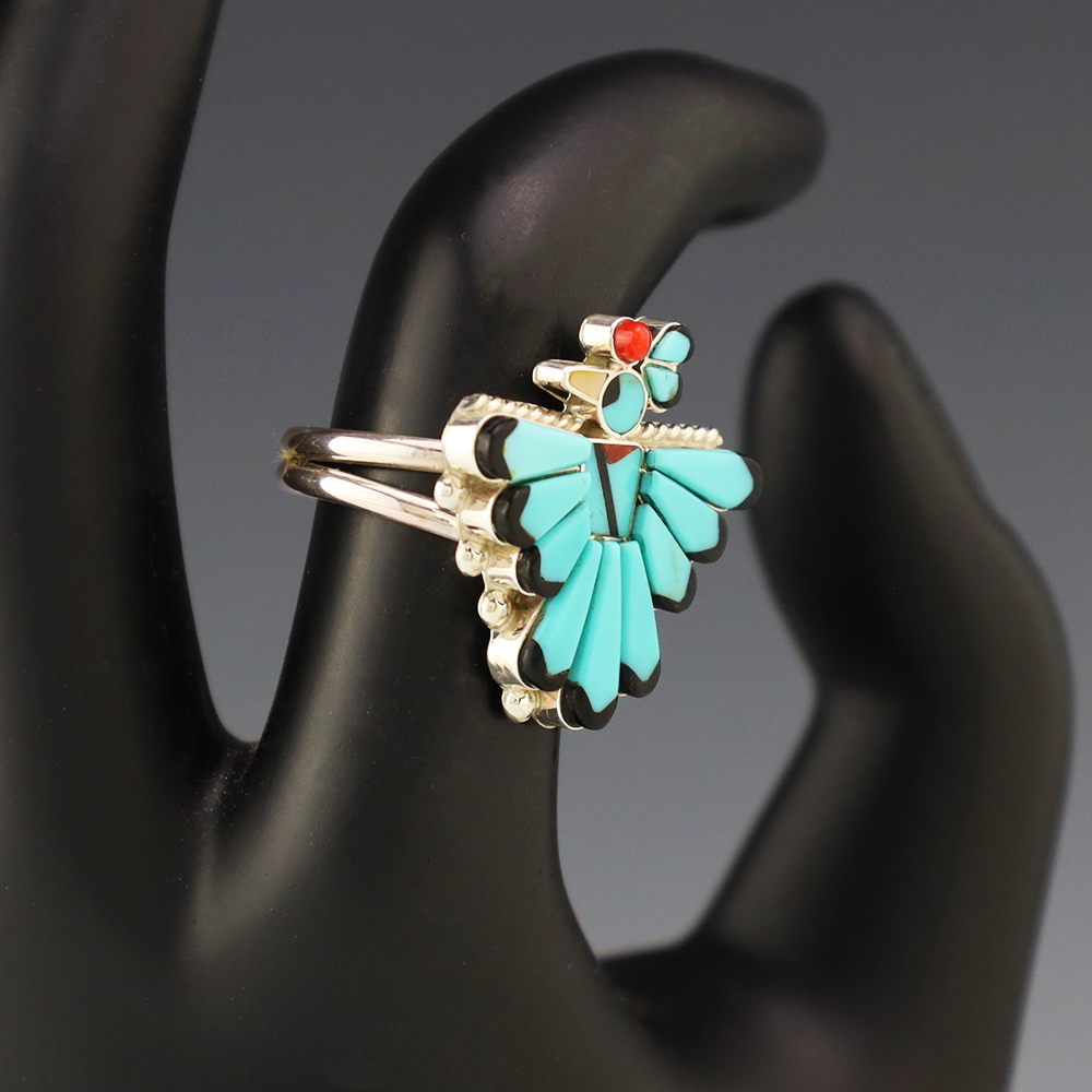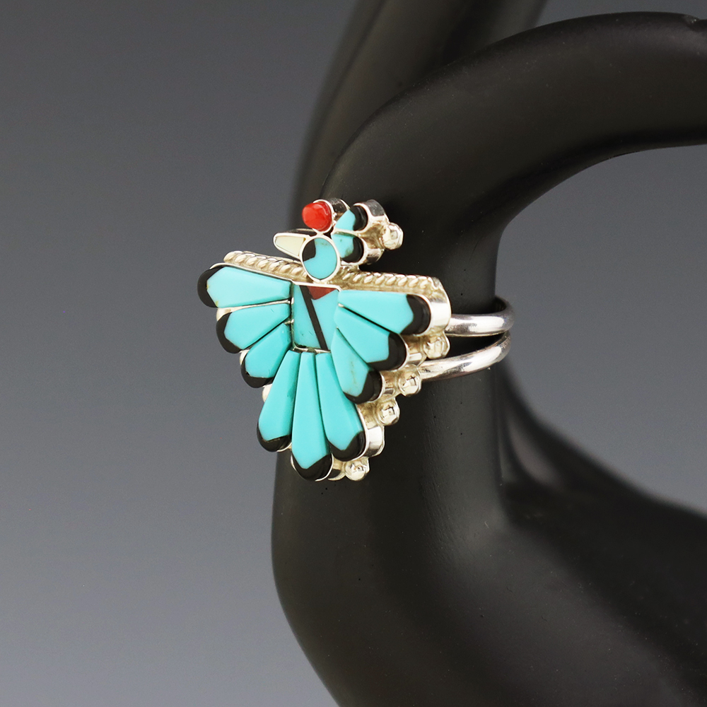 Zuni artist Michelle Peina made this beautiful Thunderbird ring. Zuni artists are known for their fine lapidary skills. Each stone is hand cut, polished, and set into a sterling silver setting. The ring is inlaid with Turquoise, Coral, Mother of Pearl Shell, and Jet. Weighs 6 grams. Size 7. Signed