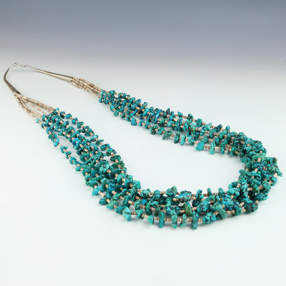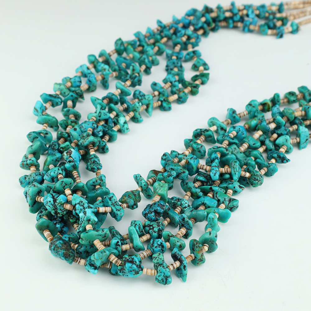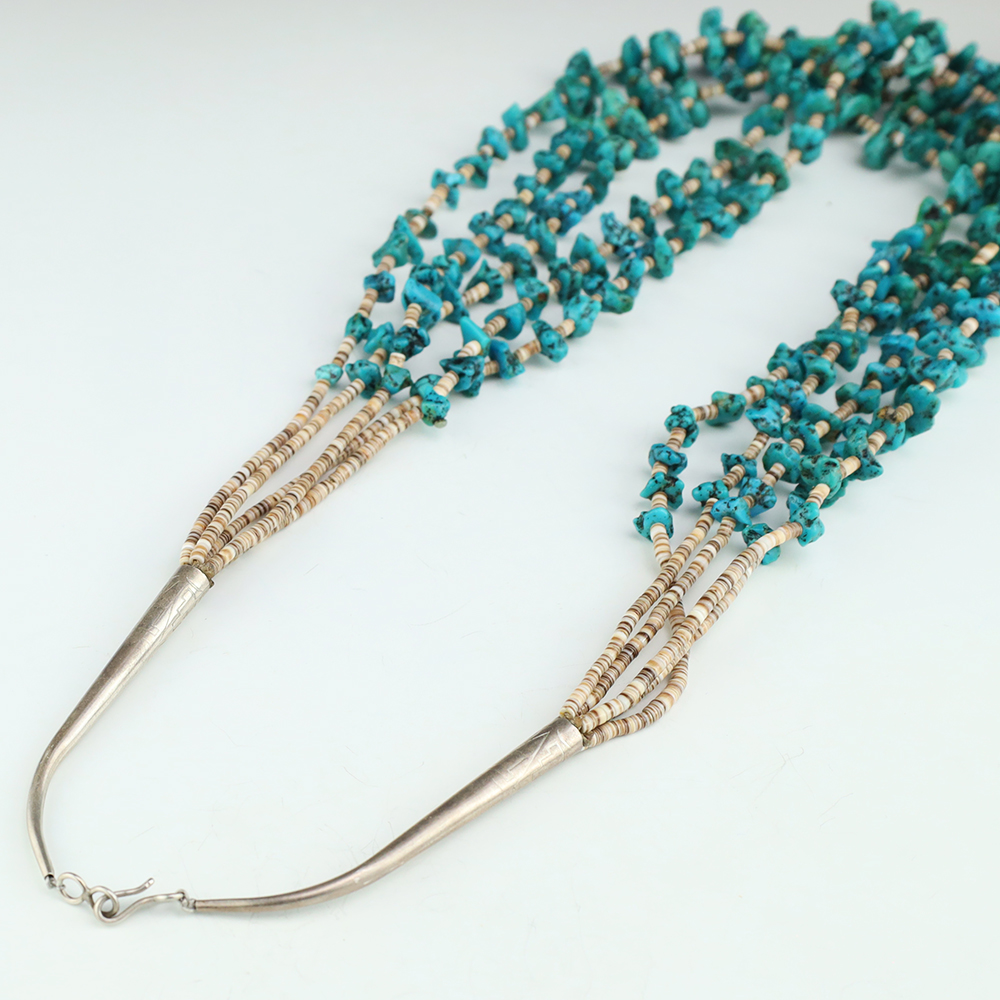 Amazing color combination! This five strand vintage necklace is a lovely statement piece. The necklace showcases Shell and Turquoise nuggets. The strands of heishi are finshed with sterling silver cones, and a hook and eye. Weighs 188 grams.