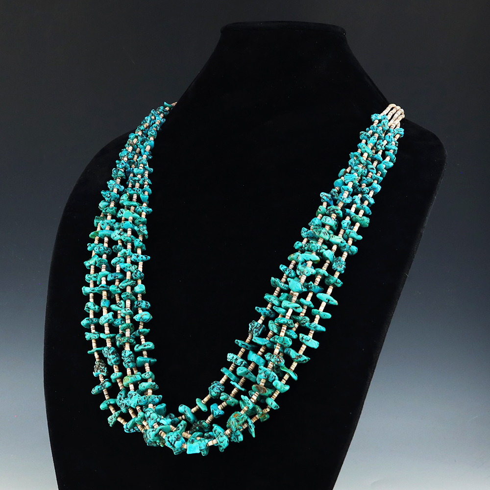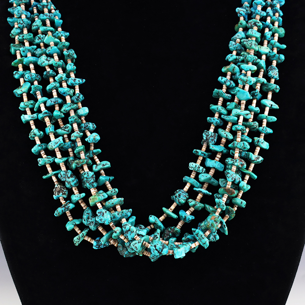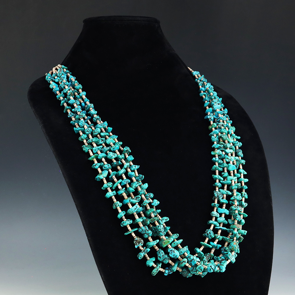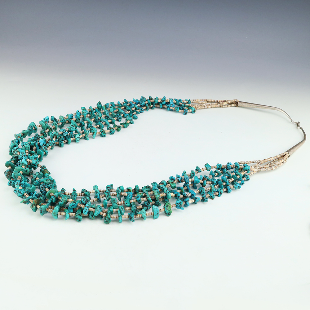 Amazing color combination! This five strand vintage necklace is a lovely statement piece. The necklace showcases Shell and Turquoise nuggets. The strands of heishi are finshed with sterling silver cones, and a hook and eye. Weighs 188 grams.