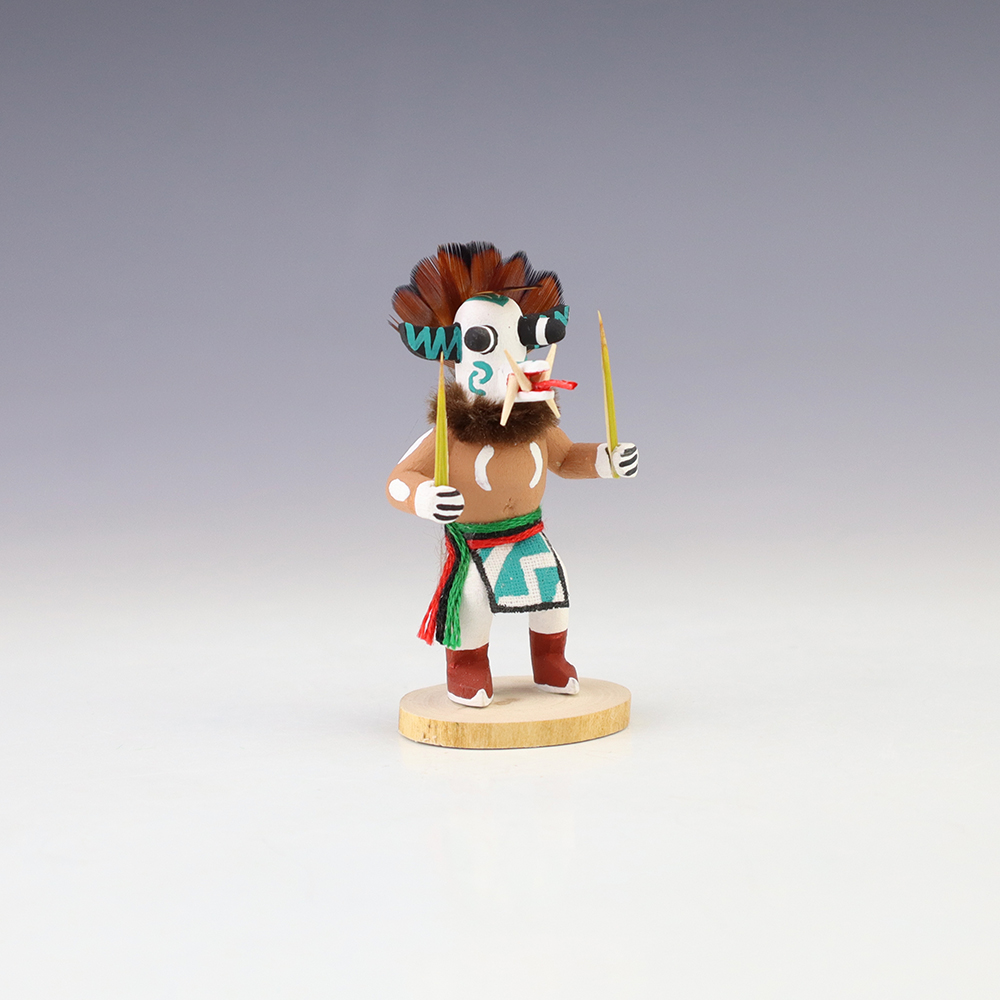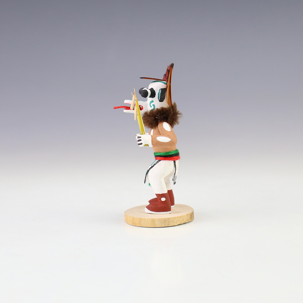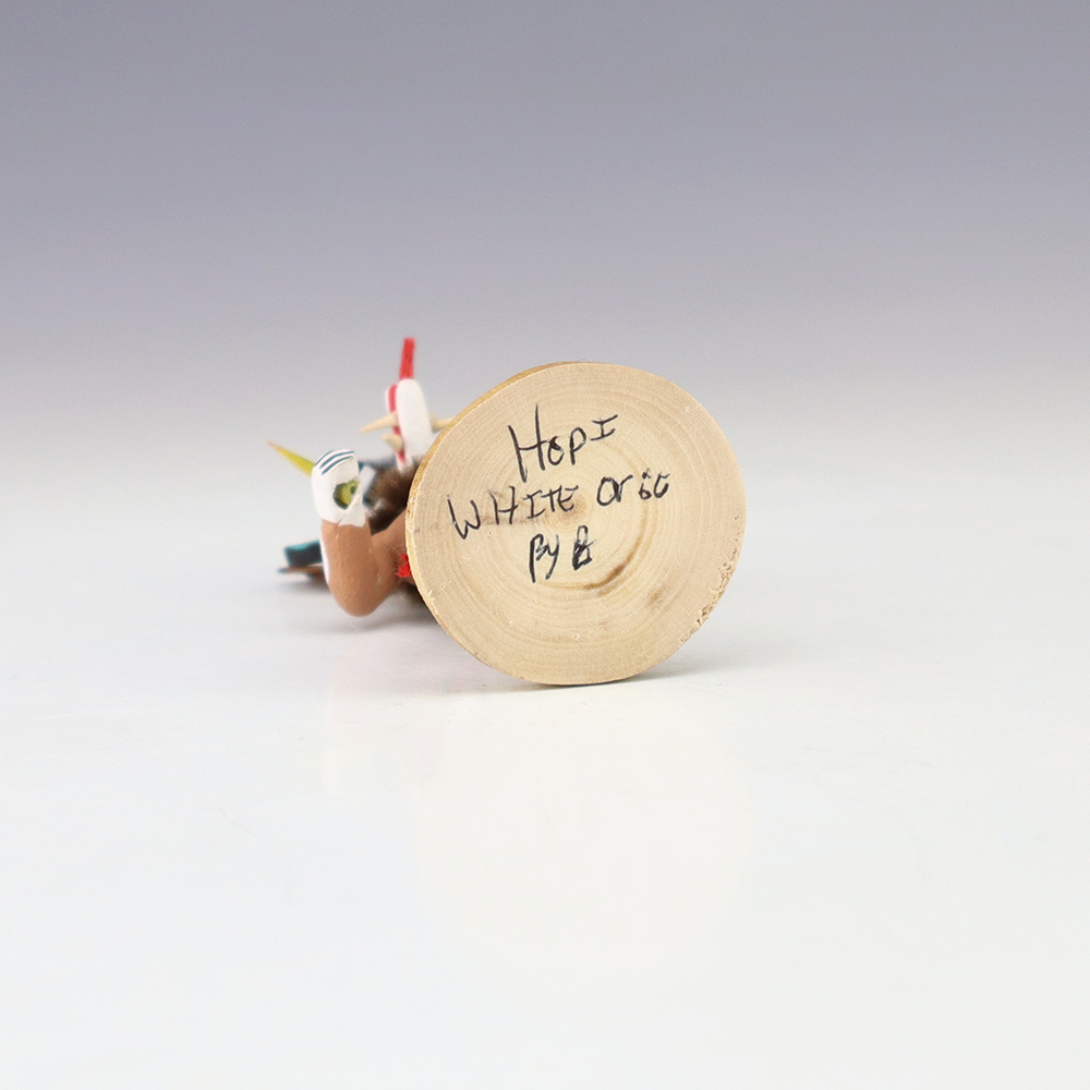 Hopi/Acoma artist Adrian Leon creates wonderful miniature kachinas, and this White Ogre Kachina is no exception. Delicately carved and painted, this marvelous carving would be a great addition to your kachina or Native American art collection. Signed