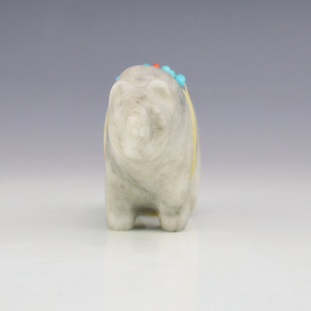 The Bear symbolizes healing and strength. Zuni artist Gabe Sice carved this stellar bear fetish. The carving is made out of Alabaster and is bundled with natural Sleeping Beauty Turquoise and Coral. A great addition to your Native American or Zuni fetish collection. Signed