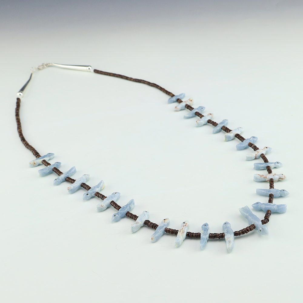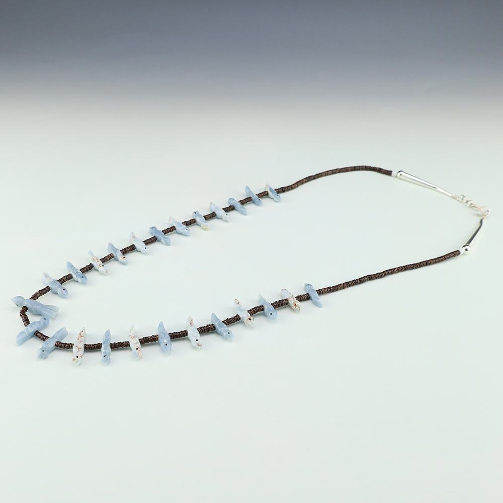 Zuni artists Nancy and Sheldon Westika created this exquisite fetish necklace. The birds are hand carved out of Angelite. There is fine Olive Shell in between the fetish and at the ends. This beautiful strand is finished off with a sterling silver clasp and cones. A statement piece that you will enjoy for many years. Weighs 38 grams. Signed