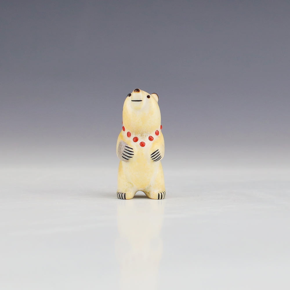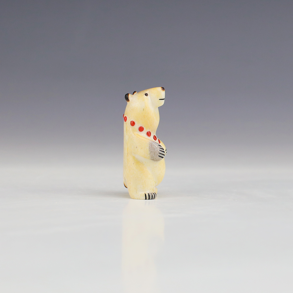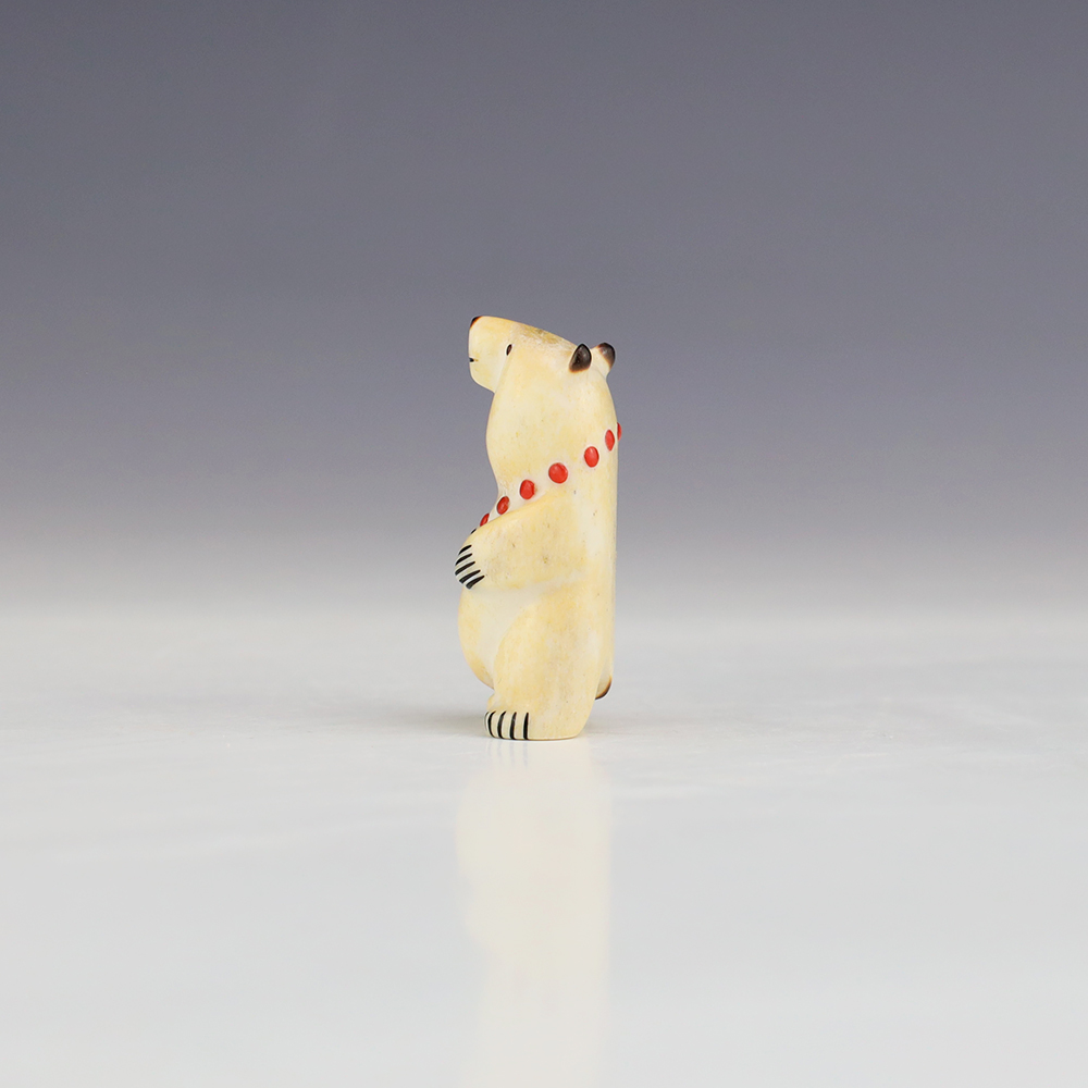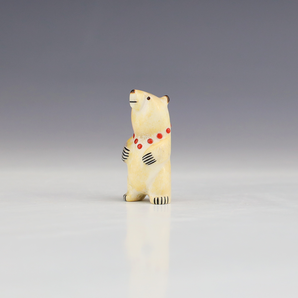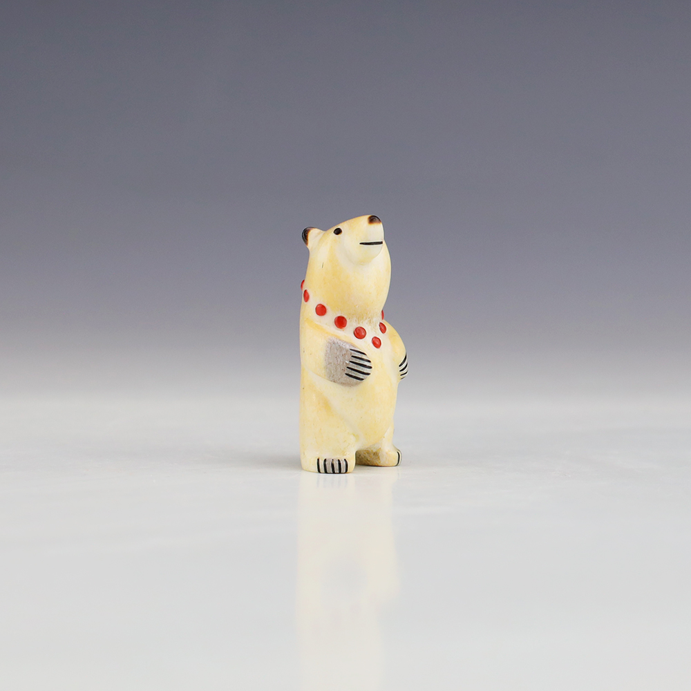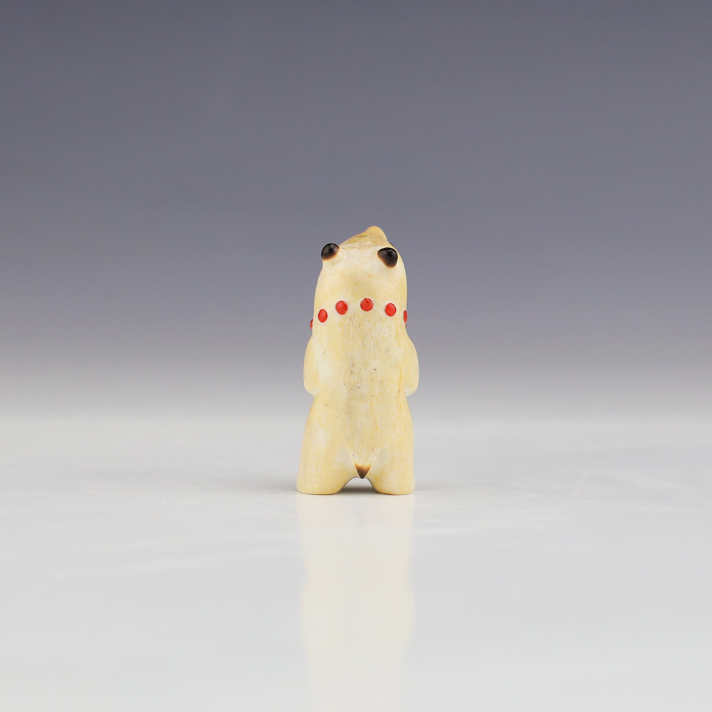 The Bear is the Guardian fetish of the West, and represents healing and strength. This wonderfully carved bear fetish is made out of Antler and inlaid with natural Coral. Zuni artist Gabe Sice is known for this outstanding bears. This carving would make a great addition to your Native American art or Zuni fetish collection. Signed
